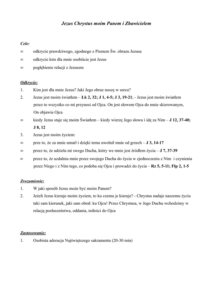 Jezus Chrystus moim Panem i Zbawicielem Cele: • odkrycie prawdziwego, zgodnego z Pismem Św. obrazu Jezusa • odkrycie kim dla mnie osobiście jest Jezus • pogłębienie relacji z Jezusem Odkrycie: 1. Kim jest dla mnie Jezus? Jaki Jego obraz noszę w sercu? 2. Jezus jest moim światłem – Łk 2, 32; J 1, 4-5; J 3, 19-21; - Jezus jest moim światłem przez to wszystko co mi przynosi od Ojca. On jest słowem Ojca do mnie skierowanym, On objawia Ojca • kiedy Jezus staje się moim Światłem – kiedy wierzę Jego słowu i idę za Nim – J 12, 37-40; J 8, 12 3. Jezus jest moim życiem: • prze to, że za mnie umarł i dzięki temu uwolnił mnie od grzech – J 3, 14-17 • przez to, że udziela mi swego Ducha, który we mnie jest źródłem życia – J 7, 37-39 • przez to, że uzdalnia mnie przez swojego Ducha do życia w zjednoczeniu z Nim i czynienia przez Niego i z Nim tego, co podoba się Ojcu i prowadzi do życia – Rz 5, 5-11; Flp 2, 1-5 Zrozumienie: 1. W jaki sposób Jezus może być moim Panem? 2. Jeżeli Jezus kieruje moim życiem, to ku czemu je kieruje? - Chrystus nadaje naszemu życiu taki sam kierunek, jaki sam obrał: ku Ojcu! Przez Chrystusa, w Jego Duchu wchodzimy w relację posłuszeństwa, oddania, miłości do Ojca Zastosowanie: 1. Osobista adoracja Najświętszego sakramentu (20-30 min)