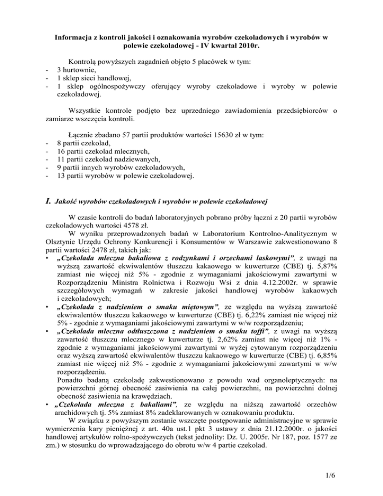 Informacja z kontroli jakości i oznakowania wyrobów czekoladowych i wyrobów w polewie czekoladowej - IV kwartał 2010r. - Kontrolą powyższych zagadnień objęto 5 placówek w tym: 3 hurtownie, 1 sklep sieci handlowej, 1 sklep ogólnospożywczy oferujący wyroby czekoladowe i wyroby w polewie czekoladowej. Wszystkie kontrole podjęto bez uprzedniego zawiadomienia przedsiębiorców o zamiarze wszczęcia kontroli. - Łącznie zbadano 57 partii produktów wartości 15630 zł w tym: 8 partii czekolad, 16 partii czekolad mlecznych, 11 partii czekolad nadziewanych, 9 partii innych wyrobów czekoladowych, 13 partii wyrobów w polewie czekoladowej. I. Jakość wyrobów czekoladowych i wyrobów w polewie czekoladowej W czasie kontroli do badań laboratoryjnych pobrano próby łączni z 20 partii wyrobów czekoladowych wartości 4578 zł. W wyniku przeprowadzonych badań w Laboratorium Kontrolno-Analitycznym w Olsztynie Urzędu Ochrony Konkurencji i Konsumentów w Warszawie zakwestionowano 8 partii wartości 2478 zł, takich jak: • „Czekolada mleczna bakaliowa z rodzynkami i orzechami laskowymi”, z uwagi na wyższą zawartość ekwiwalentów tłuszczu kakaowego w kuwerturze (CBE) tj. 5,87% zamiast nie więcej niż 5% - zgodnie z wymaganiami jakościowymi zawartymi w Rozporządzeniu Ministra Rolnictwa i Rozwoju Wsi z dnia 4.12.2002r. w sprawie szczegółowych wymagań w zakresie jakości handlowej wyrobów kakaowych i czekoladowych; • „Czekolada z nadzieniem o smaku miętowym”, ze względu na wyższą zawartość ekwiwalentów tłuszczu kakaowego w kuwerturze (CBE) tj. 6,22% zamiast nie więcej niż 5% - zgodnie z wymaganiami jakościowymi zawartymi w w/w rozporządzeniu; • „Czekolada mleczna odtłuszczona z nadzieniem o smaku toffi”, z uwagi na wyższą zawartość tłuszczu mlecznego w kuwerturze tj. 2,62% zamiast nie więcej niż 1% zgodnie z wymaganiami jakościowymi zawartymi w wyżej cytowanym rozporządzeniu oraz wyższą zawartość ekwiwalentów tłuszczu kakaowego w kuwerturze (CBE) tj. 6,85% zamiast nie więcej niż 5% - zgodnie z wymaganiami jakościowymi zawartymi w w/w rozporządzeniu. Ponadto badaną czekoladę zakwestionowano z powodu wad organoleptycznych: na powierzchni górnej obecność zasiwienia na całej powierzchni, na powierzchni dolnej obecność zasiwienia na krawędziach. • „Czekolada mleczna z bakaliami”, ze względu na niższą zawartość orzechów arachidowych tj. 5% zamiast 8% zadeklarowanych w oznakowaniu produktu. W związku z powyższym zostanie wszczęte postępowanie administracyjne w sprawie wymierzenia kary pieniężnej z art. 40a ust.1 pkt 3 ustawy z dnia 21.12.2000r. o jakości handlowej artykułów rolno-spożywczych (tekst jednolity: Dz. U. 2005r. Nr 187, poz. 1577 ze zm.) w stosunku do wprowadzającego do obrotu w/w 4 partie czekolad. 1/6 Kontrolowany przedsiębiorca zaakceptował wyniki analiz laboratoryjnych w/w artykułów i zrezygnował z ponownych badań zabezpieczonych prób kontrolnych. Osoba odpowiedzialna podjęła decyzje o wycofaniu z obrotu pozostawionych prób kontrolnych o łącznej wartości 61 zł i zwrocie do producenta. Zakwestionowane partie towarów zostały wyprzedane do czasu otrzymania przez kontrolowanego wyników badań. • „Czekolada z nadzieniem truskawkowym”, z uwagi na wyższą zawartość ekwiwalentów tłuszczu kakaowego (CBE) tj. 5,55% zamiast nie więcej niż 5% - zgodnie z wymaganiami jakościowymi zawartymi w Rozporządzeniu Ministra Rolnictwa i Rozwoju Wsi z dnia 4.12.2002r. w sprawie szczegółowych wymagań w zakresie jakości handlowej wyrobów kakaowych i czekoladowych; • „Czekolada z nadzieniem o smaku śmietankowym” , ze względu na wyższą zawartość ekwiwalentów tłuszczu kakaowego (CBE) tj. 5,96% zamiast nie więcej niż 5%-zgodnie z wymaganiami jakościowymi zawartymi w w/w rozporządzeniu oraz niższą zawartość nadzienia tj. 31% zamiast 50% zadeklarowanych w oznakowaniu wyrobu. W związku z powyższym zostanie wszczęte postępowanie administracyjne w sprawie wymierzenia kary pieniężnej z art. 40a ust.1 pkt 3 ustawy z dnia 21.12.2000r. o jakości handlowej artykułów rolno-spożywczych (tekst jednolity: Dz. U. 2005r. Nr 187, poz. 1577 ze zm.) w stosunku do wprowadzającego do obrotu w/w 2 partie czekolad. Kontrolowany przedsiębiorca zaakceptował wyniki analiz laboratoryjnych w/w artykułów i zrezygnował z ponownych badań zabezpieczonych prób kontrolnych. Osoba odpowiedzialna podjęła decyzję o obniżeniu ceny o 50% łącznie 84 sztuk kwestionowanych czekolad (próby kontrolne i czekolady znajdujące się w sprzedaży) wartości 96 zł. „Czekolada z nadzieniem truskawkowym” została przeceniona z 2,61zł/szt. na 1,3 zł/szt., „Czekolada z nadzieniem o smaku śmietankowym” ze 1,37 zł/szt. na 0,69 zł/szt. • „Czekolada mleczna z nadzieniem o smaku truskawkowym”, z uwagi na wyższą zawartość ekwiwalentów tłuszczu kakaowego (CBE) tj.,70% zamiast nie więcej niż 5% zgodnie z wymaganiami jakościowymi zawartymi w w/w rozporządzeniu oraz niższą zawartość nadzienia tj. 47%, 44% zamiast 50% zadeklarowanych w oznakowaniu produktu; • „Czekolada mleczna (…), ze względu na wyższą zawartość ekwiwalentów tłuszczu kakaowego (CBE) tj. 5,94% zamiast nie więcej niż 5% - zgodnie z wymaganiami jakościowymi zawartymi w w/w rozporządzeniu oraz z powodu wad organoleptycznych: barwa: nierównomierna, jasne plamy na powierzchni czekolady białej; konsystencjagładkość: czekolada szorstka, wyczuwalna piaszczystość; smak: mało charakterystyczny, lekko kwaśny; zapach: słabo charakterystyczny. Wprowadzający do obrotu nie zaakceptował wyników badań w/w czekolad i podjął decyzję o ponownym badaniu prób kontrolnych. Analizy zostały przeprowadzone w niezależnym akredytowanym Laboratorium S.J. Hamilton Poland LTD Sp. z o.o. w Gdyni, ul. Świętojańska 134 i potwierdziły zawyżoną zawartość ekwiwalentów tłuszczu kakaowego (