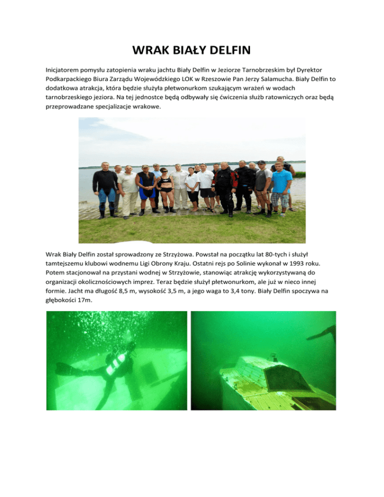 WRAK BIAŁY DELFIN Inicjatorem pomysłu zatopienia wraku jachtu Biały Delfin w Jeziorze Tarnobrzeskim był Dyrektor Podkarpackiego Biura Zarządu Wojewódzkiego LOK w Rzeszowie Pan Jerzy Salamucha. Biały Delfin to dodatkowa atrakcja, która będzie służyła płetwonurkom szukającym wrażeń w wodach tarnobrzeskiego jeziora. Na tej jednostce będą odbywały się ćwiczenia służb ratowniczych oraz będą przeprowadzane specjalizacje wrakowe. Wrak Biały Delfin został sprowadzony ze Strzyżowa. Powstał na początku lat 80-tych i służył tamtejszemu klubowi wodnemu Ligi Obrony Kraju. Ostatni rejs po Solinie wykonał w 1993 roku. Potem stacjonował na przystani wodnej w Strzyżowie, stanowiąc atrakcję wykorzystywaną do organizacji okolicznościowych imprez. Teraz będzie służył płetwonurkom, ale już w nieco innej formie. Jacht ma długość 8,5 m, wysokość 3,5 m, a jego waga to 3,4 tony. Biały Delfin spoczywa na głębokości 17m. Przygotowanie wraku do zatopienia trwało kilka tygodni. Został one wyczyszczony, zakonserwowany i pomalowany. Wzmocniliśmy również jego konstrukcję nośną, przeprowadzono rekonstrukcję poszycia i odpowiednio przygotowano go do zatopienia, a także zamocowano wcześniej przygotowane zbiorniki wypornościowe. Akcję zatopienia wraku przygotował, zaplanował oraz przeprowadził Pan Mirosław Kowalczyk (Kierownik Bazy LOK Machów nad Jez. Tarnobrzeskim). W akcji przygotowania oraz zatopienia uczestniczyli płetwonurkowie Klubów Ligi Obrony Kraju : „OCTOPUS” w Tarnobrzegu, „FROGMEN” oraz „BARAKUDA” w Stalowej Woli, płetwonurkowie OSP ze Stalowej Woli oraz płetwonurkowie Batalionu Saperów z Niska 21. Brygada Strzelców Podhalańskich. Mamy nadzieję, że na tym nie poprzestaniemy i atrakcji dla płetwonurków będzie przybywać. Relacja foto oraz wideo z zatopienia wraku Biały Delfin Fotografia: Piotr Pawlik, Henryk Płaza. www.lok-octopus.pl