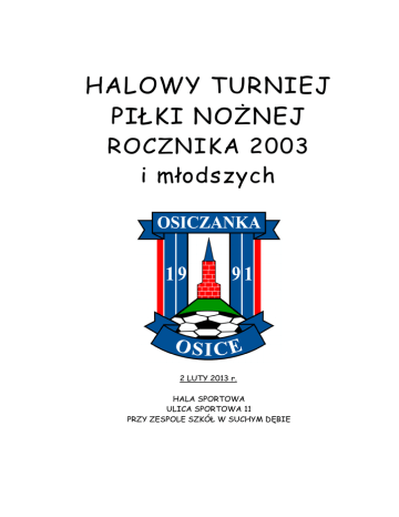 HALOWY TURNIEJ PIŁKI NOŻNEJ ROCZNIKA 2003 i młodszych 2 LUTY 2013 r. HALA SPORTOWA ULICA SPORTOWA 11 PRZY ZESPOLE SZKÓŁ W SUCHYM DĘBIE REGULAMIN TURNIEJU 1. Termin i miejsce Turniej odbędzie się 2 luty 2013 roku w ZS w SUCHY DĘBIE 2. Cel rozgrywek Popularyzacja piłki nożnej wśród dzieci i młodzieży, rywalizacja w duchu „fair-play”, zorganizowanie czasu wolnego, promocja gminy, szkoły oraz klubu, podnoszenie umiejętności poprzez rywalizację sportową. 3. Organizator Klub Sportowy Osiczanka Osice 4. Patroni i sponsorzy turnieju Wójt gminy Suchy Dąb- Barbara Kamińska Dyrektor ZS w Suchym Dębie- Aleksandra Lewandowska 3. Uczestnicy W rozgrywkach udział biorą chłopcy z rocznika 2003 i młodsi, posiadający ważne badania lekarskie, dokument tożsamości (niezbędny do weryfikacji, którą można przeprowadzić w każdej chwili trwania turnieju). Zespół w którym będzie występował zawodnik z rocznika starszego zostanie automatycznie zdyskwalifikowany. 4. System rozgrywek Zespoły zostały podzielone na 2 grupy po pięc zespołów, w których rozgrywają mecze systemem „każdy z każdym”. Po zakończeniu fazy grupowej zespoły zajmujące odpowiednio 1,2 miejsce zagrają w meczach półfinałowych o miejsca I IV a zespoły zajmujące odpowiednio 3,4i5 miejsce zagrają w meczach o miejsca V - X. 5. Czas gry Mecze w grupach trwają 12 minut bez przerwy. W przypadku remisu w grach półfinałowych nastąpi seria rzutów karnych (po TRZY) w celu wyłonienia zwycięzcy. Rzuty karne wykonywane są z odległości 7 metrów. 6. Przepisy gry - boisko 28 x 18 m - bramki 3 x 2 m, - piłka nożna - rozmiar nr 4 - zespoły składają się z bramkarza + czterech zawodników w polu gry oraz 5 rezerwowych - w przypadku gdy piłka opuści pole, zawodnicy wprowadzają piłkę wyłącznie po ziemi z linii bocznej - aut bramkowy wprowadzany przez bramkarza ręką – całe boisko, tak samo z akcji - odległość 5 metrów od piłki przy wykonywaniu stałych fragmentów gry - dotknięcie piłki konstrukcji sufitowej – aut z linii bocznej boiska (patrz wyżej) - bramkarz nie może złapać piłki rękoma po zagraniu nogą zawodnika z własnej drużyny (sankcja - rzut wolny pośredni z linii pola karnego) 2 - rozpoczęcie gry ze środka jako rzut wolny pośredni - gra „wślizgiem” zabroniona - obowiązują kary minutowe – zgodnie z interpretacją sędziego - wybitnie nie sportowe zachowanie – kara meczu - zespół gra w osłabieniu do końca kary lub utraty bramki - pozostałe przepisy wg regulaminu PZPN - zawodnicy podczas trwania turnieju występują z tymi samymi numerami na koszulce - o kolejności w tabeli decydują: - liczba zdobytych punktów - bezpośredni pojedynek - lepszy stosunek bramek - większa liczba zdobytych bramek - mniejsza liczba straconych bramek - mała tabela pomiędzy zainteresowanymi drużynami - losowanie 7. Sędziowie i opieka medyczna Obsługę medyczną i sędziowską zapewniają organizatorzy. 8. Uwagi końcowe Zespoły uczestniczące w zawodach ubezpieczają się na okres zawodów w własnym zakresie. Organizator nie odpowiada za rzeczy zgubione lub skradzione. 3 HARMONOGRAM TURNIEJU HALOWEJ PIŁKI NOŻNEJ - (rocz. 2003) Suchy Dąb dnia 2 luty 2013 r. Nr meczu Godzina 1 0900 – 0912 2 3 4 5 6 7 8 9 10 11 12 13 14 15 16 17 18 19 20 Nazwa drużyn Grupa Wynik A1 – A2 OSICZANKA I SPARTA 13 25 B1 – B2 OSICZANKA II ORZEŁ 26 38 A3 – A4 GEDANIA I CZARNI 39 51 B3 – B4 GEDANIA II HURAGAN 52 04 A1 – A5 OSICZANKA I WISEŁKA 05 17 B1 – B5 OSICZANKA II UNITED 18 30 A2 – A3 SPARTA GEDANIA I 31 43 B2 – B3 ORZEŁ GEDANIA II 44 56 A4 – A5 CZARNI WISEŁKA 57 09 B4 – B5 HURAGAN UNITED 10 22 A1 – A3 OSICZANKA I GEDANIA I 23 35 B1 – B3 OSICZANKA II GEDANIA II 36 48 A2 – A4 SPARTA CZARNI 49 01 B2 – B4 ORZEŁ HURAGAN 02 14 A3 – A5 GEDANIA I WISEŁKA 15 27 B3 – B5 GEDANIA II UNITED 28 40 A1 – A4 OSICZANKA I CZARNI 41 53 B1 – B4 OSICZANKA II HURAGAN 54 06 A2 – A5 SPARTA WISEŁKA 07 19 B2 – B5 ORZEŁ 09 – 09 09 – 09 09 – 09 09 – 10 10 – 10 10 – 10 10 – 10 10 – 10 10 – 11 11 – 11 11 – 11 11 – 11 11 – 12 12 – 12 12 – 12 12 – 12 12 – 12 12 – 13 13 – 13 UNITED Mecz o miejsce IX /Drużyny które zajęły miejsca „V m. gr. A i V m. gr. B”/ 13 1330 – 1342 Pierwszy Półfinał /Drużyny które zajęły miejsca „I m. gr. A i II m. gr. B”/ 14 1343 – 1355 Drugi Półfinał /Drużyny które zajęły miejsca „II m. gr. A i I m. gr. B”/ 15 1356 – 1408 Mecz o miejsce VII /Drużyny które zajęły miejsca „IV m. gr. A i IV m. gr. B”/ 16 1409 – 1421 Mecz o miejsce VII /Drużyny które zajęły miejsca „III m. gr. A i III m . gr. B”/ 18 1422 – 1434 Mecz o miejsce III /Drużyny które przegrały półfinał / 19 1435 – 1447 Mecz o miejsce I – FINAŁ /Drużyny które wygrały półfinał/ 20 1448– 1500