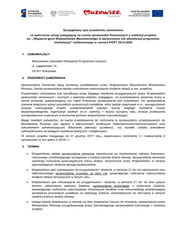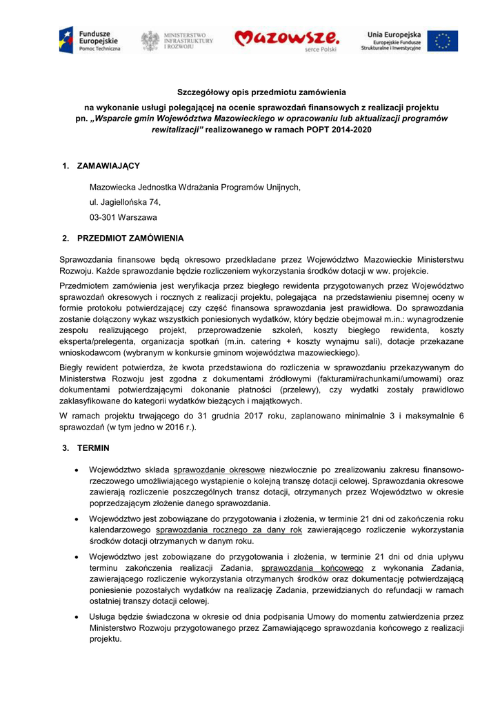 Szczegółowy opis przedmiotu zamówienia na wykonanie usługi polegającej na ocenie sprawozdań finansowych z realizacji projektu pn. „Wsparcie gmin Województwa Mazowieckiego w opracowaniu lub aktualizacji programów rewitalizacji” realizowanego w ramach POPT 2014-2020 1. ZAMAWIAJĄCY Mazowiecka Jednostka Wdrażania Programów Unijnych, ul. Jagiellońska 74, 03-301 Warszawa 2. PRZEDMIOT ZAMÓWIENIA Sprawozdania finansowe będą okresowo przedkładane przez Województwo Mazowieckie Ministerstwu Rozwoju. Każde sprawozdanie będzie rozliczeniem wykorzystania środków dotacji w ww. projekcie. Przedmiotem zamówienia jest weryfikacja przez biegłego rewidenta przygotowanych przez Województwo sprawozdań okresowych i rocznych z realizacji projektu, polegająca na przedstawieniu pisemnej oceny w formie protokołu potwierdzającej czy część finansowa sprawozdania jest prawidłowa. Do sprawozdania zostanie dołączony wykaz wszystkich poniesionych wydatków, który będzie obejmował m.in.: wynagrodzenie zespołu realizującego projekt, przeprowadzenie szkoleń, koszty biegłego rewidenta, koszty eksperta/prelegenta, organizacja spotkań (m.in. catering + koszty wynajmu sali), dotacje przekazane wnioskodawcom (wybranym w konkursie gminom województwa mazowieckiego). Biegły rewident potwierdza, że kwota przedstawiona do rozliczenia w sprawozdaniu przekazywanym do Ministerstwa Rozwoju jest zgodna z dokumentami źródłowymi (fakturami/rachunkami/umowami) oraz dokumentami potwierdzającymi dokonanie płatności (przelewy), czy wydatki zostały prawidłowo zaklasyfikowane do kategorii wydatków bieżących i majątkowych. W ramach projektu trwającego do 31 grudnia 2017 roku, zaplanowano minimalnie 3 i maksymalnie 6 sprawozdań (w tym jedno w 2016 r.). 3. TERMIN Województwo składa sprawozdanie okresowe niezwłocznie po zrealizowaniu zakresu finansoworzeczowego umożliwiającego wystąpienie o kolejną transzę dotacji celowej. Sprawozdania okresowe zawierają rozliczenie poszczególnych transz dotacji, otrzymanych przez Województwo w okresie poprzedzającym złożenie danego sprawozdania. Województwo jest zobowiązane do przygotowania i złożenia, w terminie 21 dni od zakończenia roku kalendarzowego sprawozdania rocznego za dany rok zawierającego rozliczenie wykorzystania środków dotacji otrzymanych w danym roku. Województwo jest zobowiązane do przygotowania i złożenia, w terminie 21 dni od dnia upływu terminu zakończenia realizacji Zadania, sprawozdania końcowego z wykonania Zadania, zawierającego rozliczenie wykorzystania otrzymanych środków oraz dokumentację potwierdzającą poniesienie pozostałych wydatków na realizację Zadania, przewidzianych do refundacji w ramach ostatniej transzy dotacji celowej. Usługa będzie świadczona w okresie od dnia podpisania Umowy do momentu zatwierdzenia przez Ministerstwo Rozwoju przygotowanego przez Zamawiającego sprawozdania końcowego z realizacji projektu. Terminy realizacji badań będą uzgadniane w kontaktach roboczych, jednakże termin ich przeprowadzenia nie może przekroczyć 14 dni od dnia otrzymania informacji. Wykonawca będzie poinformowany o konieczności sporządzenia sprawozdania z odpowiednim wyprzedzeniem. W przypadku konieczności uzupełnienia sprawozdania przez Zamawiającego na wniosek Ministerstwa Rozwoju lub niezatwierdzenia sprawozdania przez Ministerstwo Rozwoju w zakresie prac zleconych Umową, Wykonawca jest zobowiązany do usunięcia nieprawidłowości, dokonania uzupełnień lub wykonania ponownego badania sprawozdania w terminie 7 dni od dnia zgłoszenia przez Zamawiającego. Za wykonaną usługę Wykonawcy nie przysługuje dodatkowe wynagrodzenie. Badanie sprawozdań rocznych będzie przeprowadzone w terminach umożliwiających sporządzenie przez Wykonawcę i przekazanie Zamawiającemu protokołów do dnia: o 15 stycznia 2017 r. - badanie sprawozdania rocznego za 2016 r., o 31 grudnia 2017 r. - badanie sprawozdania rocznego za 2017 r. 4. WARUNKI UDZIAŁU W PROCEDURZE UDZIELENIA ZAMÓWIENIA ORAZ SPOSÓB DOKONYWANIA OCENY ICH SPEŁNIENIA: O udzielenie zamówienia mogą ubiegać się Wykonawcy, którzy:: 1) są uprawnieni do badania sprawozdania finansowego, zgodnie z ustawą z dnia 7 maja 2009 r. o biegłych rewidentach i ich samorządzie, podmiotach uprawnionych do badania sprawozdań finansowych oraz o nadzorze publicznym (Dz.U. z 2009 r. Nr 77, poz. 649 z późn. zm.), 2) spełniają warunki do wyrażania bezstronnej i niezależnej opinii o części finansowej sprawozdania wymagane art. 56 ustawy o biegłych rewidentach wymienionej w ustawie o biegłych rewidentach. Każdy wykonawca może złożyć tylko jedną ofertę. Ocena spełnienia warunków udziału w procedurze nastąpi na podstawie złożonych przez Wykonawcę dokumentów. 5. KRYTERIUM WYBORU OFERTY Przy wyborze najkorzystniejszej oferty Zamawiający będzie kierował się następującym kryterium: 100% cena, 6. ZAWARTOŚĆ OFERTY I PRZESŁANKI ODRZUCENIA OFERTY Oferta biegłego rewidenta powinna zawierać w szczególności: Informację o biegłym rewidencie, w tym o formie prowadzenia działalności, wpisie do rejestru biegłych rewidentów z podaniem numeru i daty wpisu, wpisie na listę podmiotów uprawnionych do badań sprawozdań finansowych z podaniem numeru i daty wpisu, o liczbie zatrudnionych biegłych rewidentów wraz z kopią wpisu na listę podmiotów uprawnionych do badania sprawozdań finansowych Cenę za wykonanie badania sprawozdania finansowego wraz z protokołem z badania sprawozdania – ofertę należy złożyć na wzorze, stanowiącym załącznik nr 1. Oświadczenie oferenta o braku powiązań z zamawiającym – załącznik nr 2. Zamawiający zastrzega sobie prawo do wyboru oferty, odstąpienia od wyboru oferty lub zakończenia przed terminem postępowania konkursowego bez podania przyczyny. Do zapytania ofertowego nie stosuje się ustawy Prawo zamówień publicznych. Zamawiający odrzuci ofertę (z zastrzeże