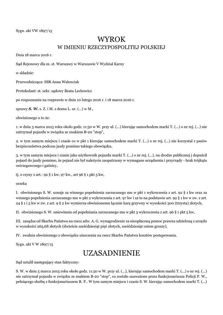 Sygn. akt VW 1897/15 WYROK W IMIENIU RZECZYPOSPOLITEJ POLSKIEJ Dnia 18 marca 2016 r. Sąd Rejonowy dla m. st. Warszawy w Warszawie V Wydział Karny w składzie: Przewodnicząca: SSR Anna Walenciak Protokolant: st. sekr. sądowy Beata Lechowicz po rozpoznaniu na rozprawie w dniu 10 lutego 2016 r. i 18 marca 2016 r. sprawy S. W. s. Z. i M. z domu L. ur. (...) w M., obwinionego o to że: 1. w dniu 5 marca 2015 roku około godz. 11:50 w W. przy ul. (...) kierując samochodem marki T. (...) o nr rej. (...) nie zatrzymał pojazdu w związku ze znakiem B-20 "stop", 2. w tym samym miejscu i czasie co w pkt 1 kierując samochodem marki T. (...) o nr rej. (...) nie korzystał z pasów bezpieczeństwa podczas jazdy pomimo takiego obowiązku, 3. w tym samym miejscu i czasie jako użytkownik pojazdu marki T. (...) o nr rej. (...), na drodze publicznej j dopuścił pojazd do jazdy pomimo, że pojazd nie był należycie zaopatrzony w wymagane urządzenia i przyrządy - brak trójkąta ostrzegawczego i gaśnicy, tj. o czyny z art.: 92 § 1 kw, 97 kw., art 96 § 1 pkt 5 kw, orzeka I. obwinionego S. W. uznaje za winnego popełnienia zarzucanego mu w pkt 1 wykroczenia z art. 92 § 1 kw oraz za winnego popełnienia zarzucanego mu w pkt 2 wykroczenia z art. 97 kw i za to na podstawie art. 92 § 1 kw w zw. z art. 24 § 1 i 3 kw w zw. z art. 9 § 2 kw wymierza obwinionemu łącznie karę grzywny w wysokości 300 (trzysta) złotych, II. obwinionego S. W. uniewinnia od popełniania zarzucanego mu w pkt 3 wykroczenia z art. 96 § 1 pkt 5 kw, III. zasądza od Skarbu Państwa na rzecz adw. A. G. wynagrodzenie za nieopłaconą pomoc prawna udzieloną z urzędu w wysokości 265,68 złotych (dwieście sześćdziesiąt pięć złotych, sześćdziesiąt osiem groszy), IV. zwalnia obwinionego z obowiązku uiszczenia na rzecz Skarbu Państwa kosztów postępowania. Sygn. akt V W 1897/15 UZASADNIENIE Sąd ustalił następujący stan faktyczny: S. W. w dniu 5 marca 2015 roku około godz. 11:50 w W. przy ul. (...), kierując samochodem marki T. (...) o nr rej. (...) nie zatrzymał pojazdu w związku ze znakiem B-20 "stop", co zostało zauważone przez funkcjonariusza Policji P. W., pełniącego służbę z funkcjonariuszem R. P.. W tym samym miejscu i czasie S. W. kierując samochodem marki T. (...) o nr rej. (...) nie korzystał z pasów bezpieczeństwa podczas jazdy pomimo takiego obowiązku, lecz zapięty pas miał za sobą, za plecami. S. W. dzierżawił pojazd T. (...), który użytkował od kilku miesięcy. Funkcjonariusz Policji polecił S. W., aby okazał wymagane wyposażenie w postaci trójkąta ostrzegawczego i gaśnicy. S. W. poinformował funkcjonariusza, że nie orientuje się gdzie w pojeździe znajdują się te urządzenia. Funkcjonariusze nie sprawdzili, czy pojazd był wyposażony w te urządzenia. Obwiniony w czasie prowadzenia pojazdu był trzeźwy. S. W. ma 49 lat. Jest żonaty, nie ma małoletnich dzieci na utrzymaniu. Z zawodu jest garmażerem, zarejestrowany jako bezrobotny, deklaruje, ze utrzymuje się z pomocy przyjaciół. Leczył się psychiatrycznie, ma zaburzenia osobowości, poczytalność w czasie czynów nie budzi wątpliwości, z uwagi na zaburzenia osobowości nie jest zdolny do samodzielnej i rozsądnej obrony, /opinia sądowo - psychiatryczna k. 48-49, e-protokół rozprawy z dnia 10.02.2015 r. wyjaśnienia obwinionego, k. 81 - 83/ Powyższy stan faktyczny Sąd ustalił na podstawie: wyjaśnień obwinionego S. W. k. 81 - 83, zeznań świadka: P. W. k. 83-84, zeznań świadka R. P. k. 88-89, n/u k. 1 -2, zlecenia badania k.3, zaświadczenia lekarskiego k.4, oświadczenia k.5, prawa jazdy k.6, zlecenie k. 7, 8, karty rejestracyjnej k.9, n/u k.ll, sprawozdania k.12, protokołu pobrania krwi k.13, pokwitowanie k.14-15, zlecenie badania k.27, opinii sądowo- psychiatrycznej k.48 -60. Obwiniony S. W. k. 81-83, k. 16-17 nie przyznał się do popełnienia zarzucanego mu czynu. Wyjaśnił, że na ul. (...) został zatrzymany przez patrol, który stwierdził, że nie zatrzymał się na zakazie „stop", obwiniony zakwestionował, by policjant mógł go widzieć. Wyjaśnił, że w momencie zatrzymania zaprzeczał, że się tam nie zatrzymał. Obwiniony wyjaśnił, że w czasie kontroli rozpiął pasy bezpieczeństwa. Wyjaśnił, że funkcjonariusz prosił żeby otworzył kufer, wskazał, że gaśnica była w aucie, samochód miał 3 miesiące, wyjaśnił, że nie wiedział gdzie była. Obwiniony wyjaśnił, że policjant poprosił żeby dmuchnął w alkomat, on zaś odmówił. Obwiniony wyjaśnił, że prosił o pobranie i zmierzenie alkoholu we krwi oraz że wskazał, że policja musi pilnować auta jak będzie na badaniu. Wyjaśnił, że zabrano mu prawo jazdy. Obwiniony wyjaśnił, że funkcjonariusz cały czas nalegał żeby przyjął mandat, że auto będzie zholowane, punkty karne zostaną mu nałożone. Obwiniony wskazał, że poinformował, że jego auto nie będzie sholowanej bo drugi samochód będzie pilnował auta jak on pojedzie na badanie. Obwiniony wskazał, ze Policja „czepiała się" do wszystkiego co było możliwe. Obwiniony wyjaśnił, że o pasach rozmowa zaczęła się po 3 minutach oraz że dopiero w czasie trwania rozmowy rozpiął pasy, gdy sięgnął do schowka po dokumenty. Obwiniony wyjaśnił, że nawet nie wiedział gdzie jest trójkąt po otworzeniu kufra oraz że powiedział, że to jest nowe auto i że nie wiem gdzie dokładnie co leży, wyjaśnił, że auto to było z T. (...) użytkowane na podstawie umowy z dzierżawy przez korporację oraz że je dzierżawił od 1 lipca 2014 na rok. Sąd zważył, co następuje: Sąd uznał wyjaśnienia obwinionego w zakresie, w jakim obwiniony nie przyznał się do popełnienia zarzucanych mu w pkt 1 i 2 wniosku o ukaranie, za niewiarygodne, jako sprzeczne z całym wiarygodnym zebranym w sprawie materiałem dowodowym, w szczególności z zeznaniami naocznego świadka wykroczeń polegających na niezastosowaniu się do znaku B 