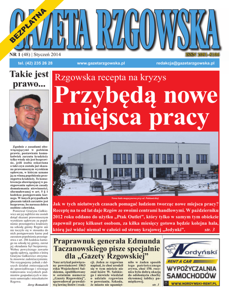B E Z P ŁA T N A GAZETA RZGOWSKA NR 1 (48) | Styczeń 2014 tel. (42) 235 26 28 ISSN 2081-8106 www.gazetarzgowska.pl [email protected] Takie jest Rzgowska recepta na kryzys prawo... Przybędą nowe miejsca pracy Zgodnie z zasadami obowiązującymi w polskim prawie, postawienie komukolwiek zarzutu kradzieży tylko wtedy nie jest bezprawne, jeśli osoba oskarżana o taki czyn została już skazana prawomocnym wyrokiem sądowym, w którym uznano ją za winną popełnienia przestępstwa kradzieży. To konsekwencja obowiązującej w postępowaniu sądowym zasady domniemania niewinności, sformułowanej w art. 5 § 1 kodeksu postępowania karnego. W innych przypadkach głoszenie takich zarzutów jest bezprawne, bo narusza dobra osobiste człowieka. Ponieważ Grażyna Gałkiewicz ani jej najbliżsi nie zostali dotąd skazani prawomocnym wyrokiem sądowym za popełnienie przestępstwa kradzieży na szkodę gminy Rzgów ani nie toczyło się w stosunku do nich postępowanie karne pod zarzutem popełnienia przestępstwa z art. 286 kodeksu karnego na szkodę tej gminy, zarzut jej okradania był bezprawny. Wobec powyższego zawarto ugodę sądową, zgodnie z którą Grażyna Gałkiewicz otrzymała stosowne zadośćuczynienie. Nie rezygnujemy jednak z dalszych działań zmierzających do sprawiedliwego i równego traktowania wszystkich podmiotów gospodarczych w interesie samorządu i mieszkańców Rzgowa. Jerzy Romański Nowa hala magazynowa przy ul. Pabianickiej Jak w tych niełatwych czasach pomagać ludziom tworząc nowe miejsca pracy? Receptę na to od lat daje Rzgów ze swoimi centrami handlowymi. W październiku 2012 roku oddano do użytku „Ptak Outlet”, który tylko w samym tym obiekcie zapewnił pracę kilkuset osobom, za kilka miesięcy gotowa będzie kolejna hala, którą już widać niemal w całości od strony krajowej „Jedynki”. str. 3 Praprawnuk generała Edmunda Taczanowskiego pisze specjalnie dla „Gazety Rzgowskiej” Nasz artykuł poświęcony powstańcowi 1863 roku Wojciechowi Salskiemu, opublikowany w ostatnim numerze „Gazety Rzgowskiej”, spowodował prawdziwą lawinę listów i reak- cji. Jeden ze rzgowian napisał, że choć urodził się w tym mieście nie znał losów W. Salskiego i niewiele wiedział o udziale rzgowian w powstaniu. Szkoda, że miasto nie upamięt- niło w żaden sposób tego patriotycznego zrywu, choć 150. rocznica była dobrą okazją do odsłonięcia choćby skromnej tablicy pamiątkowej. str. 3 str. 2 PATOLOGIA PO RZGOWSKU, CZYLI RÓWNI I RÓWNIEJSI Wyjaśnienie kwestii możliwego niedoszacowania wartości odtworzeniowej niektórych nieruchomości na terenie gminy, decydującej o wysokości płaconych podatków od nieruchomości, ma podstawowe znaczenie dla poczucia sprawiedliwości i równości wszystkich podatników wobec prawa. W czasie sesji Rady Miejskiej Rzgowa w dniu 5 czerwca 2013 r. padły stwierdzenia, które powinny zwrócić uwagę całej rzgowskiej opinii publicznej, m.in. na wysoce prawdopodobne znaczne niedoszacowanie wartości budowli wokół „Polrosu” (m.in. parkingu i ogrodzenia), a tym samym wysokości podatków wpłacanych do gminnej kasy. Ta sprawa musi zostać wyjaśniona. Także wiele innych zjawisk świadczy o głębokiej patologii toczącej życie gospodarcze i publiczne Rzgowa. Co bowiem może usprawiedliwić bezprawne użytkowanie przez kogokolwiek magazynu jako centrum handlowego i czerpanie z tego niemałych korzyści finansowych albo wybudowanie i użytkowanie całkowicie nielegalnego obiektu uznanego prawomocnym wyrokiem sądu za samowolę budowlaną? Nie ma także żadnego usprawiedliwienia za wieloletnie narażanie tysięcy nieświadomych zagrożenia ludzi na utratę życia, zdrowia czy mienia z powodu nie wykonania wymaganych przez prawo instalacji zapewniających wszystkim bezpieczeństwo. Wieloletnie proceduralne „mielenie” spraw dotyczących obiektów przy Tuszyńskiej 72/74 i 69/71 czy choćby Grodziskiej 2 jest kpiną ze zdrowego rozsądku. Od 2009 r. nowy miejscowy plan zagospodarowania przestrzennego Rzgowa umożliwiał przekształcenie pierwszego ze wspomnianych obiektów z magazynowego na handlowy. Jednak aż do 2013 r. niewiele zrobiono. Obiekt przy Tuszyńskiej 69/71 to inny jaskrawy dowód nieudolności urzędniczej. Zostało to wyraźnie stwierdzone podczas XXXIV sesji Rady Miejskiej Rzgowa oraz w czasie posiedzenia połączonych komisji bezpieczeństwa: działającej przy staroście i w ramach Rady Powiatu Łódzkiego Wschodniego, kiedy wyszło na jaw, że w 2012 r. bezprawnie wydano pozwolenie na wykonanie przyłącza gazowego dla tej samowoli budowlanej. Według zapowiedzi urzędników powiatu sprawę tę bada już prokuratura. Tylko po co nam takie służby, na których nie można polegać, choć powierzono im nasze bezpieczeństwo? Co z odpowiedzialnością ludzi, którzy skutki swoich ryzykownych a czasem bezprawnych działań przerzucają na barki swoich najemców i ich klientów? Czy w tym mieście nie ma już przyzwoitości i liczy się tylko kasa? Stowarzyszenie Przedsiębiorców Rzgowa Styczeń 2014 Gazeta Rzgowska LOKALNIE Zagrała Orkiestra Owsiaka… Spora gromada rzgowskich zuchów dwoiła się i troiła w hali Ptak Outlet w niedzielę 12 stycznia, by wesprzeć Wielką Orkiestrę Świątecznej Pomocy Jurka Owsiaka. A że maluchy w harcerskich mundurkach prezentowały się znakomicie, więc i do skarbonek wędrowały nie tylko monety. 9 lutego oddajemy krew Przypominamy mieszkańcom naszego miasta i gminy, że akcja przekazywania krwi potrzebującym odbędzie się 9 lutego br. w godz. 10.30-13.30. W tym czasie – jak nas poinformowała Klaudia Zaborowska - w sąsiedztwie Urzędu Miejskiego znajdować się będzie ambulans Wojewódzkiej Stacji Krwiodawstwa w Łodzi. Kilka miesięcy temu w podobnej akcji krew – najcenniejszy z leków - oddało wielu honorowych dawców. (PO) „Dziupla” pełna łupów Łącznie tego dnia w mieście i gminie w akcji uczestniczyło 65 wolon
