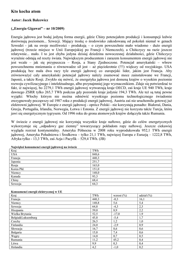 Kto kocha atom Autor: Jacek Balcewicz („Energia Gigawat” – nr 10/2009) Energia jądrowa jest bodaj jedyną forma energii, gdzie Chiny potencjałem produkcji i konsumpcji ledwie dorównują poziomem... Szwecji. Mający troskę o środowisko zakodowaną od pokoleń niemal w genach Szwedzi - jak na swoje moŜliwości - produkują – o czym powszechnie mało wiadomo - duŜo energii jądrowej (trzecie miejsce w Unii Europejskiej po Francji i Niemczech), a Chińczycy na razie jeszcze relatywnie... mało. I to jest chyba jedyna dzisiaj dziedzina nowoczesnej działalności, gdzie Chińczycy wyraźnie odstają od reszty świata. Największym producentem i zarazem konsumentem energii jądrowej nie jest wcale – jak się przypuszcza – Rosja, a Stany Zjednoczone. Potencjał amerykański – wbrew powszechnemu mniemaniu o równowadze sił jest – aŜ pięciokrotnie (!!!) większy od rosyjskiego. USA produkują bez mała dwa razy tyle energii jądrowej co europejski lider, jakim jest Francja. Aby zrównowaŜyć cały amerykański potencjał jądrowy naleŜy zsumować moce zainstalowane we Francji, Japonii, a takŜe Rosji. Zwykło się mówić, Ŝe energetyka jądrowa jest domeną krajów o wysokim poziomie rozwoju cywilizacyjnego i intelektualnego, albo przynajmniej jego wyznacznikiem. Zdaje się potwierdzać to fakt, iŜ najwięcej, bo 2279,1 TWh energii jądrowej wytwarzają kraje OECD, zaś kraje UE 940 TWh, kraje dawnego ZSRR tylko 265,7 TWh podczas gdy pozostałe kraje jedynie 194,3 TWh. Ale teŜ są tutaj pewne wyjątki: Włochy którym nie moŜna odmówić wysokiego poziomu technologicznego świadomie zrezygnowały począwszy od 1987 roku z produkcji energii jądrowej, Austria zaś nie uruchomiła gotowej juŜ elektrowni jądrowej. W Europie z energii jądrowej - oprócz Polski - nie korzystają ponadto: Białoruś, Dania, Grecja, Portugalia, Irlandia, Norwegia, Łotwa i Estonia. Z energii jądrowej nie korzysta takŜe Turcja, która jawi się energetycznym tygrysem. Od 1996 roku do grona atomowych krajów dołączyła takŜe Rumunia. W świecie z energii jądrowej nie korzystają wszystkie kraje naftowe, gdzie do celów energetycznych wykorzystuje się „odpadowy gaz ziemny” towarzyszący pokładom ropy naftowej. Jeszcze ciekawiej wygląda rozrzut kontynentalny. Ameryka Północna w 2008 roku wyprodukowała 952,1 TWh energii jądrowej, Ameryka Południowa i Środkowa – tylko 21,1 TWh, najwięcej Europa z Eurazją – 1222,8 TWh, Afryka tylko - 13,3 TWh, zaś Azja i Pacyfik – 529,4 TWh. (JB) Najwięksi konsumenci energii jądrowej na świecie Kraj USA Francja Japonia Rosja Korea Płd. Niemcy Kanada Chiny Szwecja TWh 848,6 440,3 251,7 163,0 151,0 148,0 93,3 68,4 64,3 Konsumenci energii elektrycznej w UE Kraj Francja Niemcy Szwecja Hiszpania Wielka Brytania Belgia&Luksemburg Czechy Finlandia Słowacja Bułgaria Węgry Rumunia Litwa Holandia TWh 440,3 148,8 64,8 59,0 52,5 45,8 26,5 24,0 16,7 15,8 14,8 11,2 9,9 4,2 wzrost (%) -0,3 5,6 -4,3 8,9 -17,0 -5,4 1,2 -2,9 8,6 7,4 0,7 45,2 0,3 -1,0 udział (%) 16,1 5,4 2,3 2,2 1,9 1,7 1,0 0,9 0,6 0,6 0,5 0,4 0,4 0,2