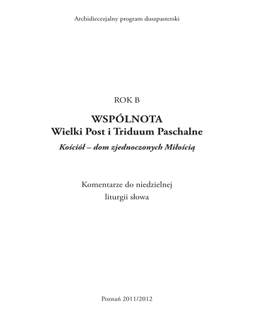 Archidiecezjalny program duszpasterski ROK B Wspólnota Wielki Post i Triduum Paschalne Kościół – dom zjednoczonych Miłością Komentarze do niedzielnej liturgii słowa Poznań 2011/2012 17 I niedziela Wielkiego Postu Rdz 9,8-15; Ps 25; 1 P 3,18-22; Mk 1,12-15 Nie zawsze życie człowieka jest lekkie, łatwe i przyjemne. Czasem trzeba się zaprzeć samego siebie i odwrócić od grzechu, który był naszą codziennością. Chrzest, zmywający nasz grzech, uzdalnia nas do wejścia na drogę Bożą. Pan sam po niej nas poprowadzi i zawrze z nami przymierze pełne pokoju. On nie chce nam wymierzać sprawiedliwości, lecz obdarzać miłością. Obyśmy umieli na nią odpowiedzieć. II niedziela Wielkiego Postu Rdz 22,1-2.9-13.15-18; Ps 116; Rz 8, 31b-34; Mk 9,2-10 Ojciec, który jest gotowy oddać życie syna… Postawa Abrahama wobec Izaaka to tylko zapowiedź doskonalszej ofiary. Oto sam Bóg wydaje swojego Syna na okrutną śmierć, by stał się Ofiarą Przebłagalną za grzechy świata. Pan nas nie potępia, lecz usprawiedliwia, rozrywa kajdany naszych grzechów. Bóg objawia nam swoją chwałę, która nas przerasta i napawa lękiem. Jednak ów strach znika w obliczu Bożej miłości, która została nam objawiona w zbawczej męce Chrystusa. III niedziela Wielkiego Postu Wj 20,1-17; Ps 19; 1 Kor 1,22-25; J 2,13-25 Zgorszenie i głupstwo… Prawo Boże, słowo Boga nie zawsze jest uznawane przez ludzi za mądrość. Można spotkać Boga i Go nie zauważyć, przejść obok Niego obojętnie. Jak nie rozminąć się z Bogiem? W Jaki sposób znaleźć uznanie w Jego oczach, gdy powtórnie przyjdzie? Trzeba żyć Jego przykazaniami na co dzień, w Jego słowach szukając swojej jedynej mądrości. IV niedziela Wielkiego Postu 2 Krn 36,14-16.19-23; Ps 137; Ef 2,4-10; J 3,14-21 Ludzkie życie pełne jest odejść od Boga. Czasem przyziemne sprawy i przyjemności przyciągają nas bardziej niż wola Boża, która nie zawsze jest łatwa do wypełnienia. Jak wiele straciliśmy, dostrzegamy dopiero wtedy, gdy dotyka nas wielkie nieszczęście, gdy jesteśmy daleko od Pana. Wtedy budzi się nasza tęsknota i żal. Jezus jednak przyszedł na świat nie po to, by nas potępić, lecz zbawić. Jeśli uwierzymy 18 w Niego i pójdziemy za światłem, Bóg sam przekreśli to wszystko, co wcześniej było złe w naszym życiu. V niedziela Wielkiego Postu Jr 31,31-34; Ps 51; Hbr 5,7-9; J 12,20-33 Kiedy przychodzi cierpienie, nie możemy się w nim zamknąć. Wołając do Boga o litość nad nami, powinniśmy czerpać moc z cierpienia Chrystusa, który przyjął je dobrowolnie, by zgładzić nasze grzechy. Bóg wie, że nie dojdziemy do Niego o własnych siłach. Potrzebujemy Pana, który sam przyjdzie mieszkać w naszych sercach i przemieni je swoją mocą. Cierpiąc, powinniśmy pokładać nadzieję w umęczonym Chrystusie, którego ostateczne zwycięstwo to triumf zmartwychwstania. Niedziela Palmowa Iz 50,4-7; Ps 22; Flp 2,6-11; Mk 14,1-15,47 Wyszydzenie, oplucie, odarcie z wszelkiej godności. Trudno coś takiego przyjąć i zaakceptować. A zgodzić się na to samemu? Jezus wziął na siebie grzechy całego świata i przyniósł nam zbawienie. Dzisiaj także i nas zaprasza do niesienia krzyża, do zgody na brak zrozumienia, samotność i zapieranie się siebie... On chce, byśmy i w takim doświadczeniu umieli się z Nim połączyć. Krzyż nie jest końcem, lecz początkiem. Po uniżeniu Chrystusa przychodzi Jego wywyższenie. On wie, że nasze zaparcie się siebie także przyniesie nam chwałę nieba. 19 TRIDUUM PASCHALNE Wielki Czwartek Komentarz przed rozpoczęciem liturgii Dzisiejszą liturgią rozpoczynamy świętowanie najważniejszej tajemnicy naszej wiary – Paschy naszego Pana. Uczestnicząc w Triduum Paschalnym, uobecniamy dzieło naszego odkupienia, które dokonało się przez mękę, krzyż i zmartwychwstanie Chrystusa. Jezus zwyciężył szatana, grzech i śmierć. To ofiara Chrystusa wprowadza nas na drogę wolności dzieci Bożych. W duchu wdzięczności starajmy się przeżyć ten święty czas łaski, otwierając się na nieskończoną miłość Boga, który dał swojego Syna, aby każdy, kto w Niego wierzy, miał życie wieczne. Msza św. Wieczerzy Pańskiej jest pamiątką ostatniej wieczerzy, którą Jezus sprawował ze swoimi uczniami w Wieczerniku. To początek Nowej Paschy, Nowego Przymierza, nowego czasu, nowego człowieka. Nowość ta będzie przejawiać się w postawie miłości idących za Chrystusem. W dzisiejszej liturgii jej znakiem jest obrzęd mandatum – umywania nóg, który będzie miał miejsce po homilii. W Wielki Czwartek również wspominamy ustanowienie sakramentu kapłaństwa. Koncelebra dzisiejszej Eucharystii jest wyrazem jedności prezbiterium. Otoczmy naszych kapłanów wierną modlitwą, by mogli z miłością pełnić powierzoną im misję. Puste dziś tabernakulum uświadamia nam również, że najważniejszym miejscem liturgii jest ołtarz, skąd Bóg daje nam codziennie prawdziwy pokarm Ciała i Krwi swojego Syna. Dlatego też po komunii św., Najświętszy Sakrament zostanie przeniesiony do specjalnej kaplicy adoracji, abyśmy mogli trwać przy Jezusie, dziękując Mu za Jego ofiarę miłości i obecność w Eucharystii. Komentarz przed czytaniami Pierwsze czytanie dzisiejszej liturgii słowa z Księgi Wyjścia wprowadza nas w liturgiczny opis wydarzenia z historii narodu wybranego, wydarzenia, którym było wyjście z ziemi egipskiej. Rytualny obrzęd ofiary z baranka i pokropienie krwią drzwi domostw ma być gwarancją Bożej opieki, a pośpieszne spożywanie wieczerzy – znakiem gotowości do wyjścia na drogę ku wolności. W pamiątkę wyzwolenia Izraelitów z niewoli wpisuje się Pascha Jezusa, o której pisze św. Paweł w swoim Pierwszym Liście do Koryntian. Chrystus swoją ofiarą dopełnia i wypełnia zapowiedzi Starego Przymierza. On staje się Barankiem ofiarowanym za nas, Jego Krew zostaje przelana dla naszego zbawienia. Jezus ba