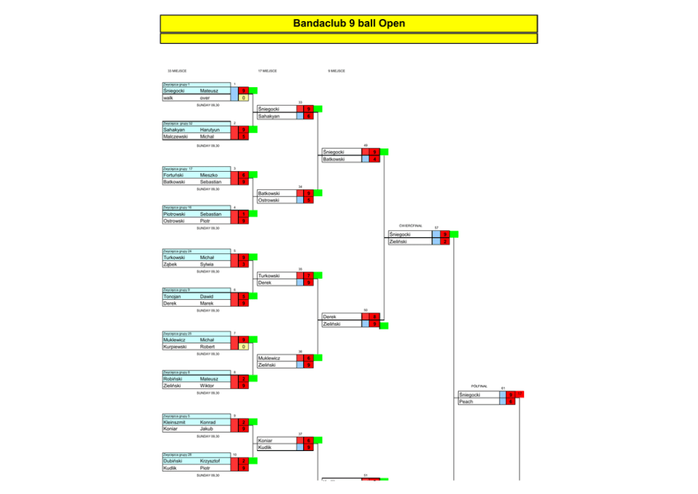 Bandaclub 9 ball Open 33 MIEJSCE 17 MIEJSCE Zwycięzca grupy 1 Śniegocki walk 1 Mateusz over 9 0 33 SUNDAY 09,30 Zwycięzca grupy 32 Sahakyan Malczewski 9 MIEJSCE Śniegocki Sahakyan 9 6 2 Harutyun Michal 9 5 49 SUNDAY 09,30 Śniegocki Batkowski Zwycięzca grupy 17 Fortuński Batkowski 3 Mieszko Sebastian 6 9 34 SUNDAY 09,30 Batkowski Ostrowski Zwycięzca grupy 16 Piotrowski Ostrowski 9 4 9 5 4 Sebastian Piotr 1 9 ĆWIERĆFINAŁ SUNDAY 09,30 Śniegocki Zieliński Zwycięzca grupy 24 Turkowski Ząbek 9 3 35 Turkowski Derek Zwycięzca grupy 9 7 9 6 Dawid Marek 5 9 50 SUNDAY 09,30 Derek Zieliński Zwycięzca grupy 25 Muklewicz Kurpiewski 8 9 7 Michał Robert 9 0 36 SUNDAY 09,30 Muklewicz Zieliński Zwycięzca grupy 8 Robiński Zieliński 6 9 8 Mateusz Wiktor 2 9 PÓŁFINAŁ SUNDAY 09,30 Zwycięzca grupy 5 Kleinszmit Koniar 9 2 5 Michał Sylwia SUNDAY 09,30 Tonojan Derek 57 Śniegocki Peach 9 Konrad Jakub 2 9 37 SUNDAY 09,30 Koniar Kudlik Zwycięzca grupy 28 6 9 10 Dubiński Krzysztof 2 Kudlik Piotr 9 51 SUNDAY 09,30 Kudlik 9 61 9 6 17 Kudlik Borowiec Zwycięzca grupy 21 Borowiec Mrva 11 Adrian Milan 9 0 38 SUNDAY 09,30 Borowiec Banek Zwycięzca grupy 12 Banek Kapłan 9 7 9 8 12 Wojciech Tomasz 9 8 ĆWIERĆFINAŁ SUNDAY 09,30 58 Kudlik Peach Zwycięzca grupy 13 Wróbel Guzanowski 13 Krzysztof Andrzej 9 5 39 SUNDAY 09,30 Zwycięzca grupy 20 Roter Sawicki Wróbel Krzysztof Sawicki Jakub 9 8 14 Mariusz Jakub 7 9 52 SUNDAY 09,30 Wróbel Krzysztof Peach Zwycięzca grupy 29 Hryb Osman 5 9 2 9 Finał 15 Dimitry Tomasz 9 6 2 m-ce 2 grupa 40 SUNDAY 09,30 Hryb Peach Zwycięzca grupy 4 Peach walk 16 Daryl over Śniegocki 5 Sroczyński 9 ZWYCIĘZCA 8 9 Sroczyński 9 0 SUNDAY 09,30 Zwycięzca grupy 3 Sroczyński walk 17 Wojciech over 9 0 41 SUNDAY 09,30 Zwycięzca grupy 30 Stofko Gmur Sroczyński Gmur 9 6 18 Vojtech Kamil 7 9 2 m-ce grupa 1 53 SUNDAY 09,30 Sroczyński Trajdos Zwycięzca grupy 19 Macioł Nowacki 9 1 19 Daniel Karol 9 1 42 SUNDAY 09,30 Zwycięzca grupy 14 Kulaszka Trajdos 9 1 Macioł Trajdos 8 9 20 Dawid Wojciech 1 9 ĆWIERĆFINAŁ SUNDAY 09,30 Sroczyński Fortuński Zwycięzca grupy 11 Kościelniak Kaczmarek 21 Jakub Paweł 7 9 43 SUNDAY 09,30 Kaczmarek Fortuński 3 9 63 59 9 7 Fortuński Zwycięzca grupy 22 Jędrzejczak Fortuński 9 22 Dawid Marcel 6 9 54 SUNDAY 09,30 Fortuński Duda Zwycięzca grupy 27 Duda Lichodziejewsi 23 Szymon Michal 9 1 44 SUNDAY 09,30 Duda Skoneczny Zwycięzca grupy 6 Misiewicz Skoneczny 9 6 9 8 ` 24 Radosław Mariusz 1 9 PÓŁFINAŁ SUNDAY 09,30 Zwycięzca grupy 7 Kudlik Wasilewski Sroczyński Szewczyk 25 Marek Roman 9 8 45 SUNDAY 09,30 Kudlik Łupiński Zwycięzca grupy 26 9 2 26 Marcinkiewicz Michał 6 Łupiński Karol 9 55 SUNDAY 09,30 Kudlik Migdałek Zwycięzca grupy 23 Karpińśki Zalewski 27 Oskar Paweł 9 1 46 SUNDAY 09,30 Zwycięzca grupy 10 Rzeczycki Migdałek 6 9 Karpińśki Migdałek 5 9 28 Mateusz Bartosz 3 9 ĆWIERĆFINAŁ SUNDAY 09,30 Migdałek Szewczyk Zwycięzca grupy 15 Bąk Rybacki 29 Tomasz Mateusz 9 0 47 SUNDAY 09,30 Zwycięzca 18 grupy Winogradow Szewczyk Bąk Szewczyk 5 9 30 Andrzej Wojciech 4 9 0 56 SUNDAY 09,30 Szewczyk Piekarski Zwycięzca grupy 31 Piekarski Wolski 31 Konrad Rafał 9 5 2 m-ce 3 grupa 48 SUNDAY 09,30 Piekarski Juszczyszyn Zwycięzca grupy 2 Juszczyszyn walk 32 Konrad over SUNDAY 09,30 9 00 9 8 9 4 60 1 9 62 9 7 11