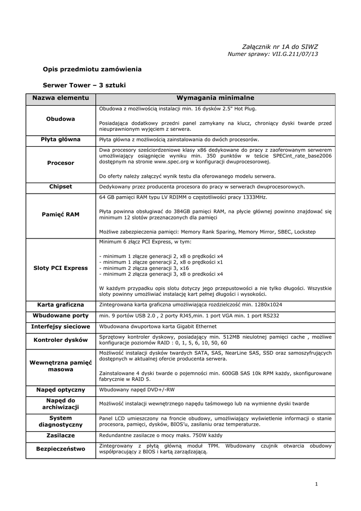 Załącznik nr 1A do SIWZ Numer sprawy: VII.G.211/07/13 Opis przedmiotu zamówienia Serwer Tower – 3 sztuki Nazwa elementu Wymagania minimalne Obudowa z możliwością instalacji min. 16 dysków 2.5" Hot Plug. Obudowa Płyta główna Procesor Posiadająca dodatkowy przedni panel zamykany na klucz, chroniący dyski twarde przed nieuprawnionym wyjęciem z serwera. Płyta główna z możliwością zainstalowania do dwóch procesorów. Dwa procesory sześciordzeniowe klasy x86 dedykowane do pracy z zaoferowanym serwerem umożliwiający osiągnięcie wyniku min. 350 punktów w teście SPECint_rate_base2006 dostępnym na stronie www.spec.org w konfiguracji dwuprocesorowej. Do oferty należy załączyć wynik testu dla oferowanego modelu serwera. Chipset Dedykowany przez producenta procesora do pracy w serwerach dwuprocesorowych. 64 GB pamięci RAM typu LV RDIMM o częstotliwości pracy 1333MHz. Pamięć RAM Płyta powinna obsługiwać do 384GB pamięci RAM, na płycie głównej powinno znajdować się minimum 12 slotów przeznaczonych dla pamięci Możliwe zabezpieczenia pamięci: Memory Rank Sparing, Memory Mirror, SBEC, Lockstep Minimum 6 złącz PCI Express, w tym: Sloty PCI Express - minimum minimum minimum minimum 1 1 2 2 złącze złącze złącza złącza generacji generacji generacji generacji 2, 2, 3, 3, x8 o prędkości x4 x8 o prędkości x1 x16 x8 o predkości x4 W każdym przypadku opis slotu dotyczy jego przepustowości a nie tylko długości. Wszystkie sloty powinny umożliwiać instalację kart pełnej długości i wysokości. Karta graficzna Zintegrowana karta graficzna umożliwiająca rozdzielczość min. 1280x1024 Wbudowane porty min. 9 portów USB 2.0 , 2 porty RJ45,min. 1 port VGA min. 1 port RS232 Interfejsy sieciowe Wbudowana dwuportowa karta Gigabit Ethernet Kontroler dysków Wewnętrzna pamięć masowa Napęd optyczny Napęd do archiwizacji System diagnostyczny Sprzętowy kontroler dyskowy, posiadający min. 512MB nieulotnej pamięci cache , możliwe konfiguracje poziomów RAID : 0, 1, 5, 6, 10, 50, 60 Możliwość instalacji dysków twardych SATA, SAS, NearLine SAS, SSD oraz samoszyfrujących dostępnych w aktualnej ofercie producenta serwera. Zainstalowane 4 dyski twarde o pojemności min. 600GB SAS 10k RPM każdy, skonfigurowane fabrycznie w RAID 5. Wbudowany napęd DVD+/-RW Możliwość instalacji wewnętrznego napędu taśmowego lub na wymienne dyski twarde Panel LCD umieszczony na froncie obudowy, umożliwiający wyświetlenie informacji o stanie procesora, pamięci, dysków, BIOS’u, zasilaniu oraz temperaturze. Zasilacze Redundantne zasilacze o mocy maks. 750W każdy Bezpieczeństwo Zintegrowany z płytą główną moduł TPM. współpracujący z BIOS i kartą zarządzającą. Wbudowany czujnik otwarcia obudowy 1 Niezależna od zainstalowanego na serwerze systemu operacyjnego posiadająca dedykowane port RJ-45 Gigabit Ethernet umożliwiająca: Karta zarządzająca - zdalny dostęp do graficznego interfejsu Web karty zarządzającej - zdalne monitorowanie i informowanie o statusie serwera (m.in. prędkości obrotowej wentylatorów, konfiguracji serwera, ) - szyfrowane połączenie (SSLv3) oraz autentykacje i autoryzację użytkownika - możliwość podmontowania zdalnych wirtualnych napędów - wirtualną konsolę z dostępem do myszy, klawiatury - wsparcie dla IPv6 - wsparcie dla WSMAN (Web Service for Managament); SNMP; IPMI2.0, VLAN tagging, Telnet, SSH - możliwość zdalnego monitorowania w czasie rzeczywistym poboru prądu przez serwer - możliwość zdalnego ustawienia limitu poboru prądu przez konkretny serwer - integracja z Active Directory - możliwość obsługi przez dwóch administratorów jednocześnie - wsparcie dla dynamic DNS - wysyłanie do administratora maila z powiadomieniem o awarii lub zmianie konfiguracji sprzętowej - możliwość podłączenia lokalnego poprzez złącze RS-232 Możliwość rozbudowy funkcjonalności karty o automatyczne przywracanie ustawień serwera, kart sieciowych, BIOS, wersji firmware w przypadku awarii i wymiany któregoś z komponentów ze zintegrowanej na karcie zarządzającej pamięci flash (w tym kontrolera RAID, kart sieciowych, płyty głównej). Pięć lat gwarancji producenta realizowanej w miejscu instalacji sprzętu, z czasem reakcji do następnego dnia roboczego od przyjęcia zgłoszenia, możliwość zgłaszania awarii w trybie 24 godziny 7 dni w tygodniu. Gwarancja W przypadku awarii, dyski twarde pozostają własnością Zamawiającego. Firma serwisująca musi posiadać ISO 9001:2000 na świadczenie usług serwisowych oraz posiadać autoryzacje producenta serwera – dokumenty potwierdzające należy załączyć do oferty. Serwer musi być wyprodukowany zgodnie z normą ISO-9001 oraz ISO-14001. (załączyć oświadczenie) Certyfikaty Serwer musi posiadać deklaracja CE. (załączyć oświadczenie) Oferowany sewer musi znajdować się na liście Windows Server Catalog i posiadać status „Certified for Windows” dla systemów Windows Server 2008 R2 x64, x86, Microsoft Windows Server 2012. Zamawiający wymaga dokumentacji w języku polskim lub angielskim. Dokumentacja Możliwość telefonicznego sprawdzenia konfiguracji sprzętowej serwera oraz warunków gwarancji po podaniu numeru seryjnego bezpośrednio u producenta lub jego przedstawiciela. Oprogramowanie: Nazwa elementu Opis Liczba System obsługi kopii zapasowych Acronis Backup&Recovery 11.5 Server PL 3 2