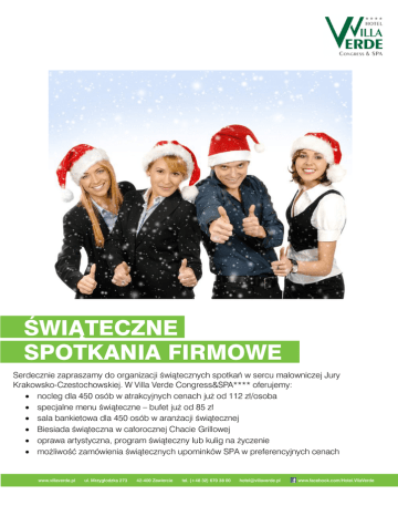 ŚWIĄTECZNE SPOTKANIA FIRMOWE Serdecznie zapraszamy do organizacji świątecznych spotkań w sercu malowniczej Jury Krakowsko-Czestochowskiej. W Villa Verde Congress&SPA**** oferujemy: nocleg dla 450 osób w atrakcyjnych cenach już od 112 zł/osoba specjalne menu świąteczne – bufet już od 85 zł sala bankietowa dla 450 osób w aranżacji świątecznej Biesiada świąteczna w całorocznej Chacie Grillowej oprawa artystyczna, program świąteczny lub kulig na życzenie możliwość zamówienia świątecznych upominków SPA w preferencyjnych cenach www.villaverde.pl ul. Mrzygłodzka 273 42-400 Zawiercie tel. (+48 32) 670 38 00 [email protected] www.facebook.com/Hotel.VllaVerde ŚWIĄTECZNE ZESTAWY SERWOWANE ZESTAW 1 - 55 PLN / 1 OS Tatar ze śledzia z jabłkiem ułożony na carpaccio z marynowanego buraka w occie balsamicznym Tradycyjny karp smażony w panierce ziołowej podany na kapuście duszonej z grochem w asyście pieczonych ziemniaków Makówki śląskie podane z gorącymi wiśniami i lodami cynamonowymi ZESTAW 2 - 65 PLN / 1 OS Pierogi z kapustą i grzybami w sosie rozmarynowym Kacze udka pieczone w pomarańczach z imbirem serwowane z kopytkami glazurowanymi w koperku i kapustą czerwoną duszoną w winie ze śliwkami Makowiec zawijany na sosie kawowym z karmelizowanymi bakaliami ZESTAW 3 - 75 PLN / 1 OS Łosoś w cieście francuskim z pesto z pomidorów i bazylii Żurek świąteczny na wywarze z suszonych grzybów Roladki z polędwiczek z suszoną śliwką i camembertem, zapiekane ziemniaki gratin oraz bukiet warzyw gotowanych z masłem ziołowo-czosnkowym Torcik piernikowo-serowy ZESTAW 4 - 75 PLN / 1 OS Pierogi z łososiem i szpinakiem w sosie rakowym Barszczyk świąteczny z tartą z kiszonej kapusty i grzybów Rolada z indyka w plastrach wędzonego boczku nadziewana suszonymi pomidorami serwowana z kluskami francuskimi oraz buraczki duszone w śmietanie Tort makowo-czekoladowy z marmoladą śliwkową DO KAŻDEGO POSIŁKU PROPONUJEMY NAPOJE ZIMNE: SOK OWOCOWY I NAPOJE GAZOWANE PEPSI (PET)– 12 ZŁ/L WODA MINERALNA NIEGAZOWANA: 8 ZŁ/L POLECAMY NAPOJE GORĄCE: ŚWIEŻO PARZONA KAWA (W TERMOSACH - 50 PORCJI): 120 ZŁ WYBÓR HERBAT SMAKOWYCH SIR WILLIAMS (40 PORCJI): 80 ZŁ www.villaverde.pl ul. Mrzygłodzka 273 42-400 Zawiercie tel. (+48 32) 670 38 00 [email protected] www.facebook.com/Hotel.VillaVerde BUFETY ZAKĄSEK ZIMNYCH PROPOZYCJA 1 - 50 PLN / 1 OS PROPOZYCJA 2 - 70 PLN / 1 OS Wybór mięs pieczonych z piklami i trzema sosami (tatarski, tysiąca wysp, czosnkowym) Pasztet staropolski z grzybami i sosem cumberland Rolada z kurczaka nadziewana pistacjami Rożki z pieczonego schabu na musie chrzanowym Mini galaretki drobiowe z jajkiem i zielonym groszkiem Roladki z szynki na tradycyjnej sałatce jarzynowej Sola na flanie szpinakowym zapiekanym z serem cheddar Śledzie po kaszubsku z marynowaną cebulką Deska serów z marynowaną gruszką i orzechami Sałatka z grillowanego kurczaka z kukurydzą, ananasem i dresingiem cesarskim Sałatka Szopska z marynowanym owczym serem i dresingiem balsamicznym Polędwiczki wieprzowe nadziewane borowikami z musem żurawinowym Plastry pieczonego indyka z sezamem i sosem miodowo-imbirowym Schab marynowany ziołach z sosem tuńczykowym rukolą i pomidorami concase Roladki z wędzonego łososia nadziewane serem ricotta Szynka parmeńska z melonem na kolorowych sałatach Mus z wędzonego pstrąga z sosem limonkowym Mini ptysie faszerowane kremowa pastą z wędzonego łososia Mini tymbaliki ze szparagami, szynką wędzoną i warzywami Deska serów z marynowaną gruszką i orzechami Terrina z kurczaka z suszonymi pomidorami Wybór świeżego pieczywa i masełek smakowych Polędwiczki wieprzowe nadziewane borowikami z musem żurawinowym Plastry pieczonego indyka z sezamem i sosem miodowo-imbirowym Schab marynowany ziołach z sosem tuńczykowym rukolą i pomidorami concase Roladki z wędzonego łososia nadziewane serem ricotta Szynka parmeńska z melonem na kolorowych sałatach Mus z wędzonego pstrąga z sosem limonkowym Mini ptysie faszerowane kremowa pastą z wędzonego łososia Mini tymbaliki ze szparagami, szynką wędzoną i warzywami Deska serów z marynowaną gruszką i orzechami Terrina z kurczaka z suszonymi pomidorami Wybór świeżego pieczywa i masełek smakowych i serem feta Śledzie w oleju z cebulą, zielonym pieprzem i kaparami Sałatka włoska mozzarellą ,pomidorami, grillowanym kurczakiem i grzankami Grillowane warzywa w aromacie oliwy czosnkowej z serem owczym marynowany w oregano Sałatka z fasolki szparagowej, ogórków, pomidorów i pieczonych ziemniaków Pasztet z dziczyzny z grzybami i sosem cumberland Wybór marynat i zimnych sosów Świeże pieczywo i masełka smakowe www.villaverde.pl ul. Mrzygłodzka 273 42-400 Zawiercie tel. (+48 32) 670 38 00 [email protected] www.facebook.com/Hotel.VillaVerde ŚWIĄTECZNE BUFETY PROPOZYCJA 1 - 85 PLN / 1 OS PROPOZYCJA 2 - 105 PLN / 1 OS BUFET ZIMNYCH PRZEKĄSEK pasztet z kaczki ze śliwkami moczonymi w koniaku tymbliki z karpia królewskiego z zielonym groszkiem i cytryną tradycyjna sałatka jarzynowa sałatka z soczewicy z wędzonym pstrągiem i suszonymi pomidorami schab faszerowany suszonymi morelami sosy zimne i dresingi: cumberland, tatarski, chrzanowy wybór pieczywa i masełek smakowych BUFET ZIMNYCH PRZEKĄSEK Wybór mięs pieczonych Śledź w śmietanie z jabłkiem i orzechami Tymbaliki rybne z krewetkami i awokado Bliny gryczane z wędzonym łososiem i kawiorem Pasztet z dzika z marynowanymi grzybami Wybór serów dojrzewających Sałatka z grillowanym kurczakiem i prażonymi pestkami dyni Sałatka śledziowa z glazurowanymi buraczkami i korniszonami Sosy zimne i dresingi: cumberland, tatarski, chrzanowy Wybór pieczywa i masełek smakowych BUFET CIEPŁYCH DAŃ Barszcz czerwony z uszkami Zupa z grzybów leśnych z łazankami Karp smażony soute z sosem szarym Pierogi z kapustą i grzybami okraszone smażoną cebulą Rolada z indyka w plastrach wędzonego boczku nadzie