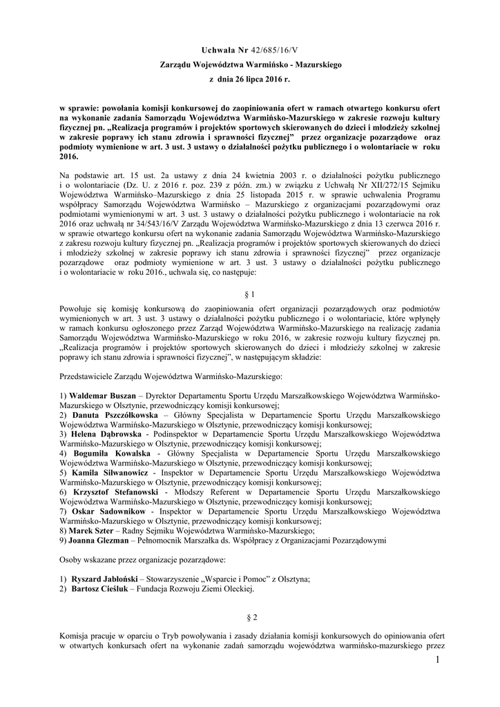 Uchwała Nr 42/685/16/V Zarządu Województwa Warmińsko - Mazurskiego z dnia 26 lipca 2016 r. w sprawie: powołania komisji konkursowej do zaopiniowania ofert w ramach otwartego konkursu ofert na wykonanie zadania Samorządu Województwa Warmińsko-Mazurskiego w zakresie rozwoju kultury fizycznej pn. „Realizacja programów i projektów sportowych skierowanych do dzieci i młodzieży szkolnej w zakresie poprawy ich stanu zdrowia i sprawności fizycznej” przez organizacje pozarządowe oraz podmioty wymienione w art. 3 ust. 3 ustawy o działalności pożytku publicznego i o wolontariacie w roku 2016. Na podstawie art. 15 ust. 2a ustawy z dnia 24 kwietnia 2003 r. o działalności pożytku publicznego i o wolontariacie (Dz. U. z 2016 r. poz. 239 z późn. zm.) w związku z Uchwałą Nr XII/272/15 Sejmiku Województwa Warmińsko–Mazurskiego z dnia 25 listopada 2015 r. w sprawie uchwalenia Programu współpracy Samorządu Województwa Warmińsko – Mazurskiego z organizacjami pozarządowymi oraz podmiotami wymienionymi w art. 3 ust. 3 ustawy o działalności pożytku publicznego i wolontariacie na rok 2016 oraz uchwałą nr 34/543/16/V Zarządu Województwa Warmińsko-Mazurskiego z dnia 13 czerwca 2016 r. w sprawie otwartego konkursu ofert na wykonanie zadania Samorządu Województwa Warmińsko-Mazurskiego z zakresu rozwoju kultury fizycznej pn. „Realizacja programów i projektów sportowych skierowanych do dzieci i młodzieży szkolnej w zakresie poprawy ich stanu zdrowia i sprawności fizycznej” przez organizacje pozarządowe oraz podmioty wymienione w art. 3 ust. 3 ustawy o działalności pożytku publicznego i o wolontariacie w roku 2016., uchwala się, co następuje: §1 Powołuje się komisję konkursową do zaopiniowania ofert organizacji pozarządowych oraz podmiotów wymienionych w art. 3 ust. 3 ustawy o działalności pożytku publicznego i o wolontariacie, które wpłynęły w ramach konkursu ogłoszonego przez Zarząd Województwa Warmińsko-Mazurskiego na realizację zadania Samorządu Województwa Warmińsko-Mazurskiego w roku 2016, w zakresie rozwoju kultury fizycznej pn. „Realizacja programów i projektów sportowych skierowanych do dzieci i młodzieży szkolnej w zakresie poprawy ich stanu zdrowia i sprawności fizycznej”, w następującym składzie: Przedstawiciele Zarządu Województwa Warmińsko-Mazurskiego: 1) Waldemar Buszan – Dyrektor Departamentu Sportu Urzędu Marszałkowskiego Województwa WarmińskoMazurskiego w Olsztynie, przewodniczący komisji konkursowej; 2) Danuta Pszczółkowska – Główny Specjalista w Departamencie Sportu Urzędu Marszałkowskiego Województwa Warmińsko-Mazurskiego w Olsztynie, przewodniczący komisji konkursowej; 3) Helena Dąbrowska - Podinspektor w Departamencie Sportu Urzędu Marszałkowskiego Województwa Warmińsko-Mazurskiego w Olsztynie, przewodniczący komisji konkursowej; 4) Bogumiła Kowalska - Główny Specjalista w Departamencie Sportu Urzędu Marszałkowskiego Województwa Warmińsko-Mazurskiego w Olsztynie, przewodniczący komisji konkursowej; 5) Kamila Silwanowicz - Inspektor w Departamencie Sportu Urzędu Marszałkowskiego Województwa Warmińsko-Mazurskiego w Olsztynie, przewodniczący komisji konkursowej; 6) Krzysztof Stefanowski - Młodszy Referent w Departamencie Sportu Urzędu Marszałkowskiego Województwa Warmińsko-Mazurskiego w Olsztynie, przewodniczący komisji konkursowej; 7) Oskar Sadownikow - Inspektor w Departamencie Sportu Urzędu Marszałkowskiego Województwa Warmińsko-Mazurskiego w Olsztynie, przewodniczący komisji konkursowej; 8) Marek Szter – Radny Sejmiku Województwa Warmińsko-Mazurskiego; 9) Joanna Glezman – Pełnomocnik Marszałka ds. Współpracy z Organizacjami Pozarządowymi Osoby wskazane przez organizacje pozarządowe: 1) Ryszard Jabłoński – Stowarzyszenie „Wsparcie i Pomoc” z Olsztyna; 2) Bartosz Cieśluk – Fundacja Rozwoju Ziemi Oleckiej. §2 Komisja pracuje w oparciu o Tryb powoływania i zasady działania komisji konkursowych do opiniowania ofert w otwartych konkursach ofert na wykonanie zadań samorządu województwa warmińsko-mazurskiego przez 1 organizacje pozarządowe oraz podmioty wymienione w art. 3 ust. 3 ustawy o działalności pożytku publicznego i o wolontariacie stanowiący załącznik do Programu współpracy Samorządu Województwa WarmińskoMazurskiego z organizacjami pozarządowymi oraz podmiotami wymienionymi w art. 3 ust. 3 ustawy o działalności pożytku publicznego i wolontariacie na rok 2016. §3 Obsługę techniczną prac komisji konkursowej zapewnia Departament Sportu Urzędu Marszałkowskiego Województwa Warmińsko-Mazurskiego w Olsztynie. §4 Członkom komisji konkursowej będącymi przedstawicielami organizacji pozarządowych oraz podmiotów wymienionych w art.3 ust.3 ustawy o działalności pożytku publicznego i o wolontariacie przysługuje zwrot kosztów dojazdu na posiedzenie komisji konkursowej – zgodnie z Uchwałą Nr 31/596/10/III Zarządu Województwa Warmińsko-Mazurskiego z dnia 28 czerwca 2010 r. §5 Komisję konkursową powołuje się na czas określony, tj. do 31 października 2016 r. §6 Wykonanie uchwały powierza się Dyrektorowi Departamentu Sportu Urzędu Marszałkowskiego Województwa Warmińsko – Mazurskiego w Olsztynie. §7 Uchwała wchodzi w życie z dniem podjęcia. 2