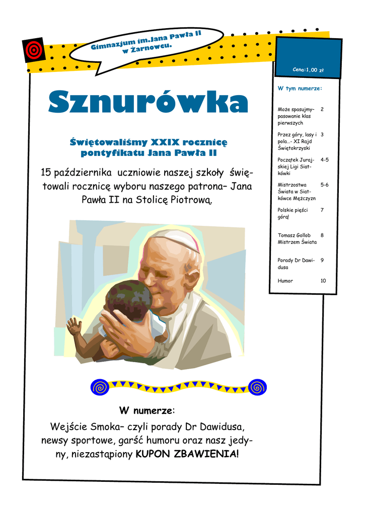 Pawła m.Jana i m u j z owcu. Gimna w Żarn II Cena:1,00 zł Sznurówka Świętowaliśmy XXIX rocznicę pontyfikatu Jana Pawła II 15 października uczniowie naszej szkoły świętowali rocznicę wyboru naszego patrona– Jana Pawła II na Stolicę Piotrową. W tym numerze: Może spasujmy– pasowanie klas pierwszych 2 Przez góry, lasy i 3 pola…- XI Rajd Świętokrzyski Początek Jurajskiej Ligi Siatkówki 4-5 Mistrzostwa Świata w Siatkówce Mężczyzn 5-6 Polskie pięści górą! 7 Tomasz Gollob 8 Mistrzem Świata W numerze: Wejście Smoka– czyli porady Dr Dawidusa, newsy sportowe, garść humoru oraz nasz jedyny, niezastąpiony KUPON ZBAWIENIA! Porady Dr Dawidusa 9 Humor 10 Może spasujmy– -pasowanie klas pierwszych. 30 września w naszym gimnazjum miała miejsce bardzo podniosła uroczystośćślubowanie klas pierwszych. by ,,kotom’’ nie zaschło w ustach, dla zdrowotności, by nie dopadła ich szybko grypa, musieli wypić mleko z czosnkiem. Głównym celem spotkania przygotowanego przez klasy drugie było oficjalne przyjęcie pierwszaków do gimnazjalnej wspólnoty uczniowskiej. Tę uroczystość zaszczycił swoją obecnością Wójt gminy- pan Eugeniusz Kapuśniak, ofiarowując wszystkim uczniom pamiątkowe breloczki. Sądząc po minach niektórych z nich, nie był to najsmaczniejszy posiłek, jaki kiedykolwiek jedli. Tradycyjnie, jak co roku, nowicjusze powtarzali słowa przysięgi, do której mają się stosować przez następne lata nauki w gimnazjum. Nie obyło się również bez konkurencji na wesoło. Pierwszoklasiści musieli udzielić odpowiedzi na pytania, pokonać tor przeszkód, co okazało się dla nich największym wyzwaniem – spożyć zawartość „tajemniczej tacki”. Był to herbatnik z chrzanem i cebulą, a żeStr. 2 Cała impreza przebiegała zgodnie z planem, wszyscy byli zadowoleni – no, może oprócz niektórych pierwszoklasistów, którym potem dorysowano wąsy. Dominik Nowak, Ewelina Król. Sznurówka Przez góry, lasy i pola…XI Rajd Świętokrzyski 25. września odbył się XI Pielgrzymkowy Raj Świętokrzyski. Jak co roku wzięli w nim udział uczniowie z Żarnowca. O godzinie 8:00 wszyscy chętni zebrali się na zbiórce, a pół godziny później autobus wyruszył do Bielin, skąd grupa miała rozpocząć swoją pielgrzymkę. sandomierski Krzysztof Nitkiewicz oraz biskupi kieleccy: Kazimierz Ryczan i Kazimierz Gurda. Podczas homilii ks. Biskup Ryczan mówił o wolnej woli człowieka, która musi być oparta na dekalogu. Nawiązywał do słów z Księgi Koheleta: "Chodź drogami serca swego i za tym, co oczy twe pociąga". Pielgrzymi udając się na Święty Krzyż, podążali przez najpiękniejsze zakątki Świętokrzyskiego Parku Narodowego. Przygotowano dla nich 14 różnych tras. Każda z grup miała swojego przewodnika, który prowadził ją na szczyt. Kiedy już wszyscy zmęczeni, ale szczęśliwi dotarli na Łysicę, o godzinie 15:00 rozpoczęła się uroczysta msza, którą koncelebrowali: ordynariusz Po zakończonej mszy wszyscy pielgrzymi, a było ich ponad 4 tysiące (głównie dzieci i młodzież) udali się do autokarów, aby wrócić do domów. Karolina Miśkiewicz STATYSTYKI: Najdłuższa trasa wiodła z Masłowa - 33 kilometry. Najwięcej uczestników wędrowało z Bielin - 1364 uczestników. Na Święty Krzyż dotarło: - 72 kapłanów - 18 sióstr zakonnych - 245 nauczycieli, wychowawców i katechetów - 77 alumnów (kleryków) Wyższego Seminarium Duchownego w Kielcach. Str.3 Sznurówkowy kącik sportowy Początek rozgrywek V rundy Jurajskiej Ligi Siatkówki Październik w naszej szkole przyniósł wszystkim uczniom niemałe emocje sportowe. Początek rozgrywek międzyklasowych chłopców i dziewcząt w koszykówce, Turniej Orlika oraz początek Jurajskiej Ligii Siatkówki. Tak jak w poprzednich latach, tak i w tym roku drużyna chłopców i dziewcząt z naszego gimnazjum reprezentująca Gminę Żarnowiec także postanowiła spróbować swoich sił w piątym już sezonie Jurajskiej Ligii. Nasi koledzy i koleżanki pod czujnym okiem wuefisty pana Tomasza Lewandowskiego wylewali siódme poty podczas cotygodniowych treningów. Jednak jak najbardziej opłacało się. Pierwszy mecz z udziałem drużyn z naszej szkoły miał odbyć się już pierwszego paźStr. 4 dziernika, jednak z powodu wycofania się zespołu z Wolbromia musieliśmy czekać tydzień, aby zmierzyć się z drużyną z Ogrodzieńca. Jak się okazało nie był to dla nas problem- wręcz odwrotnie, więcej czasu na lepsze przygotowanie się do rozgrywek. W piątek 9 października wszyscy w optymistycznych nastrojach udaliśmy się autokarem do gimnazjum w Ogrodzieńcu na pierwszy w tym sezonie mecz. Interesowało nas tylko zwycięstwo, ale wiedzieliśmy, że nie możemy lekceważyć przeciwnika. Początki meczu dziewcząt były dość wyrównane, jednak potem ,,odskoczyłyśmy’’ na kilka punktów i nie oddałyśmy przewagi, wygrywając dość wysoką różnicą punktów 25:10, 25:11. Także chłopaki nie odpuścili drużynie z Ogrodzieńca i zasłużenie wygrali 2:0 (25:12, 25:13). Sznurówka Równie dobrze poradziliśmy sobie w meczu z Włodowicami, zgodnie wygrywając 2:0 (zarówno chłopcy, jak i dziewczęta). Mamy nadzieję, że passa . Kolejny mecz już 5 listopada. Czy wygramy? O tym przekonamy się już niedługo. Na pewno będziemy starać się ze wszystkich sił, zwycięstw w tym roku nie opu- aby wynikiem zadowolić na- ści nas do końca rozgrywek i szego trenera, kibiców oraz będziemy reprezentować coraz samych siebie. to lepszy poziom siatkówki. Roksana Żyła Orzeł czy reszta? Mistrzostwa Świata w Siatkówce Mężczyzn Pierwsze mecze Polaków rozgrywane były w Trieście. Na drodze do awansu naszym siatkarzom stanęli kolejno Kanadyjczycy, Niemcy i Serbowie. (25.09.2010 - Polska - Kanada 3:0 (25:22, 25:21, 25:13) 26.09.2010 - Polska - Niemcy 3:2 (25:20, 21:25, 25:22, 22:25, 15:13) 27.09.2010 Serbia - Polska 1:3 (19:25, 19:25, 25:21, 23