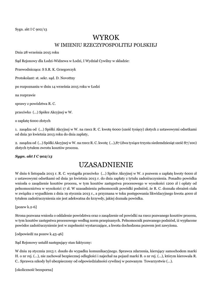 Sygn. akt I C 902/13 WYROK W IMIENIU RZECZYPOSPOLITEJ POLSKIEJ Dnia 28 września 2015 roku Sąd Rejonowy dla Łodzi-Widzewa w Łodzi, I Wydział Cywilny w składzie: Przewodnicząca: S S.R. K. Grzegorczyk Protokolant: st. sekr. sąd. D. Novottny po rozpoznaniu w dniu 14 września 2015 roku w Łodzi na rozprawie sprawy z powództwa R. C. przeciwko (...) Spółce Akcyjnej w W. o zapłatę 6000 złotych 1. zasądza od (...) Spółki Akcyjnej w W. na rzecz R. C. kwotę 6000 (sześć tysięcy) złotych z ustawowymi odsetkami od dnia 30 kwietnia 2013 roku do dnia zapłaty, 2. zasądza od (...) Spółki Akcyjnej w W. na rzecz R. C. kwotę (...),87 (dwa tysiące trzysta siedemdziesiąt sześć 87/100) złotych tytułem zwrotu kosztów procesu. Sygn. akt I C 902/13 UZASADNIENIE W dniu 6 listopada 2013 r. R. C. wystąpiła przeciwko (...) Spółce Akcyjnej w W. z pozwem o zapłatę kwoty 6000 zł z ustawowymi odsetkami od dnia 30 kwietnia 2013 r. do dnia zapłaty z tytułu zadośćuczynienia. Ponadto powódka wniosła o zasądzenie kosztów procesu, w tym kosztów zastępstwa procesowego w wysokości 1200 zł i opłaty od pełnomocnictwa w wysokości 17 zł. W uzasadnieniu pełnomocnik powódki podniósł, że R. C. doznała obrażeń ciała w związku z wypadkiem z dnia 19 stycznia 2013 r., a przyznana w toku postępowania likwidacyjnego kwota 4000 zł tytułem zadośćuczynienia nie jest adekwatna do krzywdy, jakiej doznała powódka. [pozew k.2-6] Strona pozwana wniosła o oddalenie powództwa oraz o zasądzenie od powódki na rzecz pozwanego kosztów procesu, w tym kosztów zastępstwa procesowego według norm przepisanych. Pełnomocnik pozwanego podniósł, iż wypłacone powódce zadośćuczynienie jest w zupełności wystarczające, a kwota dochodzona pozwem jest zawyżona. [odpowiedź na pozew k.43-46] Sąd Rejonowy ustalił następujący stan faktyczny: W dniu 19 stycznia 2013 r. doszło do wypadku komunikacyjnego. Sprawca zdarzenia, kierujący samochodem marki H. o nr rej. (...), nie zachował bezpiecznej odległości i najechał na pojazd marki B. o nr rej. (...), którym kierowała R. C.. Sprawca szkody był ubezpieczony od odpowiedzialności cywilnej w pozwanym Towarzystwie (...). [okoliczność bezsporna] Przed wypadkiem powódka była osobą zdrową. Nie miała problemów z kręgosłupem. [dowód: zeznania powódki k.164-165] W wyniku wypadku z dnia 19 stycznia 2013 r. powódka doznała skręcenia, naderwania, naciągnięcia więzadeł i mięśni odcinka szyjnego i lędźwiowo-krzyżowego kręgosłupa bez zmian kostnych pourazowych oraz złamania III kości śródręcza prawego. [dowód: pisemna opinia biegłego sądowego ortopedy k.121-125, pisemna opinia biegłego sądowego neurologa k.136-137] Zarówno z ortopedycznego, jak i neurologicznego punktu widzenia powódka nie doznała żadnego trwałego ani długotrwałego uszczerbku na zdrowiu. Nie było zmian kostnych pourazowych ani zwichnięć w zakresie kręgosłupa szyjnego. Nie ma jego ruchomości w zakresie rotacji lub zginania powyżej 20ᵒ. Nie rozpoznano również objawów powikłań korzeniowych. Leczenie powódki trwało 6 miesięcy, co oznacza, że dolegliwości nie były długotrwałe. Zakres cierpień fizycznych i psychicznych powódki z powodu przebytego wypadku był umiarkowany przez ok. 2 miesiące po wypadku. Powódka odczuwała wówczas dolegliwości bólowe kręgosłupa szyjnego z niewielkim ograniczeniem jego ruchomości przy skrajnych skrętach w prawo. Nie wymagało to długiego unieruchomienia szyi. Wystarczały leki przeciwbólowe, stosowane doraźnie przez kilka miesięcy oraz rehabilitacja. Dolegliwości te stopniowo ustępują i są niewielkie. Nie mają też obecnie wpływu na dalsze funkcjonowanie organizmu powódki. Powódka nie wymagała hospitalizacji ani leczenia operacyjnego. Miała zlecone przez lekarza (...) unieruchomienie szyi miękkim kołnierzem ortopedycznym, z którego korzystała przez 21 dni. Mogła samodzielnie się poruszać. Była zdolna do samoobsługi w zakresie podstawowej pielęgnacji. Nie wymagała zatem pomocy osób trzecich. Ponadto u powódki nie zachodziła potrzeba wykonania badań diagnostycznych TK i MR kręgosłupa szyjnego, co jest konieczne w przypadku wystąpienia objawów dyskopatii pourazowej kręgosłupa. Rokowania na przyszłość co do stanu zdrowia powódki są pomyślne ze względu na brak złamań, zwichnięć lub dyskopatii pourazowej kręgosłupa po wypadku. Dolegliwości powódki obecnie związane są z okresowym zespołem bólowym korzeniowym szyjnym bez istotnego ograniczenia ruchomości kręgosłupa. Biorąc pod uwagę młody wiek powódki, obecny stan jej zdrowia powinien ulegać stopniowej poprawie po dalszym leczeniu rehabilitacyjnym. [dowód: dokumentacja medyczna k.10-37, 73, 78, 81 i 85-86, pisemna opinia biegłego sądowego ortopedy k.121-125, pisemna opinia biegłego sądowego neurologa k.136-137] Po wypadku powódka rehabilitowała się przez ponad rok. W maju 2013 r. zaszła w ciążę i musiała zaprzestać inwazyjnych sposobów rehabilitacji. Po urodzeniu dziecka ustaliła z rehabilitantką, że będzie ćwiczyła w domu, co czyni do tej pory. Po wypadku powódka była na zwolnieniu lekarskim do maja 2013 r. Później była na zwolnieniu z uwagi na ciążę. Obecnie skarży się na bóle kręgosłupa, kiedy dłużej jest pochylona, np. podczas kąpieli dziecka. Później nie może się wyprostować. Nie stosuje leków przeciwbólowych, albowiem zazwyczaj pomagają wtedy ćwiczenia. Przed wypadkiem dużo jeździła na rowerze ze starszym synem. Obecnie po dłuższej jeździe na rowerze boli ją kręgosłup. Do chwili obecnej czuje również, że ma słabszą prawą rękę, w której było złamanie. Nie może nią podnosić niczego cięższego. Po wypadku, kiedy wsiadała do samochodu, powódka miała wrażenie, że za chwilę wyjedzie inny samochód i w nią uderzy. Była na 4 wizytach u psychologa, po raz ostatni w lipcu 2013 r. Początkowo ni