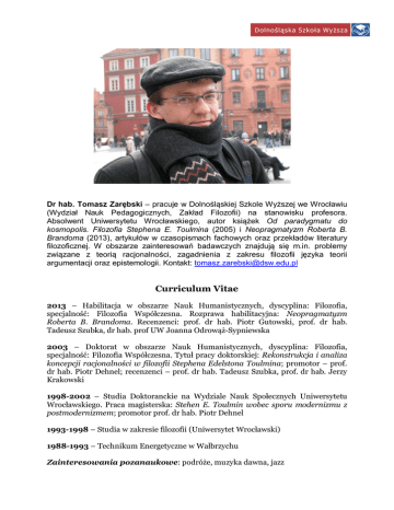 Dr hab. Tomasz Zarębski – pracuje w Dolnośląskiej Szkole Wyższej we Wrocławiu (Wydział Nauk Pedagogicznych, Zakład Filozofii) na stanowisku profesora. Absolwent Uniwersytetu Wrocławskiego, autor książek Od paradygmatu do kosmopolis. Filozofia Stephena E. Toulmina (2005) i Neopragmatyzm Roberta B. Brandoma (2013), artykułów w czasopismach fachowych oraz przekładów literatury filozoficznej. W obszarze zainteresowań badawczych znajdują się m.in. problemy związane z teorią racjonalności, zagadnienia z zakresu filozofii języka teorii argumentacji oraz epistemologii. Kontakt: [email protected] Curriculum Vitae 2013 – Habilitacja w obszarze Nauk Humanistycznych, dyscyplina: Filozofia, specjalność: Filozofia Współczesna. Rozprawa habilitacyjna: Neopragmatyzm Roberta B. Brandoma. Recenzenci: prof. dr hab. Piotr Gutowski, prof. dr hab. Tadeusz Szubka, dr hab. prof UW Joanna Odrowąż-Sypniewska 2003 – Doktorat w obszarze Nauk Humanistycznych, dyscyplina: Filozofia, specjalność: Filozofia Współczesna. Tytuł pracy doktorskiej: Rekonstrukcja i analiza koncepcji racjonalności w filozofii Stephena Edelstona Toulmina; promotor – prof. dr hab. Piotr Dehnel; recenzenci – prof. dr hab. Tadeusz Szubka, prof. dr hab. Jerzy Krakowski 1998-2002 – Studia Doktoranckie na Wydziale Nauk Społecznych Uniwersytetu Wrocławskiego. Praca magisterska: Stehen E. Toulmin wobec sporu modernizmu z postmodernizmem; promotor prof. dr hab. Piotr Dehnel 1993-1998 – Studia w zakresie filozofii (Uniwersytet Wrocławski) 1988-1993 – Technikum Energetyczne w Wałbrzychu Zainteresowania pozanaukowe: podróże, muzyka dawna, jazz Lista publikacji 2013 - NOEOPRAGMATYZM ROBERTA B. BRANDOMA, seria: Horyzonty Nowoczesności, UNIVERSITAS, Kraków 2013, ss. 378 (monografia) - Hegelian Background of Brandom’s Account of Logic, „Hegel-Jahrbuch”, vol. 19, no 1, pp. 285-290 (artykuł) - Epistemologiczny statut danych zmysłowych i wiedzy bezpośredniej w filozofii G. E. Moore’a, „FILOZOFIA NAUKI”, nr 2(82), 2013, s. 99-116 (artykuł) - Od logiki dobrych racji do nowej kazuistyki. Wątki Wittgensteinowskie w metaetyce Stephena Toulmina [w:] ETYKA U SCHYŁKU DRUGIEGO TYSIĄCLECIA, red. J. Ziobrowski, Wydawnictwo Naukowe Scholar, Warszawa 2013, s. 150-163 (rozdział w monografii) - The question of the essence of language: an inferentialist reading of Rhees’ critique of Wittgenstein [w:] GEIST, SPRACHE UND HANDLUNG / MIND, LANGUAGE AND ACTION: Papers of the 36th International Wittgenstein Symposium, (ed.) D. MoyalSharrock, V. A. Munz, A. Coliva (Hrsg.), The Austrian Ludwig Wittgenstein Society, Kirchberg am Wechsel 2013, s. 468-470 (materiały konferencyjne). 2012 - Sigmund Ongstad, Koncepcja świata życia a edukacja w ponowoczesności. Krytyczne omówienie Habermasowskiej teorii działania komunikacyjnego [w:] HABERMAS A TEORIA KRYTYCZNA I EDUKACJA, red. M. Murphy, T. Fleming, Wydawnictwo Naukowe Dolnośląskiej Szkoły Wyższej, Wrocław 2012, s. 59-77 (przekład) - Raymond A. Morrow, Habermas, europocentryzm i edukacja. Spór o wiedzę tubylczą [w:] HABERMAS A TEORIA KRYTYCZNA I EDUKACJA, red. M. Murphy, T. Fleming, Wydawnictwo Naukowe Dolnośląskiej Szkoły Wyższej, Wrocław 2012, s. 78-94 (przekład) 2011 - Intersubiektywność i obiektywność w kontekście inferencjalizmu, „PRZEGLĄD FILOZOFICZNY – NOWA SERIA”, r. 20, 2011, nr 1 (77), s. 195-211. - Zazdaniowość i ekspresywizm w teorii prawdy. Analiza stanowiska Roberta B. Brandoma [w:] PRAWDA, red. D. Leszczyński, STUDIA SYSTEMATICA I, Wydawnictwo Uniwersytetu Wrocławskiego, Wrocław 2011, s. 279-294 (artykuł) - Gry językowe, jedność dyskursu i gra poszukiwania i podawania racji. Wittgenstein, Rhees i Brandom na temat istoty języka [w:] LUDWIG WITTGENSTEIN – KONTEKSTY I KONFRONTACJE, red. P. Dehnel, L. Rasiński, Wydawnictwo Naukowe DSW, Wrocław 2011, s. 89-109 (rozdział w monografii) - Alois Pichler, Problemy interpretacyjne Dociekań filozoficznych Wittgensteina: styl, terapia i Nachlass [w:] LUDWIG WITTGENSTEIN – KONTEKSTY I KONFRONTACJE, red. P. Dehnel, L. Rasiński, Wydawnictwo Naukowe DSW, Wrocław 2011, s. 119-141 (przekład) 2010 - O pojęciu języka i roli reguł u późnego Wittgensteina: Cavell versus Pole, „PRINCIPIA” nr 53/2010, s. 49-66 (artykuł) - Pojęcie referencji anaforycznej w filozofii języka Roberta B. Brandoma [w:] DESKRYPCJE I PRAWDA, Biblioteka Myśli Semiotycznej t. 51, Znak – Język – Rzeczywistość, Polskie Towarzystwo Semiotyczne, red. J. Pelc, Warszawa 2010, s. 73-91 (rozdział w monografii) - Sellars i McDowell o percepcji i wiedzy empirycznej [w:] PERCEPCJA. MIĘDZY ESTETYKĄ A EPISTEMOLOGIĄ, red. R. Konik, D. Leszczyński, seria: Biblioteka STUDIA PHILOSOPHICA WRATISLAVIENSIA, Wrocław 2010, s. 77-96 (rozdział w monografii) - Dziedziny argumenty a relatywizm. Toulminowski model argumentacji w kontekście głosów krytycznych [w:] ARGUMENTACJA I RACJONALNA ZMIANA PRZEKONAŃ, DiaLogikon, Wydawnictwo Uniwersytetu Jagiellońskiego, red. W. Suchoń, I. TrzcienieckaSchneider, D. Kowalski, Kraków 2010, s. 119-132 (rozdział w monografii) - Stephen E. Toulmin (1922-2009), „STUDIA PHILOSOPHICA WRATISLAVIENSIA”, vol. V, fasc. 1/2010, s. 15-23 2009 - Toulmin’s Model of Argument and the ‘Logic’ of Scientific Discovery, “STUDIES IN LOGIC, GRAMMAR AND RHETORIC”: Informal Logic and Argumentation Theory, red. M. Koszowy, nr 16(29)/2009, s. 267-283 (artykuł) - Robert B. Brandom, Between Saying and Doing. Towards Analytic Pragmatism (Oxford 2008)”, „RUCH FILOZOFICZNY” LXVI, 2/2009, s. 373-383 (recenzja) - John Searle, Ontologia społeczna. Niektóre podstawowe zasady [w:] JĘZYK-DYSKURSSPOŁECZEŃSTWO, red. L. Rasiński, PWN, Warszawa 2009, s. 282-303 (przekład) - Stanley Cavell, Dygresja o Wittgensteinowskiej wizji języka [w:] WITTGENSTEIN: NOWE SPOJRZENIE, Wydawnictwo Naukowe DSW, red. A. Crary/wyd. pol. P. Dehnel, s. 33-53 (przekład) - David Finkelst