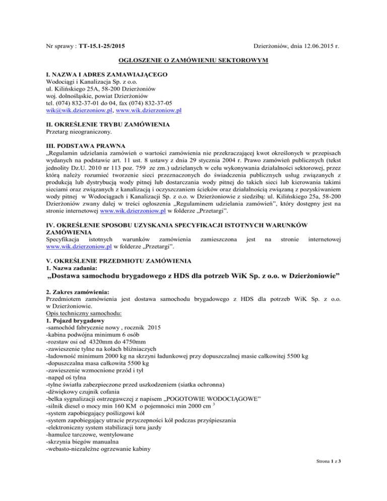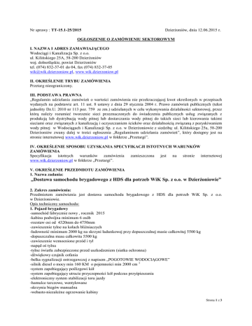 Nr sprawy : TT-15.1-25/2015 Dzierżoniów, dnia 12.06.2015 r. OGŁOSZENIE O ZAMÓWIENIU SEKTOROWYM I. NAZWA I ADRES ZAMAWIAJĄCEGO Wodociągi i Kanalizacja Sp. z o.o. ul. Kilińskiego 25A, 58-200 Dzierżoniów woj. dolnośląskie, powiat Dzierżoniów tel. (074) 832-37-01 do 04, fax (074) 832-37-05 [email protected], www.wik.dzierzoniow.pl II. OKREŚLENIE TRYBU ZAMÓWIENIA Przetarg nieograniczony. III. PODSTAWA PRAWNA „Regulamin udzielania zamówień o wartości zamówienia nie przekraczającej kwot określonych w przepisach wydanych na podstawie art. 11 ust. 8 ustawy z dnia 29 stycznia 2004 r. Prawo zamówień publicznych (tekst jednolity Dz.U. 2010 nr 113 poz. 759 ze zm.) udzielanych w celu wykonywania działalności sektorowej, przez którą należy rozumieć tworzenie sieci przeznaczonych do świadczenia publicznych usług związanych z produkcją lub dystrybucją wody pitnej lub dostarczania wody pitnej do takich sieci lub kierowania takimi sieciami oraz związanych z kanalizacją i oczyszczaniem ścieków oraz działalnością związaną z pozyskiwaniem wody pitnej w Wodociągach i Kanalizacji Sp. z o.o. w Dzierżoniowie z siedzibą: ul. Kilińskiego 25a, 58-200 Dzierżoniów zwany dalej w treści ogłoszenia „Regulaminem udzielania zamówień”, który dostępny jest na stronie internetowej www.wik.dzierzoniow.pl w folderze „Przetargi”. IV. OKREŚLENIE SPOSOBU UZYSKANIA SPECYFIKACJI ISTOTNYCH WARUNKÓW ZAMÓWIENIA Specyfikacja istotnych warunków zamówienia zamieszczona jest na stronie internetowej www.wik.dzierzoniow.pl w folderze „Przetargi”. V. OKREŚLENIE PRZEDMIOTU ZAMÓWIENIA 1. Nazwa zadania: „Dostawa samochodu brygadowego z HDS dla potrzeb WiK Sp. z o.o. w Dzierżoniowie” 2. Zakres zamówienia: Przedmiotem zamówienia jest dostawa samochodu brygadowego z HDS dla potrzeb WiK Sp. z o.o. w Dzierżoniowie. Opis techniczny samochodu: 1. Pojazd brygadowy -samochód fabrycznie nowy , rocznik 2015 -kabina podwójna minimum 6 osób -rozstaw osi od 4320mm do 4750mm -zawieszenie tylne na kołach bliźniaczych -ładowność minimum 2000 kg na skrzyni ładunkowej przy dopuszczalnej masie całkowitej 5500 kg -dopuszczalna masa całkowita 5500 kg -zawieszenie wzmocnione przód i tył -napęd oś tylna -tylne światła zabezpieczone przed uszkodzeniem (siatka ochronna) -dźwiękowy czujnik cofania -belka sygnalizacji ostrzegawczej z napisem „POGOTOWIE WODOCIĄGOWE” -silnik diesel o mocy min 160 KM o pojemności min 2000 cm 3 -system zapobiegający poślizgowi kół -system zapobiegający utracie przyczepności kół podczas przyśpieszania -elektroniczny system stabilizacji toru jazdy -hamulce tarczowe, wentylowane -skrzynia biegów manualna -webasto-niezależne ogrzewanie kabiny Strona 1 z 3 -poduszka bezpieczeństwa kierowcy -tylna ściana bez okna -hak holowniczy na min 2500 kg -4 drzwi boczne -lusterka z kierunkowskazami, lusterka elektryczne regulowane, lusterka na dużych pałąkach -hydrauliczne wspomaganie układu kierowniczego -immobilizer -centralny zamek sterowany pilotem -szyby sterowane elektrycznie -fotel kierowcy z pełną regulacją -2 kliny pod koła -koło zapasowe z koszem mocującym i zestawem narzędzi z podnośnikiem -wyłącznik główny akumulatora -klimatyzacja -tachograf cyfrowy -opony wielosezonowe wzmocnione, dostosowane do nośności pojazdu -norma emisji spalin zgodna z przepisami -kolor nadwozia granatowy -chodniki gumowe podłogowe w kabinie kierowcy -pokrowce na siedzenia -zawieszenie przednie niezależne zawieszenie kół, poprzeczny resor piórowy, amortyzatory wahacze poprzeczne, stabilizator, zawieszenie stalowe, zawieszenie wzmocnione -zawieszenie tylne oś sztywna zawieszona na resorach piórowych, amortyzatory, koła bliźniacze, zawieszenie wzmocnione 2. Zabudowa a)skrzynia ładunkowa -skrzynia ładunkowa długość minimalna 2700mm szerokość od 1900 do 2100 mm -stalowa typu wywrotka, wysokość burt minimum 400 mm, burty stalowe , podłoga stalowa otwierane z trzech stron ,wywrot trójstronny z siłownikiem pod podłogą sterowany z kabiny kierowcy -słupki boczne wypinane -skrzynka narzędziowa zamykana na klucz zlokalizowana w okolicy ramy -oświetlenie obrysowe zgodnie z przepisami ruchu drogowego -nad kołami nadkola z tworzywa sztucznego z fartuchami -rama przygotowana do montażu żurawia za kabiną b) żuraw hydrauliczny HDS -umieszczony za kabiną -sterowany z panela i pilota (zasięg min 20m) - wykonany z wysokiej jakości stali -kontrola stabilności żurawia -system informujący o złożeniu nóg do pozycji transportowej -czujnik sprawdzający złożenie żurawia do pozycji transportowej -rozdzielacz umożliwiający prawidłową precyzję pracy -dwa ramiona wysuwane hydraulicznie -kąt obrotu min.330 stopni -nogi podporowe -belki nóg podporowych wysuwane hydraulicznie na boki -nogi podporowe opuszczane i podnoszone hydraulicznie, nogi podporowe obracane, -na końcu wysięgnika hak i uchwyt(widły) do palety -maksymalny zasięg min 3,20 m -minimalny udźwig na maksymalnym zasięgu min 800 kg , -katalog części zamiennych przeszkolenie w zakresie obsługi urządzenia, -instrukcja w języku polskim -certyfikat CE Wymagany okres gwarancji liczony od daty odbioru wynosi min 36 miesięcy i na nieprzerdzewienie nadwozia min 12 lat. Strona 2 z 3 Koszty dostawy samochodu loco WiK Sp. z o.o. w Dzierżoniowie, ul. Kilińskiego 25A ponosi Wykonawca. Wybór ubezpieczyciela leży po stronie Zamawiającego. Zamówienie sfinalizowane zostanie przez wybrane przez Zamawiającego przedstawicielstwo leasingowe. VI. OPIS CZĘŚCI ZAMÓWIENIA, JEŻELI ZAMAWIAJĄCY DOPUSZCZA SKŁADANIE OFERT CZĘŚCIOWYCH. Zamawiający nie dopuszcza składania ofert częściowych. VII. INFORMACJA O MOŻLIWOŚCI ZŁOŻENIA OFERTY WARIANTOWEJ Zamawiający nie dopuszcza składania ofert wariantowych. Oferta alternatywna (wariantowa) nie będzie brana pod uwagę i zostanie odrzucona wraz z ofertą podstawową. VIII. TERMIN WYKONANIA ZAMÓWIENIA Wymagany 