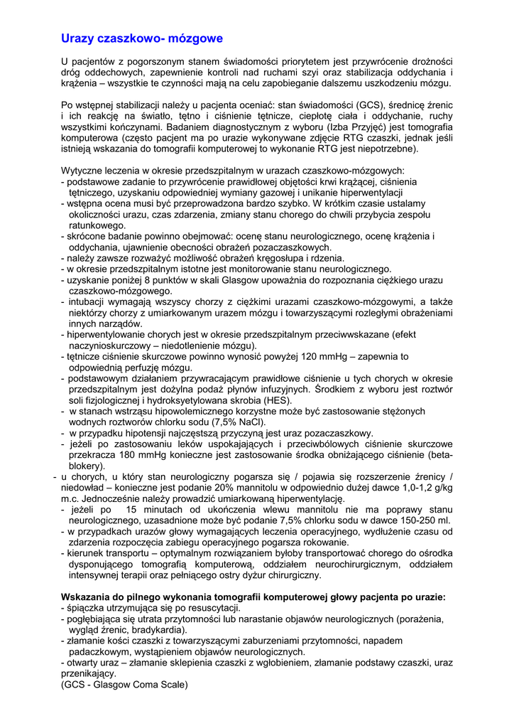 Urazy czaszkowo- mózgowe U pacjentów z pogorszonym stanem świadomości priorytetem jest przywrócenie droŜności dróg oddechowych, zapewnienie kontroli nad ruchami szyi oraz stabilizacja oddychania i krąŜenia – wszystkie te czynności mają na celu zapobieganie dalszemu uszkodzeniu mózgu. Po wstępnej stabilizacji naleŜy u pacjenta oceniać: stan świadomości (GCS), średnicę źrenic i ich reakcję na światło, tętno i ciśnienie tętnicze, ciepłotę ciała i oddychanie, ruchy wszystkimi kończynami. Badaniem diagnostycznym z wyboru (Izba Przyjęć) jest tomografia komputerowa (często pacjent ma po urazie wykonywane zdjęcie RTG czaszki, jednak jeśli istnieją wskazania do tomografii komputerowej to wykonanie RTG jest niepotrzebne). Wytyczne leczenia w okresie przedszpitalnym w urazach czaszkowo-mózgowych: - podstawowe zadanie to przywrócenie prawidłowej objętości krwi krąŜącej, ciśnienia tętniczego, uzyskaniu odpowiedniej wymiany gazowej i unikanie hiperwentylacji - wstępna ocena musi być przeprowadzona bardzo szybko. W krótkim czasie ustalamy okoliczności urazu, czas zdarzenia, zmiany stanu chorego do chwili przybycia zespołu ratunkowego. - skrócone badanie powinno obejmować: ocenę stanu neurologicznego, ocenę krąŜenia i oddychania, ujawnienie obecności obraŜeń pozaczaszkowych. - naleŜy zawsze rozwaŜyć moŜliwość obraŜeń kręgosłupa i rdzenia. - w okresie przedszpitalnym istotne jest monitorowanie stanu neurologicznego. - uzyskanie poniŜej 8 punktów w skali Glasgow upowaŜnia do rozpoznania cięŜkiego urazu czaszkowo-mózgowego. - intubacji wymagają wszyscy chorzy z cięŜkimi urazami czaszkowo-mózgowymi, a takŜe niektórzy chorzy z umiarkowanym urazem mózgu i towarzyszącymi rozległymi obraŜeniami innych narządów. - hiperwentylowanie chorych jest w okresie przedszpitalnym przeciwwskazane (efekt naczynioskurczowy – niedotlenienie mózgu). - tętnicze ciśnienie skurczowe powinno wynosić powyŜej 120 mmHg – zapewnia to odpowiednią perfuzję mózgu. - podstawowym działaniem przywracającym prawidłowe ciśnienie u tych chorych w okresie przedszpitalnym jest doŜylna podaŜ płynów infuzyjnych. Środkiem z wyboru jest roztwór soli fizjologicznej i hydroksyetylowana skrobia (HES). - w stanach wstrząsu hipowolemicznego korzystne moŜe być zastosowanie stęŜonych wodnych roztworów chlorku sodu (7,5% NaCl). - w przypadku hipotensji najczęstszą przyczyną jest uraz pozaczaszkowy. - jeŜeli po zastosowaniu leków uspokajających i przeciwbólowych ciśnienie skurczowe przekracza 180 mmHg konieczne jest zastosowanie środka obniŜającego ciśnienie (betablokery). - u chorych, u który stan neurologiczny pogarsza się / pojawia się rozszerzenie źrenicy / niedowład – konieczne jest podanie 20% mannitolu w odpowiednio duŜej dawce 1,0-1,2 g/kg m.c. Jednocześnie naleŜy prowadzić umiarkowaną hiperwentylację. - jeŜeli po 15 minutach od ukończenia wlewu mannitolu nie ma poprawy stanu neurologicznego, uzasadnione moŜe być podanie 7,5% chlorku sodu w dawce 150-250 ml. - w przypadkach urazów głowy wymagających leczenia operacyjnego, wydłuŜenie czasu od zdarzenia rozpoczęcia zabiegu operacyjnego pogarsza rokowanie. - kierunek transportu – optymalnym rozwiązaniem byłoby transportować chorego do ośrodka dysponującego tomografią komputerową, oddziałem neurochirurgicznym, oddziałem intensywnej terapii oraz pełniącego ostry dyŜur chirurgiczny. Wskazania do pilnego wykonania tomografii komputerowej głowy pacjenta po urazie: - śpiączka utrzymująca się po resuscytacji. - pogłębiająca się utrata przytomności lub narastanie objawów neurologicznych (poraŜenia, wygląd źrenic, bradykardia). - złamanie kości czaszki z towarzyszącymi zaburzeniami przytomności, napadem padaczkowym, wystąpieniem objawów neurologicznych. - otwarty uraz – złamanie sklepienia czaszki z wgłobieniem, złamanie podstawy czaszki, uraz przenikający. (GCS - Glasgow Coma Scale)