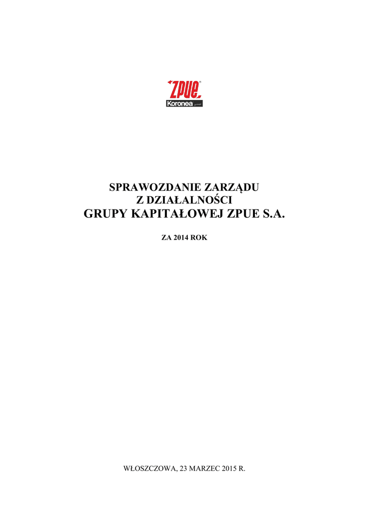 SPRAWOZDANIE ZARZĄDU Z DZIAŁALNOŚCI GRUPY KAPITAŁOWEJ ZPUE S.A. ZA 2014 ROK WŁOSZCZOWA, 23 MARZEC 2015 R. SPRAWOZDANIE ZARZĄDU Z DZIAŁALNOŚCI GRUPY KAPITAŁOWEJ ZPUE S.A. W 2014 ROKU SPIS TREŚCI 1. INFORMACJE O SPÓŁKACH WCHODZĄCYCH W SKŁAD GRUPY KAPITAŁOWEJ ................................ 4 1.1 1.2 JEDNOSTKA DOMINUJĄCA – ZPUE S.A. ...............................................................................................................................4 JEDNOSTKI ZALEŻNE............................................................................................................................................................6 1.2.1 1.2.2 1.2.3 1.2.4 1.2.5 1.2.6 ZPUE Silesia sp. z o.o. .................................................................................................................... 6 ZPUE Concrete sp. z o.o. ................................................................................................................ 6 ZPUE Nord sp. z o.o........................................................................................................................ 7 ZPUE Elektroinstal sp. z o.o............................................................................................................. 8 ZPUE EOP sp. z o.o. ........................................................................................................................ 8 Inne podmioty zależne – nieobjęte konsolidacją ............................................................................. 9 2. OPIS ORGANIZACJI GRUPY KAPITAŁOWEJ ZPUE S.A. ................................................................................. 9 2.1 2.2 2.3 STRUKTURA GRUPY KAPITAŁOWEJ ZPUE S.A. ...................................................................................................................9 PRZEDMIOT DZIAŁALNOŚCI GRUPY KAPITAŁOWEJ .............................................................................................................11 UDZIAŁY W INNYCH PODMIOTACH .....................................................................................................................................12 3. WARTOŚĆ WYNAGRODZEŃ WYPŁACONYCH OSOBOM NADZORUJĄCYM I ZARZĄDZAJACYM EMITENTA................................................................................................................................................................ 12 3.1.1 3.1.2 3.1.3 Wynagrodzenia Rady Nadzorczej ZPUE S.A. ............................................................................... 12 Wynagrodzenia osób zarządzających i prokurentów w ZPUE S.A. .............................................. 12 Wynagrodzenia osób nadzorujących, zarządzających oraz prokurentów w spółkach zależnych .. 14 4. INWESTYCJE ............................................................................................................................................................. 15 5. PROGNOZA WYNIKÓW FINANSOWYCH .......................................................................................................... 15 6. AKCJE I UDZIAŁY W ZPUE S.A. ORAZ W JEDNOSTKACH POWIĄZANYCH BĘDĄCE W POSIADANIU OSÓB NADZORUJĄCYCH ..................................................................................................................................... 16 7. AKCJE SPÓŁKI BĘDĄCE W POSIADANIU OSÓB ZARZĄDZAJĄCYCH ...................................................... 16 8. EMISJE PAPIERÓW WARTOŚCIOWYCH ........................................................................................................... 16 9. DYWIDENDA .............................................................................................................................................................. 16 10. NAGRODY, WYRÓŻNIENIA ................................................................................................................................... 17 11. ZATRUDNIENIE ........................................................................................................................................................ 18 12. RYNKI ZBYTU, ŹRÓDŁA ZAOPATRZENIA, UZALEŻNIENIE OD ODBIORCÓW I DOSTAWCÓW....... 21 13. SPRZEDAŻ .................................................................................................................................................................. 23 14. ZNACZĄCE UMOWY DLA DZIAŁALNOŚCI EMITENTA ................................................................................ 24 14.1 UMOWY SPRZEDAŻY I ZAKUPÓW PRODUKTÓW I USŁUG ORAZ UMOWY WSPÓŁPRACY ...........................................................24 14.2 UMOWY DOTYCZĄCE POZYSKANIA FINANSOWANIA Z FUNDUSZY EUROPEJSKICH .................................................................24 14.3 UMOWY NABYCIA AKCJI/UDZIAŁÓW SPÓŁEK ORAZ DOTYCZĄCE WNIESIENIA AKCJI I UDZIAŁÓW DO ZPUE S.A. ..................25 15. ZACIĄGNIĘTE KREDYTY, UMOWY POŻYCZKI, GWARANCJE .................................................................. 26 15.1 UMOWY FINANSOWE ZPUE S.A. .......................................................................................................................................26 15.2 UMOWY FINANSOWE SPÓŁEK GRUPY KAPITAŁOWEJ ZPUE S.A. ........................................................................................30 15.2.1 15.2.2 15.2.3 15.2.4 15.2.5 15.2.6 15.2.7 15.2.8 Umowy finansowe spółki ZPUE Silesia Sp. z o.o. .................................................................... 30 Umowy finansowe spółki ZPUE Gliwice Sp. z o.o. .................................................................. 31 Umowy finansowe spółki ZPUE Katowice S.A. ........................................................................ 31 Umowy finansowe spółki ZPUE Poles Sp. z o.o. ...................................................................... 31 Umowy finansowe spółki ZPUE Tools Sp. z o.o. .....................................................................