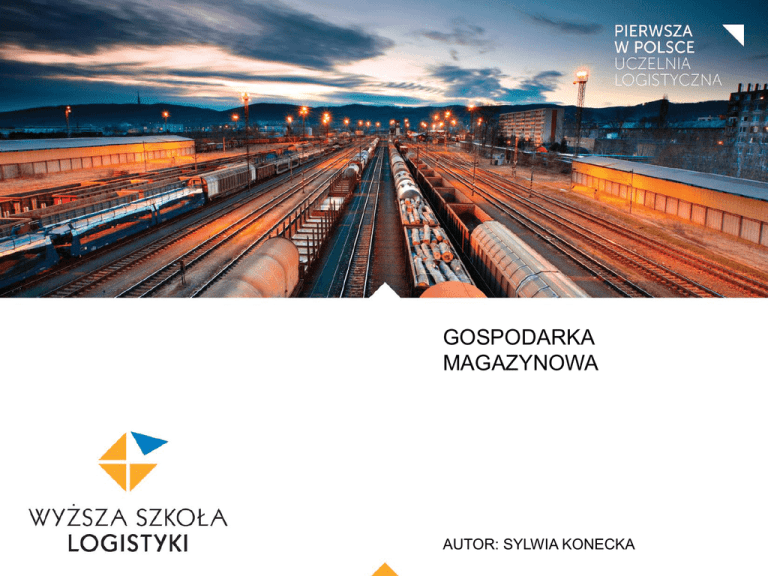 1 GOSPODARKA MAGAZYNOWA TYTUŁ PREZENTACJI: GOSPODARKA MAGAZYNOWA AUTOR: SYLWIA KONECKA AUTOR: SYLWIA KONECKA GOSPODARKA MAGAZYNOWA GOSPODARKA MAGAZYNOWA TO Działalność obejmująca zespół środków, czynności organizacyjnych, technicznych i zadań ekonomicznych związanych z przechowywaniem zapasów magazynowych. Przez zapas magazynowy rozumie się taką ilość dóbr materialnych, które gromadzone w magazynie zapewniają prawidłową i rytmiczną działalność handlową, usługową czy produkcyjną. TYTUŁ PREZENTACJI: GOSPODARKA MAGAZYNOWA AUTOR: SYLWIA KONECKA GOSPODARKA MAGAZYNOWA MAGAZYN TO Jednostka funkcjonalno-organizacyjna przeznaczona do magazynowania dóbr materialnych (zapasów) w wyodrębnionej przestrzeni budowli magazynowej według ustalonej technologii, wyposażona w odpowiednie urządzenia i środki techniczne, zarządzana i obsługiwana przez zespół ludzi. Według polskiej normy PN-84/N-01800 TYTUŁ PREZENTACJI: GOSPODARKA MAGAZYNOWA AUTOR: SYLWIA KONECKA GOSPODARKA MAGAZYNOWA MAGAZYNOWANIE TO Zespół czynności związany z czasowym przyjmowaniem, składowaniem, przechowywaniem, kompletowaniem, przemieszczaniem, konserwacją, ewidencjonowaniem, kontrolowaniem i wydawaniem dóbr materialnych (zapasów), realizowanych przez etatowych pracowników magazynu, w przystosowanych do tego poszczególnych strefach magazynu i przy spełnieniu określonych warunków organizacyjnych procesu magazynowego. TYTUŁ PREZENTACJI: GOSPODARKA MAGAZYNOWA AUTOR: SYLWIA KONECKA GOSPODARKA MAGAZYNOWA DWA PODSTAWOWE CELE: Maksymalizacja wykorzystania przestrzeni składowej, Minimalizacja operacji – manipulacji wewnętrznych. TYTUŁ PREZENTACJI: GOSPODARKA MAGAZYNOWA AUTOR: SYLWIA KONECKA GOSPODARKA MAGAZYNOWA PODZIAŁ MAGAZYNÓW – MOŻLIWE PODEJŚCIA Ze względu na wpływ otoczenia magazyny dzielimy na: budowle otwarte, budowle półotwarte, budowle zamknięte. Ze względu na mobilność: magazyny stacjonarne, magazyny ruchome (polowe). Ze względu na wymogi składowania: magazyny materiałów niebezpiecznych, magazyny specjalistyczne. TYTUŁ PREZENTACJI: GOSPODARKA MAGAZYNOWA AUTOR: SYLWIA KONECKA GOSPODARKA MAGAZYNOWA PODZIAŁ MAGAZYNÓW – MOŻLIWE PODEJŚCIA Ze względu na postaci ładunków: magazyny jednostek ładunkowych, magazyny ładunków zbiornikowych, place składowe. Ze względu na przeznaczenie rozróżniamy: magazyny przemysłowe, magazyny sieci dystrybucyjnych, magazyny usługowe, magazyny rolnicze, magazyny spedycyjne, magazyny celne, magazyny rezerw państwowych. TYTUŁ PREZENTACJI: GOSPODARKA MAGAZYNOWA AUTOR: SYLWIA KONECKA GOSPODARKA MAGAZYNOWA PODZIAŁ MAGAZYNÓW – MOŻLIWE PODEJŚCIA Ze względu na rodzaj zapasów: • magazyny surowcowe, • magazyny produkcyjne, • magazyny produktów produkcji w toku, • magazyny części zamiennych, • magazyny materiałów pomocniczych, • magazyny ubiorów ochronnych i sprzętu ochrony osobistej, • magazyny wyrobów handlowych, • magazyny opakowań, • magazyny odpadów i inne. TYTUŁ PREZENTACJI: GOSPODARKA MAGAZYNOWA AUTOR: SYLWIA KONECKA GOSPODARKA MAGAZYNOWA TYPY MAGAZYNÓW ZE WZGLĘDU NA UKŁAD TECHNOLOGICZNY przepływie prostym = przelotowy, wejście wyjście przepływie powrotnym = workowy lub typu U, wejście wyjście przepływie kątowym: lewoskrętny lub prawoskrętny wyjście wejście wejście wyjście TYTUŁ PREZENTACJI: GOSPODARKA MAGAZYNOWA AUTOR: SYLWIA KONECKA GOSPODARKA MAGAZYNOWA FAZY MAGAZYNOWANIA przyjmowanie, składowanie, kompletacja, wydawanie. O możliwości realizacji tych czterech podstawowych faz magazynowania decyduje struktura magazynu. TYTUŁ PREZENTACJI: GOSPODARKA MAGAZYNOWA AUTOR: SYLWIA KONECKA GOSPODARKA MAGAZYNOWA PRZYKŁADOWA STRUKTURA MAGAZYNU 8 1 9 3 5 1 2 3 4 5 6 - rejon rejon rejon rejon rejon rejon 8 11 składowania kompletacji przyjmowania wydawania administracyjno - socjalny ładowania akumulatorów 2 4 9 10 6 7 8 9 10 11 7 - 5 rejon postoju środków transportu rejon ppoż rampa droga główna drogi technologiczne TYTUŁ PREZENTACJI: GOSPODARKA MAGAZYNOWA AUTOR: SYLWIA KONECKA GOSPODARKA MAGAZYNOWA FAZY MAGAZYNOWANIA Przyjmowanie obejmuje: rozładunek środków transportu, sortowanie, identyfikację, kontrolę ilościową i jakościową, przygotowanie towarów do składowania, przekazywanie dostawy do strefy składowania. TYTUŁ PREZENTACJI: GOSPODARKA MAGAZYNOWA AUTOR: SYLWIA KONECKA GOSPODARKA MAGAZYNOWA FAZY MAGAZYNOWANIA Składowanie obejmuje: odbiór towarów ze strefy przyjęć, rozmieszczenie towarów w strefach składowych podzielonych w zależności od: - typu jednostki ładunkowej w składowaniu, - wielkości obrotu grupy asortymentowej, - wymogów przechowalniczych, przekazanie towarów do strefy kompletacji. TYTUŁ PREZENTACJI: GOSPODARKA MAGAZYNOWA AUTOR: SYLWIA KONECKA GOSPODARKA MAGAZYNOWA FAZY MAGAZYNOWANIA Kompletacja to: przygotowanie jednostek ładunkowych dla potrzeb kompletacji, kompletowanie według zamówień, kontrola ilościowa, przemieszczenie do strefy wydań. TYTUŁ PREZENTACJI: GOSPODARKA MAGAZYNOWA AUTOR: SYLWIA KONECKA GOSPODARKA MAGAZYNOWA FAZY MAGAZYNOWANIA Wydawanie pakowanie i formowanie jednostek transportowych, kontrola wydania, przygotowanie do wysyłki, załadunek środków transportu. TYTUŁ PREZENTACJI: GOSPODARKA MAGAZYNOWA AUTOR: SYLWIA KONECKA GOSPODARKA MAGAZYNOWA METODY KOMPLETACJI ZAMÓWIEŃ „kompletujący do asortymentu” polega na gromadzeniu obok siebie poszczególnych asortymentów uczestniczących w procesie kompletacji, a pracownik kompletujący przechodzi od asortymentu do asortymentu, pobierając odpowiednie ilości zgodnie ze zleceniem oraz układa je na palecie lub w pojemniku zbiorczym. Po zrealizowaniu całego zlecenia paleta lub pojemnik zbiorczy są przemieszczane do strefy wydań. TYTUŁ PREZENTACJI: GOSPODARKA MAGAZYNOWA AUTOR: SYLWIA KONECKA GOSPODARKA MAGAZYNOWA METODY KOMPLETACJI ZAMÓWIEŃ „asortyment do kompletującego” polega na rozmieszczeniu w strefie kompletacyjnej stałych stanowisk k
