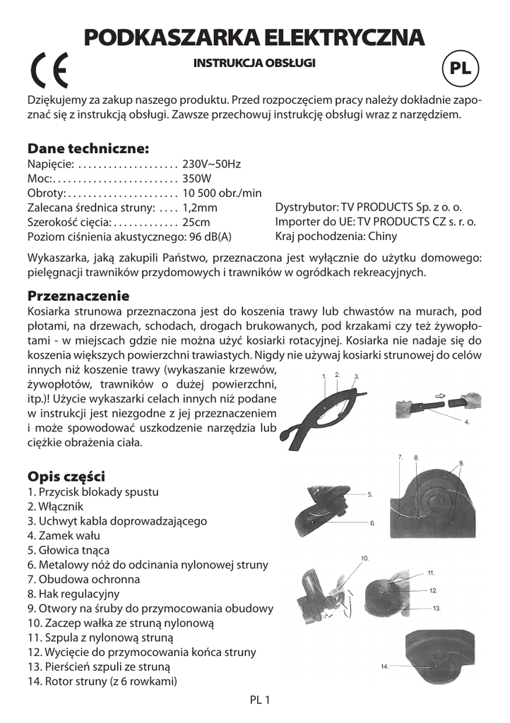 PODKASZARKA ELEKTRYCZNA INSTRUKCJA OBSŁUGI PL Dziękujemy za zakup naszego produktu. Przed rozpoczęciem pracy należy dokładnie zapoznać się z instrukcją obsługi. Zawsze przechowuj instrukcję obsługi wraz z narzędziem. Dane techniczne: Napięcie: . . . . . . . . . . . . . . . . . . . . 230V~50Hz Moc: . . . . . . . . . . . . . . . . . . . . . . . . . 350W Obroty: . . . . . . . . . . . . . . . . . . . . . . 10 500 obr./min Zalecana średnica struny: . . . . 1,2mm Szerokość cięcia: . . . . . . . . . . . . . 25cm Poziom ciśnienia akustycznego: 96 dB(A) Dystrybutor: TV PRODUCTS Sp. z o. o. Importer do UE: TV PRODUCTS CZ s. r. o. Kraj pochodzenia: Chiny Wykaszarka, jaką zakupili Państwo, przeznaczona jest wyłącznie do użytku domowego: pielęgnacji trawników przydomowych i trawników w ogródkach rekreacyjnych. Przeznaczenie Kosiarka strunowa przeznaczona jest do koszenia trawy lub chwastów na murach, pod płotami, na drzewach, schodach, drogach brukowanych, pod krzakami czy też żywopłotami - w miejscach gdzie nie można użyć kosiarki rotacyjnej. Kosiarka nie nadaje się do koszenia większych powierzchni trawiastych. Nigdy nie używaj kosiarki strunowej do celów innych niż koszenie trawy (wykaszanie krzewów, żywopłotów, trawników o dużej powierzchni, itp.)! Użycie wykaszarki celach innych niż podane w instrukcji jest niezgodne z jej przeznaczeniem i może spowodować uszkodzenie narzędzia lub ciężkie obrażenia ciała. Opis części 1. Przycisk blokady spustu 2. Włącznik 3. Uchwyt kabla doprowadzającego 4. Zamek wału 5. Głowica tnąca 6. Metalowy nóż do odcinania nylonowej struny 7. Obudowa ochronna 8. Hak regulacyjny 9. Otwory na śruby do przymocowania obudowy 10. Zaczep wałka ze struną nylonową 11. Szpula z nylonową struną 12. Wycięcie do przymocowania końca struny 13. Pierścień szpuli ze struną 14. Rotor struny (z 6 rowkami) PL 1 Zasady bezpieczeństwa • Osoby postronne (zwłaszcza dzieci) i zwierzęta nie powinny przebywać w promieniu 6m od miejsca koszenia. • Nigdy nie włączaj kosiarki, jeżeli w pobliżu znajdują się osoby postronne (zwłaszcza dzieci) lub zwierzęta domowe. • Kosiarkę trzymaj w miejscu niedostępnym dla dzieci. • Jeżeli choć na krótką chwilę* oddalasz się od urządzenia, zawsze najpierw wyłącz wykaszarkę z prądu. • Nigdy nie koś podczas deszczu! • Nigdy nie wykaszaj mokrej trawy! • Nigdy nie czyść wykaszarki wodą. • Zanim przystąpisz do jakichkolwiek prac konserwacyjnych, przed przystąpieniem do czyszczenia i transportem zawsze najpierw wyłącz kosiarkę i wyciągnij wtyczkę z gniazdka. • Osoby poniżej 18-go roku życia nie mogą obsługiwać wykaszarki. • Wszystkie osoby obsługujące kosiarkę muszą zapoznać się z niniejszą instrukcją obsługi. • Obsługując kosiarkę zachowaj zwiększoną ostrożność, a każdą czynność wykonuj uważnie i z rozwagą. Nie należy obsługiwać kosiarki, gdy jest się zmęczonym lub będąc pod wpływem narkotyków, alkoholu lub lekarstw. Moment nieuwagi może stać się przyczyną poważnych urazów ciała. • Uważaj na metalowy nóż do odcinania nylonowej struny. • Podczas pracy na nierównym, pochyłym terenie zachowaj zwiększoną ostrożność - istnieje możliwość poślizgu lub potknięcia się! Zwiększoną ostrożność zachowaj także podczas pracy w terenie, gdzie możesz natrafić na różnego typu przeszkody (pnie i korzenie, o które mógłbyś się potknąć). • Używaj wyłącznie oryginalnych części zapasowych. • Wszelkie naprawy powierzaj wyłącznie wykwalifikowanym pracownikom autoryzowanego punktu serwisowego. • Nigdy nie przenoś urządzenia trzymając za kabel elektryczny. • Zawsze przestrzegaj wszystkich wskazówek wymienionych w niniejszej instrukcji! • Błędy w przestrzeganiu poniższych wskazówek mogą spowodować uszkodzenie urządzenia i/lub ciężkie obrażenia ciała. • Nigdy nie włączaj kosiarki, jeżeli kabel doprowadzający jest w jakikolwiek sposób uszkodzony. • Przed każdym użyciem sprawdź, czy obudowa jest dobrze założona a wszystkie śruby są dokręcone. • Obsługując kosiarkę zawsze noś okulary ochronne. • Podczas pracy z kosiarką zawsze noś nauszniki. • Podczas pracy zawsze noś odpowiednią odzież roboczą, która nie krępuje ruchów. Noś długie spodnie i ochraniacze na nogi. • Noś odpowiednie obuwie ochronne z twardą podeszwą antypoślizgową. • Zawsze zajmuj stabilną bezpieczną pozycję a kosiarkę trzymaj oburącz. • Nylonowej struny używaj zgodnie z podanymi instrukcjami. • Nigdy nie koś podczas deszczu lub jeśli trawa jest mokra. • Podczas pracy z elektronarzędziem zawsze używaj wyłącznika różnicowo-prądowego (RCD) – max. 30 mA, wyłącznik różnicowoprądowy RCD zabezpiecza przed porażeniem prądem. • Używaj wyłącznie przedłużaczy przeznaczonych do użytku zewnętrznego. • Nigdy nie używaj więcej niż jednego przedłużacza. • Każdorazowo przed włączeniem kosiarki skontroluj stan kabla doprowadzającego i przedłużacza. W przypadku jakiegokolwiek uszkodzenia, nie używaj ich. • Nie zbliżaj palców ani nóg do rotującej struny. Uwaga! Pamiętaj, że struna się obraca (dobiega) także po wyłączeniu urządzenia. PL 2 Obsługa Długość struny tnącej • Przed włączeniem kosiarki sprawdź, czy napięcie z sieci odpowiada napięciu podanemu na tabliczce znamionowej umieszczonej na urządzeniu (230V). • Podczas pracy z kosiarką zwracaj uwagę na wyraźne zmiany rytmu pracy urządzenia, na przykład wibracje i głośne zachowanie. W takim przypadku natychmiast wyłącz kosiarkę i dobrze przytrzymaj. Przyciśnij kosiarkę do ziemi, żeby głowica tnąca się zatrzymała. Sprawdź kosiarkę, w razie potrzeby skontaktuj się z autoryzowanym punktem serwisowym. • Zawsze używaj uchwytu na kabel doprowadzający (3), żeby zapobiec przypadkowemu odłączeniu kabla. • Jeżeli kabel
