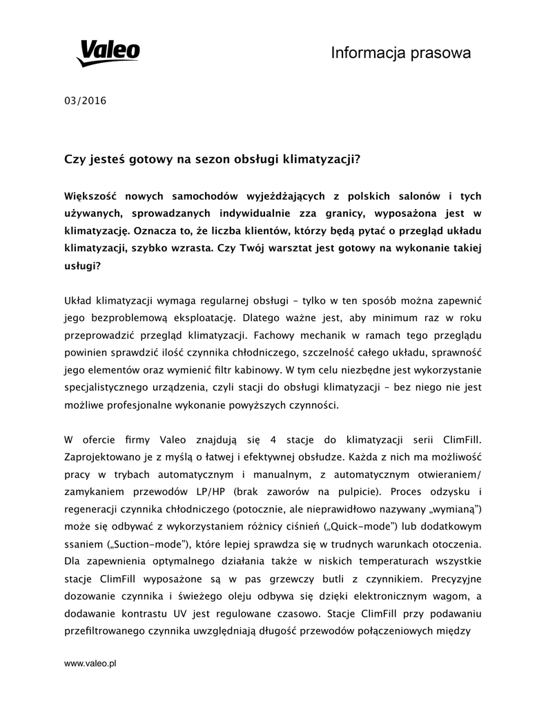 03/2016 Czy jesteś gotowy na sezon obsługi klimatyzacji? Większość nowych samochodów wyjeżdżających z polskich salonów i tych używanych, sprowadzanych indywidualnie zza granicy, wyposażona jest w klimatyzację. Oznacza to, że liczba klientów, którzy będą pytać o przegląd układu klimatyzacji, szybko wzrasta. Czy Twój warsztat jest gotowy na wykonanie takiej usługi? Układ klimatyzacji wymaga regularnej obsługi – tylko w ten sposób można zapewnić jego bezproblemową eksploatację. Dlatego ważne jest, aby minimum raz w roku przeprowadzić przegląd klimatyzacji. Fachowy mechanik w ramach tego przeglądu powinien sprawdzić ilość czynnika chłodniczego, szczelność całego układu, sprawność jego elementów oraz wymienić filtr kabinowy. W tym celu niezbędne jest wykorzystanie specjalistycznego urządzenia, czyli stacji do obsługi klimatyzacji – bez niego nie jest możliwe profesjonalne wykonanie powyższych czynności. W ofercie firmy Valeo znajdują się 4 stacje do klimatyzacji serii ClimFill. Zaprojektowano je z myślą o łatwej i efektywnej obsłudze. Każda z nich ma możliwość pracy w trybach automatycznym i manualnym, z automatycznym otwieraniem/ zamykaniem przewodów LP/HP (brak zaworów na pulpicie). Proces odzysku i regeneracji czynnika chłodniczego (potocznie, ale nieprawidłowo nazywany „wymianą”) może się odbywać z wykorzystaniem różnicy ciśnień („Quick-mode”) lub dodatkowym ssaniem („Suction-mode”), które lepiej sprawdza się w trudnych warunkach otoczenia. Dla zapewnienia optymalnego działania także w niskich temperaturach wszystkie stacje ClimFill wyposażone są w pas grzewczy butli z czynnikiem. Precyzyjne dozowanie czynnika i świeżego oleju odbywa się dzięki elektronicznym wagom, a dodawanie kontrastu UV jest regulowane czasowo. Stacje ClimFill przy podawaniu przefiltrowanego czynnika uwzględniają długość przewodów połączeniowych między www.valeo.pl stacją a samochodem. Każda stacja ma w swojej pamięci bazę modeli aut opartą na oprogramowaniu Autodata, w której znajdują się informacje na temat ilości czynnika chłodzącego i oleju w układzie danego pojazdu, a jednocześnie możliwe jest wpisanie numeru rejestracyjnego obsługiwanego auta w celu stworzenia własnej bazy klientów, którym następnie będzie można przypominać o konieczności wykonania kolejnego przeglądu. Wszystkie urządzenia Valeo przystosowane są do obsługi niektórych typów samochodów z napędem hybrydowym i elektrycznym, których sprężarki klimatyzacji zasilane są prądem wysokiego napięcia. Polski użytkownik z pewnością doceni interfejs w języku polskim. ClimFill Easy to najmniejsze urządzenie w ofercie Valeo. Dzięki jego kompaktowym wymiarom (620x550x970mm) i niskiej masie (tylko 60 kg) łatwo manewrować nim w warsztacie. W zbiorniku wewnętrznym mieści się do 10 kg czynnika, a wydajność pompy próżniowej wynosi 50 l/min. Model Valeo ClimFill Pro jest dostępny w dwóch wersjach – przeznaczonych odpowiednio do obsługi „starego” czynnika R134a (nr ref. 710202) i „nowego” R1234yf (HFO, nr ref. 710295), przy czym do stacji obsługującej R134a można dokupić zestaw do czynnika R1234yf. W porównaniu z ClimFill Easy, ClimFill Pro ma dodatkowo funkcję automatycznego dozowania kontrastu UV oraz inteligentne złącze Eco ClimFill® Lock, które zapobiega uwolnieniu czynnika do atmosfery podczas odłączania przewodów i ogranicza mieszanie się gazu z powietrzem w zbiorniku stacji. Większe rozmiary stacji pozwoliły także na zastosowanie zbiornika mieszczącego 18 kg odzyskanego czynnika i dwukrotnie wydajniejszej pompy próżniowej (100 l/min). W połączeniu z dłuższymi przewodami (4,5 m) umożliwia to obsługę nie tylko samochodów osobowych i dostawczych, ale także pojazdów ciężarowych i maszyn rolniczych. www.valeo.pl Z kolei ClimFill Maxi wyposażona jest już w kolorowy wyświetlacz dotykowy o przekątnej 4,3” (modele ClimFill Easy i Pro mają wyświetlacze alfanumeryczne). Pojemność zbiornika wynosi aż 32 kg czynnika, a pompa próżniowa ma wydajność 167 l/min. W trybie „Quick-mode” urządzenie korzysta z technologii Supercharge, która umożliwia zwiększenie szybkości podawania czynnika i tym samym szybsze napełnianie dużych układów klimatyzacji (np. w autobusach). Firma Valeo gwarantuje nabywcom urządzeń z serii ClimFill bezpłatne szkolenia z budowy i zasad działania układów klimatyzacji oraz obsługi stacji klimatyzacji. Wysoka jakość tych urządzeń została potwierdzona licznymi certyfikatami, w tym VDA i TÜV. www.valeo.pl