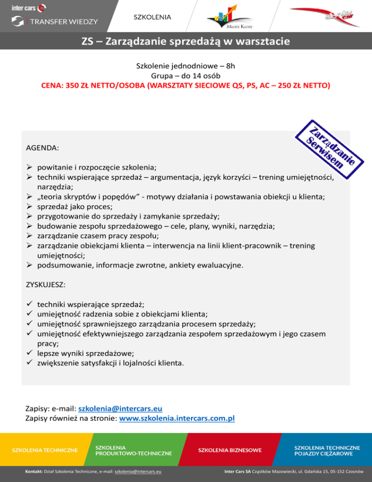 ZS – Zarządzanie sprzedażą w warsztacie Szkolenie jednodniowe – 8h Grupa – do 14 osób CENA: 350 ZŁ NETTO/OSOBA (WARSZTATY SIECIOWE QS, PS, AC – 250 ZŁ NETTO) AGENDA:  powitanie i rozpoczęcie szkolenia;  techniki wspierające sprzedaż – argumentacja, język korzyści – trening umiejętności, narzędzia;  „teoria skryptów i popędów” - motywy działania i powstawania obiekcji u klienta;  sprzedaż jako proces;  przygotowanie do sprzedaży i zamykanie sprzedaży;  budowanie zespołu sprzedażowego – cele, plany, wyniki, narzędzia;  zarządzanie czasem pracy zespołu;  zarządzanie obiekcjami klienta – interwencja na linii klient-pracownik – trening umiejętności;  podsumowanie, informacje zwrotne, ankiety ewaluacyjne. ZYSKUJESZ:     techniki wspierające sprzedaż; umiejętność radzenia sobie z obiekcjami klienta; umiejętność sprawniejszego zarządzania procesem sprzedaży; umiejętność efektywniejszego zarządzania zespołem sprzedażowym i jego czasem pracy;  lepsze wyniki sprzedażowe;  zwiększenie satysfakcji i lojalności klienta. Zapisy: e-mail: [email protected] Zapisy również na stronie: www.szkolenia.intercars.com.pl Kontakt: Dział Szkolenia Techniczne, e-mail: [email protected] Inter Cars SA Cząstków Mazowiecki, ul. Gdańska 15, 05-152 Czosnów