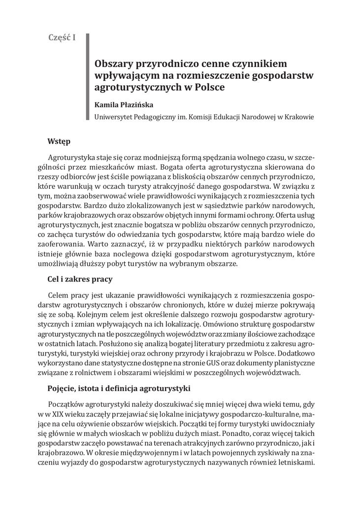 16Część I Kamila Płazińska Obszary przyrodniczo cenne czynnikiem wpływającym na rozmieszczenie gospodarstw agroturystycznych w Polsce Kamila Płazińska Wstęp Uniwersytet Pedagogiczny im. Komisji Edukacji Narodowej w Krakowie Agroturystyka staje się coraz modniejszą formą spędzania wolnego czasu, w szczególności przez mieszkańców miast. Bogata oferta agroturystyczna skierowana do rzeszy odbiorców jest ściśle powiązana z bliskością obszarów cennych przyrodniczo, które warunkują w oczach turysty atrakcyjność danego gospodarstwa. W związku z tym, można zaobserwować wiele prawidłowości wynikających z rozmieszczenia tych gospodarstw. Bardzo dużo zlokalizowanych jest w sąsiedztwie parków narodowych, parków krajobrazowych oraz obszarów objętych innymi formami ochrony. Oferta usług agroturystycznych, jest znacznie bogatsza w pobliżu obszarów cennych przyrodniczo, co zachęca turystów do odwiedzania tych gospodarstw, które mają bardzo wiele do zaoferowania. Warto zaznaczyć, iż w przypadku niektórych parków narodowych istnieje głównie baza noclegowa dzięki gospodarstwom agroturystycznym, które umożliwiają dłuższy pobyt turystów na wybranym obszarze. Cel i zakres pracy Celem pracy jest ukazanie prawidłowości wynikających z rozmieszczenia gospodarstw agroturystycznych i obszarów chronionych, które w dużej mierze pokrywają się ze sobą. Kolejnym celem jest określenie dalszego rozwoju gospodarstw agroturystycznych i zmian wpływających na ich lokalizację. Omówiono strukturę gospodarstw agroturystycznych na tle poszczególnych województw oraz zmiany ilościowe zachodzące w ostatnich latach. Posłużono się analizą bogatej literatury przedmiotu z zakresu agroturystyki, turystyki wiejskiej oraz ochrony przyrody i krajobrazu w Polsce. Dodatkowo wykorzystano dane statystyczne dostępne na stronie GUS oraz dokumenty planistyczne związane z rolnictwem i obszarami wiejskimi w poszczególnych województwach. Pojęcie, istota i definicja agroturystyki Początków agroturystyki należy doszukiwać się mniej więcej dwa wieki temu, gdy w w XIX wieku zaczęły przejawiać się lokalne inicjatywy gospodarczo-kulturalne, mające na celu ożywienie obszarów wiejskich. Początki tej formy turystyki uwidoczniały się głównie w małych wioskach w pobliżu dużych miast. Ponadto, coraz więcej takich gospodarstw zaczęło powstawać na terenach atrakcyjnych zarówno przyrodniczo, jak i krajobrazowo. W okresie międzywojennym i w latach powojennych zyskiwały na znaczeniu wyjazdy do gospodarstw agroturystycznych nazywanych również letniskami. Obszary przyrodniczo cenne czynnikiem wpływającym... 17 Obecnie agroturystyka to prężnie rozwijająca się forma turystyki, która uprawiana jest na obszarach wiejskich, gdzie miejscem zakwaterowania jest gospodarstwo rolne, które świadczy swoje usługi. Jest unikatową i konkurencyjną formą spędzania wolnego czasu w porównaniu do innych form turystyki. Głównymi atrakcjami w gospodarstwie agroturystycznym jest możliwość skorzystania bezpośrednio z produktów roślinnych i zwierzęcych powstających w gospodarstwie [Majewski 2000]. Podobnie istotę agroturystyki definiuje Maciej Drzewiecki, który uważa, iż jest to „forma wypoczynku odbywająca się na terenach wiejskich o charakterze rolniczym, oparta o bazę noclegową i aktywności rekreacyjne związane z gospodarstwem rolnym lub równoważnym i jego otoczeniem (przyrodniczym, produkcyjnym, usługowym)” [Drzewiecki 1995]. Należy jednak nadmienić, iż bardzo często używa się wymiennie pojęcia agroturystyka i turystyka wiejska, co nie jest jednoznaczne i służy do określenia, co prawda powiązanych ze sobą form turystyki, ale jednak nie takich samych. Jak podaje literatura przedmiotu, turystyka wiejska to ogół czynności turystycznych odbywających się na terenach wiejskich, niekoniecznie w gospodarstwach typowo rolniczych. Podobnie definiują ją autorzy prac z tego zakresu, którzy uważają, iż „za turystykę wiejską można uznać tę, która odbywa się na obszarach wiejskich, jest dostosowana do istniejących tam warunków i racjonalnie wykorzystuje naturalne walory miejscowe” [Dębniewska, Tkaczuk 1997]. Warto również w tym miejscu przytoczyć definicję kwatery agroturystycznej, która przez GUS jest określana jako „rodzaj obiektu zakwaterowania turystycznego, który stanowią pokoje i domy mieszkalne oraz przystosowane budynki gospodarcze (po adaptacji) w gospodarstwach wiejskich (rolnych, hodowlanych, ogrodniczych czy rybackich), będące własnością rolników, wynajmowane turystom na noclegi za opłatą” [Łysoń 2015]. Gospodarstwa agroturystyczne w porównaniu z innymi obiektami są bardzo rozproszone po terenie całego kraju. We wszystkich województwach agroturystyka wpływa na rozwój regionu i społeczności lokalnej. Dodatkowo stymuluje ona mieszkańców obszarów wiejskich do podtrzymywania tradycji ludowych, które są jednym z elementów towarzyszącym ofercie agroturystycznej. Rozwój agroturystyki przyczynił się w wielu miejscowościach do poprawy wyglądu zabudowy gospodarczej oraz zmniejszył masowy odpływ młodej ludności z terenów rolniczych. Jako atut rozwoju oferty agroturystyki należy wymienić również poszerzenie rynku zbytu dla produktów wytwarzanych na terenach wiejskich, które bardzo często są uważane za ekologiczne i znacznie zdrowsze niż pozostałe, ogólnodostępne w dużych dyskontach. Agroturystyka w ujęciu statystycznym Według danych statystycznych opublikowanych za 2014 rok przez GUS wynika, iż kwatery agroturystyczne stanowią 19% wszystkich obiektów noclegowych, co czynie je istotnymi elementami na rynku turystycznym. Województwa z największą liczbą gospodarstw agroturystycznych to kolejno: pomorskie, małopolskie i warmińsko-mazurskie, co związane jest z naturalnymi walorami turystycznymi obecnymi na terenie tych województw (ryc. 1). 18 