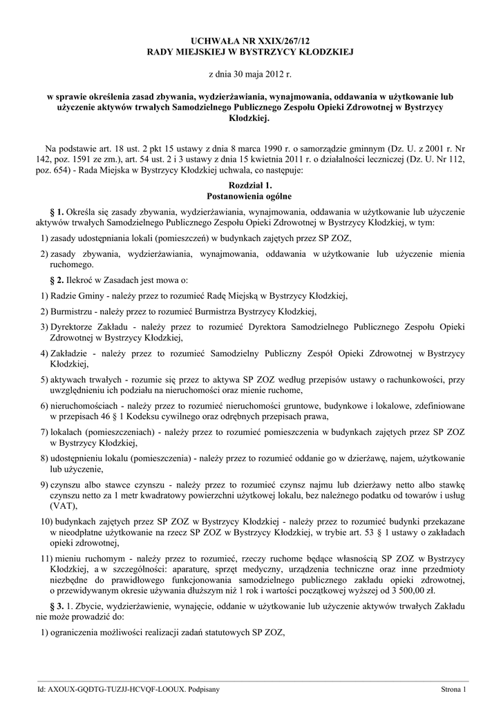 UCHWAŁA NR XXIX/267/12 RADY MIEJSKIEJ W BYSTRZYCY KŁODZKIEJ z dnia 30 maja 2012 r. w sprawie określenia zasad zbywania, wydzierżawiania, wynajmowania, oddawania w użytkowanie lub użyczenie aktywów trwałych Samodzielnego Publicznego Zespołu Opieki Zdrowotnej w Bystrzycy Kłodzkiej. Na podstawie art. 18 ust. 2 pkt 15 ustawy z dnia 8 marca 1990 r. o samorządzie gminnym (Dz. U. z 2001 r. Nr 142, poz. 1591 ze zm.), art. 54 ust. 2 i 3 ustawy z dnia 15 kwietnia 2011 r. o działalności leczniczej (Dz. U. Nr 112, poz. 654) - Rada Miejska w Bystrzycy Kłodzkiej uchwala, co następuje: Rozdział 1. Postanowienia ogólne § 1. Określa się zasady zbywania, wydzierżawiania, wynajmowania, oddawania w użytkowanie lub użyczenie aktywów trwałych Samodzielnego Publicznego Zespołu Opieki Zdrowotnej w Bystrzycy Kłodzkiej, w tym: 1) zasady udostępniania lokali (pomieszczeń) w budynkach zajętych przez SP ZOZ, 2) zasady zbywania, wydzierżawiania, wynajmowania, oddawania w użytkowanie lub użyczenie mienia ruchomego. § 2. Ilekroć w Zasadach jest mowa o: 1) Radzie Gminy - należy przez to rozumieć Radę Miejską w Bystrzycy Kłodzkiej, 2) Burmistrzu - należy przez to rozumieć Burmistrza Bystrzycy Kłodzkiej, 3) Dyrektorze Zakładu - należy przez to rozumieć Dyrektora Samodzielnego Publicznego Zespołu Opieki Zdrowotnej w Bystrzycy Kłodzkiej, 4) Zakładzie - należy przez to rozumieć Samodzielny Publiczny Zespół Opieki Zdrowotnej w Bystrzycy Kłodzkiej, 5) aktywach trwałych - rozumie się przez to aktywa SP ZOZ według przepisów ustawy o rachunkowości, przy uwzględnieniu ich podziału na nieruchomości oraz mienie ruchome, 6) nieruchomościach - należy przez to rozumieć nieruchomości gruntowe, budynkowe i lokalowe, zdefiniowane w przepisach 46 § 1 Kodeksu cywilnego oraz odrębnych przepisach prawa, 7) lokalach (pomieszczeniach) - należy przez to rozumieć pomieszczenia w budynkach zajętych przez SP ZOZ w Bystrzycy Kłodzkiej, 8) udostępnieniu lokalu (pomieszczenia) - należy przez to rozumieć oddanie go w dzierżawę, najem, użytkowanie lub użyczenie, 9) czynszu albo stawce czynszu - należy przez to rozumieć czynsz najmu lub dzierżawy netto albo stawkę czynszu netto za 1 metr kwadratowy powierzchni użytkowej lokalu, bez należnego podatku od towarów i usług (VAT), 10) budynkach zajętych przez SP ZOZ w Bystrzycy Kłodzkiej - należy przez to rozumieć budynki przekazane w nieodpłatne użytkowanie na rzecz SP ZOZ w Bystrzycy Kłodzkiej, w trybie art. 53 § 1 ustawy o zakładach opieki zdrowotnej, 11) mieniu ruchomym - należy przez to rozumieć, rzeczy ruchome będące własnością SP ZOZ w Bystrzycy Kłodzkiej, a w szczególności: aparaturę, sprzęt medyczny, urządzenia techniczne oraz inne przedmioty niezbędne do prawidłowego funkcjonowania samodzielnego publicznego zakładu opieki zdrowotnej, o przewidywanym okresie używania dłuższym niż 1 rok i wartości początkowej wyższej od 3 500,00 zł. § 3. 1. Zbycie, wydzierżawienie, wynajęcie, oddanie w użytkowanie lub użyczenie aktywów trwałych Zakładu nie może prowadzić do: 1) ograniczenia możliwości realizacji zadań statutowych SP ZOZ, ————————————————————————————————————————————————————————— Id: AXOUX-GQDTG-TUZJJ-HCVQF-LOOUX. Podpisany Strona 1 2) stwarzania możliwości nieuczciwej konkurencji, 3) negatywnego wpływu na warunki udzielania świadczeń zdrowotnych, 4) działania na szkodę wierzycieli. 2. Zbycie, wydzierżawienie, wynajęcie, oddanie w użytkowanie lub użyczenie aktywów trwałych Zakładu może być dokonane jedynie zgodnie z zasadami prawidłowej i efektywnej gospodarki. 3. Zbycie nieruchomości stanowiących własność Gminy Bystrzyca Kłodzka oddanych w nieodpłatne użytkowanie SP ZOZ następuje na podstawie ustawy z dnia 21 sierpnia 1997 r. o gospodarce nieruchomościami. § 4. 1. Zbycie, wydzierżawienie, wynajęcie, oddanie w użytkowanie, użyczenie ruchomych aktywów trwałych zakładu należy każdorazowo poprzedzić oceną techniczną i ekonomiczną sporządzoną przez Zakład, na podstawie której powinna być podjęta decyzja o przeznaczeniu do obrotu zbędnych ruchomych aktywów trwałych, zgodnie z zasadami prawidłowej gospodarki. 2. Ocena, o której mowa w ust. 1, powinna uwzględniać uzasadnienie celowości dokonania obrotu aktywem trwałym, jak również pełną analizę ekonomiczną, techniczną oraz wycenę wartości ruchomych aktywów trwałych przeznaczonych do obrotu. 3. Wstępnej wyceny ruchomych aktywów trwałych, o których mowa w ust. 1 dokonuje Zakład, uwzględniając rynkową wartość tych składników, biorąc pod uwagę przeciętne ceny stosowane w obrocie rzeczami tego samego rodzaju i gatunku a także ich stan oraz stopień zużycia. 4. Wyceny wartości ruchomych aktywów trwałych, o których mowa w ust. 1, dokonuje Zakład, a gdy wartość przynajmniej jednego ze składników ruchomych aktywów trwałych ustalona w wyniku wyceny, o której mowa w ust. 3, przekracza 10.000,00 złotych, wyceny dokonuje rzeczoznawca. Rozdział 2. Zasady udostępniania lokali (pomieszczeń) SP ZOZ § 5. 1. Przeznaczenie lokalu do oddania w dzierżawę, najem, użytkowanie lub użyczenie, może nastąpić po uzyskaniu przez Dyrektora Zakładu pozytywnej opinii Rady Społecznej Zakładu oraz zgody Burmistrza, wyrażonej w formie zarządzenia na wniosek Dyrektora Zakładu, z zastrzeżeniem ust. 4. 2. Wniosek, o którym mowa w ust. 1, powinien zawierać informacje: 1) o lokalu planowanym do udostępnienia oraz uzasadnienie takiego działania, 2) o rodzaju działalności planowanej do prowadzenia w udostępnianym lokalu, 3) określać formę i planowany okres udostępnienia lokalu. 3. Z zastrzeżeniem ust. 4, załącznikami do wniosku o udostępnienie lokalu są: 1) opinia Rady Społecznej SP ZOZ, 2) oświadczenie Dyrektora Zakładu, że udo