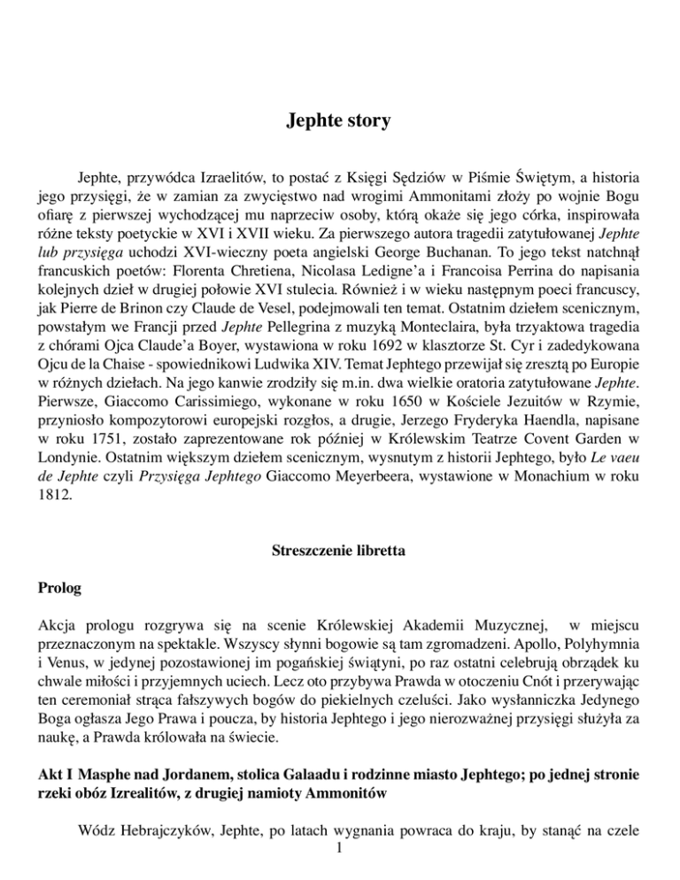 Jephte story Jephte, przywódca Izraelitów, to postać z Księgi Sędziów w Piśmie Świętym, a historia jego przysięgi, że w zamian za zwycięstwo nad wrogimi Ammonitami złoży po wojnie Bogu ofiarę z pierwszej wychodzącej mu naprzeciw osoby, którą okaże się jego córka, inspirowała różne teksty poetyckie w XVI i XVII wieku. Za pierwszego autora tragedii zatytułowanej Jephte lub przysięga uchodzi XVI-wieczny poeta angielski George Buchanan. To jego tekst natchnął francuskich poetów: Florenta Chretiena, Nicolasa Ledigne’a i Francoisa Perrina do napisania kolejnych dzieł w drugiej połowie XVI stulecia. Również i w wieku następnym poeci francuscy, jak Pierre de Brinon czy Claude de Vesel, podejmowali ten temat. Ostatnim dziełem scenicznym, powstałym we Francji przed Jephte Pellegrina z muzyką Monteclaira, była trzyaktowa tragedia z chórami Ojca Claude’a Boyer, wystawiona w roku 1692 w klasztorze St. Cyr i zadedykowana Ojcu de la Chaise - spowiednikowi Ludwika XIV. Temat Jephtego przewijał się zresztą po Europie w różnych dziełach. Na jego kanwie zrodziły się m.in. dwa wielkie oratoria zatytułowane Jephte. Pierwsze, Giaccomo Carissimiego, wykonane w roku 1650 w Kościele Jezuitów w Rzymie, przyniosło kompozytorowi europejski rozgłos, a drugie, Jerzego Fryderyka Haendla, napisane w roku 1751, zostało zaprezentowane rok później w Królewskim Teatrze Covent Garden w Londynie. Ostatnim większym dziełem scenicznym, wysnutym z historii Jephtego, było Le vaeu de Jephte czyli Przysięga Jephtego Giaccomo Meyerbeera, wystawione w Monachium w roku 1812. Streszczenie libretta Prolog Akcja prologu rozgrywa się na scenie Królewskiej Akademii Muzycznej, w miejscu przeznaczonym na spektakle. Wszyscy słynni bogowie są tam zgromadzeni. Apollo, Polyhymnia i Venus, w jedynej pozostawionej im pogańskiej świątyni, po raz ostatni celebrują obrządek ku chwale miłości i przyjemnych uciech. Lecz oto przybywa Prawda w otoczeniu Cnót i przerywając ten ceremoniał strąca fałszywych bogów do piekielnych czeluści. Jako wysłanniczka Jedynego Boga ogłasza Jego Prawa i poucza, by historia Jephtego i jego nierozważnej przysięgi służyła za naukę, a Prawda królowała na świecie. Akt I Masphe nad Jordanem, stolica Galaadu i rodzinne miasto Jephtego; po jednej stronie rzeki obóz Izrealitów, z drugiej namioty Ammonitów Wódz Hebrajczyków, Jephte, po latach wygnania powraca do kraju, by stanąć na czele 1 izraelskiej armii atakowanej przez Ammonitów. Spotyka Wielkiego Kapłana Phinee, który powiadamia Jephtego o zdradzie plemienia Efraimów, podburzonych przez Ammona, księcia Ammonitów i więźnia Hebrajczyków. Jephte czym przygotowania do walki. Pojawia się na niebie Arka Przymierza w aureoli świetlistej chmury. Kapłan Phinee każe Izraelskiej Armii nie patrzeć na Arkę. W momencie rozpoczęcia bitwy Jephte ślubuje Bogu, że jeśli zwycięży, złoży Jemu ofiarę z pierwszej napotkanej osoby po powrocie z bitwy. Rozstępują się wody Jordanu, umożliwiając przejście armii Izraelitów. Akt II Pałac Jephtego Abner, zausznik Ammona, namawia, by korzystając z zamieszania wojennego uciekli i połączyli się ze swoimi. Ammon, zakochany w Iphisee, córce Jephtego, odmawia. W dramatycznym dialogu Ammon wyznaje swoją miłość Iphisee, ale ta, w imię wierności Bogu i swemu ludowi, odrzuca Ammona, mimo że w skrytości odwzajemnia jego uczucia. Przybywa matka Iphisee, Almasie i z trwogą opowiada jej sen, w którym ujrzała gromy niebieskie spadające na Iphisee. Abdon, powiernik Jephtego, powiadamia o zwycięstwie Hebrajczyków. Ogólna radość ze zwycięstwa i tańce. Pod koniec aktu Iphisee biegnie zobaczyć swojego Ojca i Zwycięzcę. Akt III Plac przed pałacem Jephtego (przyozdobiony triumfalnymi łukami); pośrodku tron Jephte, samotnie stojący na placu, nękany jest wyrzutami sumienia. Pierwszą spotkaną osoba była młodziutka, niewinna dziewczyna, której nie śmiał oznajmić, że zostanie ofiarą. Wkrótce odkrywa, że to jego córka. Przerażony odsyła Iphisee bez wyjaśnień, ale nie może ukryć prawdy przed Almasie, która nie szczędzi mu gorzkich wymówek. Lud Izraela pod wodzą Phinee ofiarowuje Jephtemu tron Izraela. W trakcie tej ceremonii kapłan Phinee przypomina Jephtemu o bezwzględnym obowiązku dochowania Bogu wierności i posłuszeństwa. Akt IV Sielski pejzaż z licznymi strumykami Iphisee, która nie rozumie, dlaczego została odtrącona przez ojca, jest w rozpaczy. Grupa przybyłych pasterzy znad Jordanu próbuje ją rozweselić tańcami. Te sielską zabawę przerywa Almasie, która oznajmia córce, że musi ona uczynić z siebie ofiarę. Nieszczęsna Iphisee myśląc, że to z winy potajemnej miłości do Ammona ma ponieść karę, przyjmuje wyrok ze spokojem, niemal radośnie. Scenę kończy modlitwa do Boga. Przybywa Ammon proponując Iphisee ocalenie przy pomocy zbuntowanych Efraimczyków. Iphisee odrzuca ze zgrozą propozycję, ale nie ukrywa dłużej uczuć, jakie żywi dla niego. Akt V Świątynia w Masphie Na zewnątrz świątyni widać ołtarz. Jephte usiłuje przebłagać Boga modlitwami. U stóp ołtarza Iphisee przyznaje się ojcu do swojej grzesznej miłości w przekonaniu, że z jej powodu 2 ponosi śmierć. W tym momencie grupa rebeliantów pod wodzą Ammona usiłuje sforsować wejście do świątyni, ale Anioł Zagłady zabija rebeliantów, nie oszczędzając nikogo. Przygotowania do obrzędu ofiarnego są w toku. W ostatnim momencie Bóg, przemawiając przez Wielkiego Kapłana, przebacza Iphisee w nagrodę za jej pełną rezygnacji postawę, skruchę i pokorę. Libretto Pellegrina, zrodzone z tekstu Pisma Świętego, stanowiło novum w XVIII - wiecznej francuskiej operze, gdzie królowały tematy z mitologii, historii antyku i różnych epopei, a dzieje bohaterów uwikłanych w intrygi, przygody i miłosne perypetie fascynowały widownie. Widzowie kochali mieszkańców Olimpu, nimfy, m