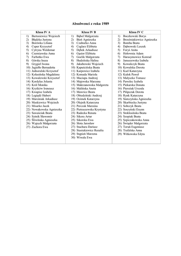 Absolwenci z roku 1989 1) 2) 3) 4) 5) 6) 7) 8) 9) 10) 11) 12) 13) 14) 15) 16) 17) 18) 19) 20) 21) 22) 23) 24) 25) 26) 27) Klasa IV A Bartosiewicz Wojciech Błędzka Justyna Borówka Liliana Cuper Krzysztof Cytryna Waldemar Czerniawska Anna Farbotko Ewa Górska Ineza Grygiel Iwona Jagiełło Bernadetta Jednoralski Krzysztof Kolasińska Magdalena Kowalewski Krzysztof Kordylas Jolanta Król Monika Kryśków Ireneusz Kwapisz Izabela Legiędź Hubert Marciniak Arkadiusz Maskiewicz Wojciech Misarko Jacek Nowakowska Agnieszka Sawaściuk Beata Sytnik Sławomir Śliwińska Agnieszka Wypych Małgorzata Zuchora Ewa 1) 2) 3) 4) 5) 6) 7) 8) 9) 10) 11) 12) 13) 14) 15) 16) 17) 18) 19) 20) 21) 22) 23) 24) 25) 26) 27) 28) 29) 30) Klasa IV B Bąbol Małgorzata Bień Agnieszka Czaboćko Anna Ceglarz Elżbieta Dębek Arkadiusz Gąsior Elżbieta Goclik Małgorzata Hudzińska Halina Jakubowski Wojciech Kapuścińska Beata Karpowicz Izabela Komada Mariola Maciupa Andrzej Majewska Marzena Makrzanowska Małgorzta Malińska Aneta Mawricz Beata Obiedziński Andrzej Ocimek Katarzyna Olejnik Katarzyna Perczak Marzena Pietraszewska Krystyna Radecka Renata Sikora Artur Sikorska Ewa Słota Jarosław Stachura Dariusz Stasiukiewicz Rozalia Stępień Marzena Wiwała Ewa 1) 2) 3) 4) 5) 6) 7) 8) 9) 10) 11) 12) 13) 14) 15) 16) 17) 18) 19) 20) 21) 22) 23) 24) 25) 26) 27) 28) 29) Klasa IV C Boczkowski Borys Brzeźniakiewicz Agnieszka Bomba Beata Dąbrowski Leszek Foryś Anita Hołownia Adam Harasymowicz Konrad Januszewska Izabela Kowalczyk Beata Kowalska Dorota Ksel Katarzyna Kulok Paweł Małyszko Tomasz Pawelec Izabela Piekarska Donata Pierożak Urszula Pilipczuk Dorota Rynk Katarzyna Siatczyńska Agnieszka Skarbiecka Justyna Sobczyk Beata Soszyński Erazm Stokłosińska Beata Szopiak Beata Szpiczakowska Anna Świąder Małgorzata Toruń Eugeniusz Trafalska Anna Witkowska Edyta