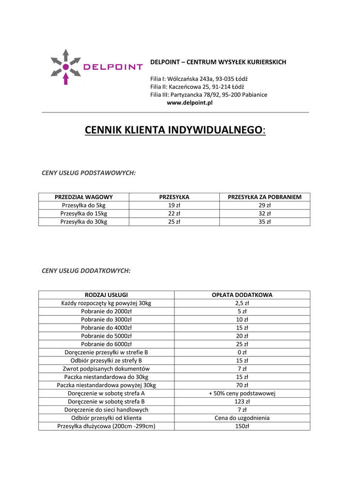 DELPOINT – CENTRUM WYSYŁEK KURIERSKICH Filia I: Wólczańska 243a, 93-035 Łódź Filia II: Kaczeńcowa 25, 91-214 Łódź Filia III: Partyzancka 78/92, 95-200 Pabianice www.delpoint.pl CENNIK KLIENTA INDYWIDUALNEGO: CENY USŁUG PODSTAWOWYCH: PRZEDZIAŁ WAGOWY Przesyłka do 5kg Przesyłka do 15kg Przesyłka do 30kg PRZESYŁKA 19 zł 22 zł 25 zł PRZESYŁKA ZA POBRANIEM 29 zł 32 zł 35 zł CENY USŁUG DODATKOWYCH: RODZAJ USŁUGI Każdy rozpoczęty kg powyżej 30kg Pobranie do 2000zł Pobranie do 3000zł Pobranie do 4000zł Pobranie do 5000zł Pobranie do 6000zł Doręczenie przesyłki w strefie B Odbiór przesyłki ze strefy B Zwrot podpisanych dokumentów Paczka niestandardowa do 30kg Paczka niestandardowa powyżej 30kg Doręczenie w sobotę strefa A Doręczenie w sobotę strefa B Doręczenie do sieci handlowych Odbiór przesyłki od klienta Przesyłka dłużycowa (200cm -299cm) OPŁATA DODATKOWA 2,5 zł 5 zł 10 zł 15 zł 20 zł 25 zł 0 zł 15 zł 7 zł 15 zł 70 zł + 50% ceny podstawowej 123 zł 7 zł Cena do uzgodnienia 150zł RODZAJE PACZEK Paczka standardowa – paczka o kształcie prostopadłościanu lub sześcianu, z którego nie wystaje żaden ponadwymiarowy element. Wymiar najdłuższego boku nie może przekroczyć 120 cm lub suma wymiarów nie może przekraczać 220 cm. Paczka niestandardowa – paczka, której przynajmniej jeden z trzech wymiarów przekracza 120 cm lub suma wymiarów przekracza 220 cm. Paczką niestandardową są również: elementy o kształcie okrągłym, cylindrycznym lub owalnym; o nieregularnych kształtach lub/oraz z wystającymi elementami; zawierające luźne, ciężkie elementy lub takie, których rozkład ciężaru jest nierównomierny, umieszczone w luźnym opakowaniu. Zasada ta nie dotyczy paczek dłużycowych( powyżej 200cm). Paczka gabarytowa – zazwyczaj jest to paczka lekka, ale objętościowo duża. Wagę gabarytową stosujemy zawsze do wyceny paczki w przypadku, gdy waga gabarytowa jest większa niż waga rzeczywista paczki. Do wyceny przyjmowana jest wyższa waga. Waga gabarytowa obliczana jest według poniższego wzoru: Długość cm [a] x szerokość cm [b] x wysokość cm [c] 6000 Paczka dłużycowa - paczka, w której długość najdłuższego boku przekracza 200 cm. Maksymalna waga rzeczywistej, pojedynczej wiązki lub elementu nie może przekraczać 50 kg. Wagę takiej paczki obliczamy, doliczając do wagi rzeczywistej 100 kg za każdy rozpoczęty metr długości paczki - powyżej 200 cm (każdy rozpoczęty 1 metr długości powyżej 200 cm =100 kg). Otrzymujemy wtedy wagę obliczeniową, według której będzie wyceniona przesyłka. Dla przesyłek powyżej 350 cm – usługa jest możliwa po wcześniejszym uzgodnieniu z lokalnym oddziałem. SPOSÓB USTALANIA WAGI PACZKI W ustalaniu wagi, obowiązuje zasada wyboru wyższej wagi paczki / palety: rzeczywistej, gabarytowej lub dłużycowej. Paczki gabarytowe, niestandardowe, dłużycowe nadawane są na osobnych listach przewozowych zgodnie z zasadą: jedna paczka- jeden list przewozowy. ZWROT PRZESYŁKI Przesyłka zwrócona, nieodebrana, odesłana- opłata wg cennika podstawowego PRZECHOWYWANIE PRZESYŁKI ZWRÓCONEJ (za każdą paczkę) 10 zł za każdy dzień przechowywania PODATEK VAT ORAZ OPŁATA PALIWOWA Podane ceny zawierają podatek VAT oraz opłatę paliwową. TABELA MIAST STREFY A: BĘDZIN BIAŁA PODLASKA BIAŁYSTOK BIELSKO- BIAŁA BYDGOSZCZ BYTOM CHEŁM CHORZÓW CIECHANÓW CZELADŹ CZĘSTOCHOWA DĄBROWA GÓRNICZA ELBLĄD EŁK GDAŃSK GDYNIA GLIWICE GŁOGÓW GORZÓW WLKP JELENIA GÓRA KALISZ KATOWICE KIELCE KONIN KOSZALIN KRAKÓW KROSNO LEGNICA LESZNO LUBLIN ŁOMŻA ŁÓDŹ MYSŁOWICE NOWY SĄCZ MIEJSCOWOŚĆI STREFY B Pozostałe miejscowości w kraju OLSZTYN OPOLE OSTROŁĘKA PIEKARY ŚLĄSKIE PIŁA PIOTRKÓW TRYBUNALSKI PŁOCK POZNAŃ PRZEMYŚL RADOM RUDA ŚLĄSKA RZESZÓW SIEDLCE SIEMANOWICE ŚL SKIERNIEWICE SŁUPSK SOPOT SOSNOWIEC SUWAŁKI SZCZECIN ŚWIĘTOCHŁOWICE TARNOBRZEG TARNÓW TORUŃ TYCHY WAŁBRZYCH WARSZAWA WŁOCŁAWEK WROCŁAW ZABRZE ZAMOŚĆ ZDUŃSKA WOLA ZIELONA GÓRA