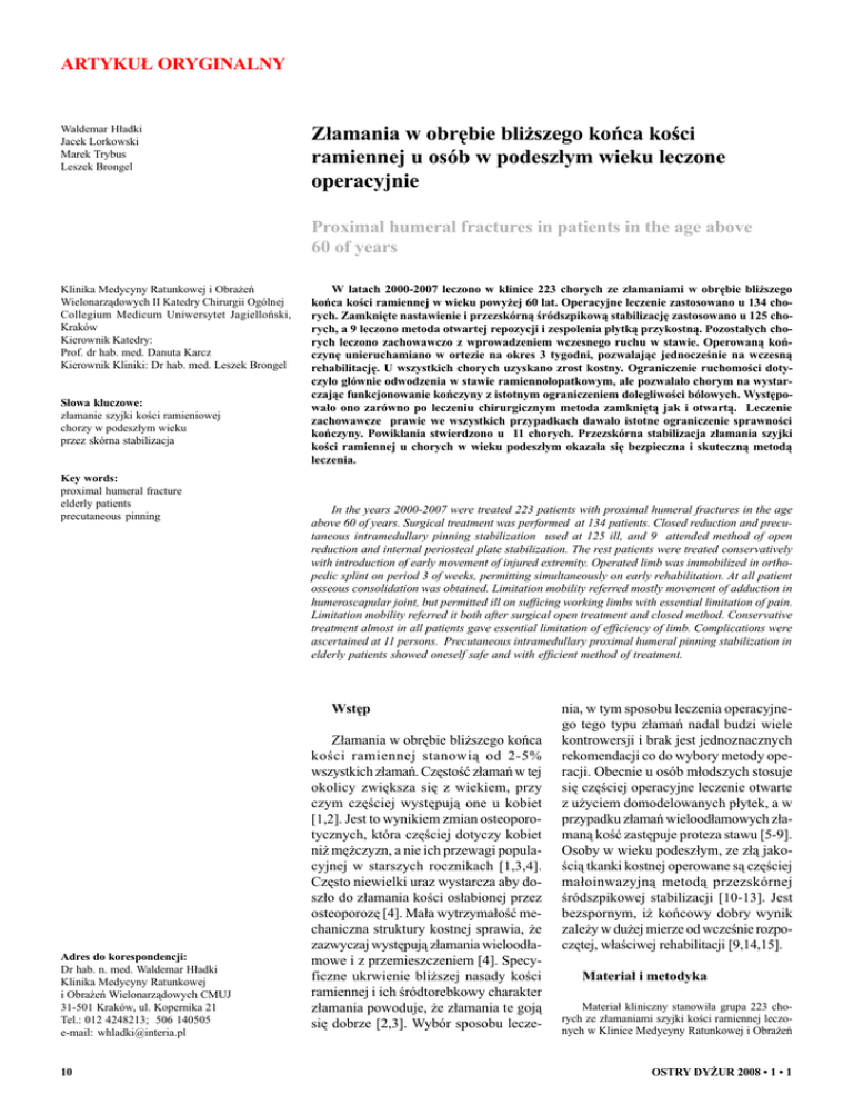 ARTYKU£ ORYGINALNY Waldemar H³adki Jacek Lorkowski Marek Trybus Leszek Brongel Z³amania w obrêbie bli¿szego koñca koci ramiennej u osób w podesz³ym wieku leczone operacyjnie Proximal humeral fractures in patients in the age above 60 of years Klinika Medycyny Ratunkowej i Obra¿eñ Wielonarz¹dowych II Katedry Chirurgii Ogólnej Collegium Medicum Uniwersytet Jagielloñski, Kraków Kierownik Katedry: Prof. dr hab. med. Danuta Karcz Kierownik Kliniki: Dr hab. med. Leszek Brongel S³owa kluczowe: z³amanie szyjki koci ramieniowej chorzy w podesz³ym wieku przez skórna stabilizacja Key words: proximal humeral fracture elderly patients precutaneous pinning W latach 2000-2007 leczono w klinice 223 chorych ze z³amaniami w obrêbie bli¿szego koñca koci ramiennej w wieku powy¿ej 60 lat. Operacyjne leczenie zastosowano u 134 chorych. Zamkniête nastawienie i przezskórn¹ ródszpikow¹ stabilizacjê zastosowano u 125 chorych, a 9 leczono metoda otwartej repozycji i zespolenia p³ytk¹ przykostn¹. Pozosta³ych chorych leczono zachowawczo z wprowadzeniem wczesnego ruchu w stawie. Operowan¹ koñczynê unieruchamiano w ortezie na okres 3 tygodni, pozwalaj¹c jednoczenie na wczesn¹ rehabilitacjê. U wszystkich chorych uzyskano zrost kostny. Ograniczenie ruchomoci dotyczy³o g³ównie odwodzenia w stawie ramienno³opatkowym, ale pozwala³o chorym na wystarczaj¹c funkcjonowanie koñczyny z istotnym ograniczeniem dolegliwoci bólowych. Wystêpowa³o ono zarówno po leczeniu chirurgicznym metoda zamkniêt¹ jak i otwart¹. Leczenie zachowawcze prawie we wszystkich przypadkach dawa³o istotne ograniczenie sprawnoci koñczyny. Powik³ania stwierdzono u 11 chorych. Przezskórna stabilizacja z³amania szyjki koci ramiennej u chorych w wieku podesz³ym okaza³a siê bezpieczna i skuteczn¹ metod¹ leczenia. In the years 2000-2007 were treated 223 patients with proximal humeral fractures in the age above 60 of years. Surgical treatment was performed at 134 patients. Closed reduction and precutaneous intramedullary pinning stabilization used at 125 ill, and 9 attended method of open reduction and internal periosteal plate stabilization. The rest patients were treated conservatively with introduction of early movement of injured extremity. Operated limb was immobilized in orthopedic splint on period 3 of weeks, permitting simultaneously on early rehabilitation. At all patient osseous consolidation was obtained. Limitation mobility referred mostly movement of adduction in humeroscapular joint, but permitted ill on sufficing working limbs with essential limitation of pain. Limitation mobility referred it both after surgical open treatment and closed method. Conservative treatment almost in all patients gave essential limitation of efficiency of limb. Complications were ascertained at 11 persons. Precutaneous intramedullary proximal humeral pinning stabilization in elderly patients showed oneself safe and with efficient method of treatment. Wstêp Adres do korespondencji: Dr hab. n. med. Waldemar H³adki Klinika Medycyny Ratunkowej i Obra¿eñ Wielonarz¹dowych CMUJ 31-501 Kraków, ul. Kopernika 21 Tel.: 012 4248213; 506 140505 e-mail: [email protected] 10 Z³amania w obrêbie bli¿szego koñca koci ramiennej stanowi¹ od 2-5% wszystkich z³amañ. Czêstoæ z³amañ w tej okolicy zwiêksza siê z wiekiem, przy czym czêciej wystêpuj¹ one u kobiet [1,2]. Jest to wynikiem zmian osteoporotycznych, która czêciej dotyczy kobiet ni¿ mê¿czyzn, a nie ich przewagi populacyjnej w starszych rocznikach [1,3,4]. Czêsto niewielki uraz wystarcza aby dosz³o do z³amania koci os³abionej przez osteoporozê [4]. Ma³a wytrzyma³oæ mechaniczna struktury kostnej sprawia, ¿e zazwyczaj wystêpuj¹ z³amania wielood³amowe i z przemieszczeniem [4]. Specyficzne ukrwienie bli¿szej nasady koci ramiennej i ich ródtorebkowy charakter z³amania powoduje, ¿e z³amania te goj¹ siê dobrze [2,3]. Wybór sposobu lecze- nia, w tym sposobu leczenia operacyjnego tego typu z³amañ nadal budzi wiele kontrowersji i brak jest jednoznacznych rekomendacji co do wybory metody operacji. Obecnie u osób m³odszych stosuje siê czêciej operacyjne leczenie otwarte z u¿yciem domodelowanych p³ytek, a w przypadku z³amañ wielood³amowych z³aman¹ koæ zastêpuje proteza stawu [5-9]. Osoby w wieku podesz³ym, ze z³¹ jakoci¹ tkanki kostnej operowane s¹ czêciej ma³oinwazyjn¹ metod¹ przezskórnej ródszpikowej stabilizacji [10-13]. Jest bezspornym, i¿ koñcowy dobry wynik zale¿y w du¿ej mierze od wczenie rozpoczêtej, w³aciwej rehabilitacji [9,14,15]. Materia³ i metodyka Materia³ kliniczny stanowi³a grupa 223 chorych ze z³amaniami szyjki koci ramiennej leczonych w Klinice Medycyny Ratunkowej i Obra¿eñ OSTRY DY¯UR 2008 1 1 Wielonarz¹dowych UJ CM w Krakowie 0d 1.01. 2000 do 31.07. 2007 roku. Leczenie operacyjne zastosowano u 134 chorych, w tym 107 (79,8%) kobiet i 27 (20,2%) mê¿czyzn. redni wiek chorych wyniós³ 81,2 lata (od 61 do 97 lat). Zebrany materia³ analizowano w oparciu o komputerow¹ bazê danych Kliniki. Analizowano sposób leczenia, wyniki leczenia, wystêpuj¹co dodatkowo obra¿enia cia³a i obci¹¿enia internistyczne. Wyniki leczenia okrelano przy pomocy zakresu ruchu funkcjonalnego w stawie barkowym. Za wynik dobry uznano zgiêcie do 90 stopni, wyprost do 30 stopni i odwiedzenie do 90 stopni. Za wynik zadowalaj¹cy uznano zgiêcie w stawie barkowym do 45 stopni, wyprost do 15 stopni i odwiedzenie do 45 stopni. Zakres ruchomoci poni¿ej tych wartoci uznano za wynik z³y. Wyniki W opracowanym materiale 134 (60,1%) leczono operacyjnie. Pozostali chorzy byli leczeniu zachowawczo ze wzglêdu na charakter z³amania (dwuod³amowe z³amanie bez przemieszczenia, brak zgody na leczenie operacyjne i z³y stan ogólny). Zaopatrzenia na chucie trójk¹tnej i informacji o dalszym postêpowaniu dokonywano w przewa¿aj¹cej wiêkszoci przypadku w warunkach ambulatoryjnych. W grupie operowanych chorych zdecydowan