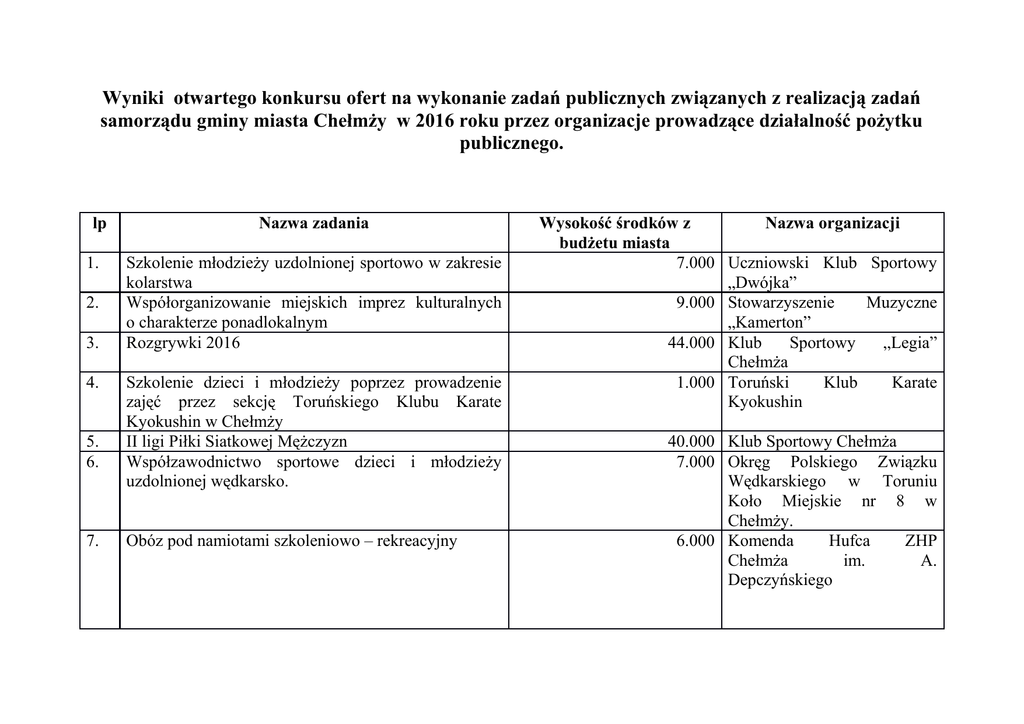 Wyniki otwartego konkursu ofert na wykonanie zadań publicznych związanych z realizacją zadań samorządu gminy miasta Chełmży w 2016 roku przez organizacje prowadzące działalność pożytku publicznego. lp 1. 2. 3. 4. 5. 6. 7. Nazwa zadania Szkolenie młodzieży uzdolnionej sportowo w zakresie kolarstwa Współorganizowanie miejskich imprez kulturalnych o charakterze ponadlokalnym Rozgrywki 2016 Szkolenie dzieci i młodzieży poprzez prowadzenie zajęć przez sekcję Toruńskiego Klubu Karate Kyokushin w Chełmży II ligi Piłki Siatkowej Mężczyzn Współzawodnictwo sportowe dzieci i młodzieży uzdolnionej wędkarsko. Obóz pod namiotami szkoleniowo – rekreacyjny Wysokość środków z Nazwa organizacji budżetu miasta 7.000 Uczniowski Klub Sportowy „Dwójka” 9.000 Stowarzyszenie Muzyczne „Kamerton” 44.000 Klub Sportowy „Legia” Chełmża 1.000 Toruński Klub Karate Kyokushin 40.000 Klub Sportowy Chełmża 7.000 Okręg Polskiego Związku Wędkarskiego w Toruniu Koło Miejskie nr 8 w Chełmży. 6.000 Komenda Hufca ZHP Chełmża im. A. Depczyńskiego 8. 9. 10. 11. 12. 13. 14. 15. Festiwal Piosenki Religijnej i Harcerskiej „Światłość w Ciemności Świeci połączony z konkursem plastycznym pn „Nasz Wicek”. Ocalić od zapomnienia – zdobywamy sztandar. Chełmżanie na szklanych negatywach Feliksa Skańskiego 1918 - 1939 Szkolenie dzieci i młodzieży, organizacja zawodów i pokazów sportowych. Szkolenie dzieci i młodzieży poprzez prowadzenie zajęć przez stowarzyszenia kultury fizycznej w różnych dyscyplinach sportowych. VIII Długodystansowe Regaty Rodzinne Chełmża – Zalesie – Chełmża. Ochrona przyrody i środowiska naturalnego nadrzędnym zadaniem społeczeństwa. Organizowanie szkolenia sportowego i młodzieży przez KST „Włókniarz” Chełmża Piłka Kobieca 2016 dzieci Turnieje Baśki i Tysiąca Parami. 16. 17. 18. Szkolenie Sportowe dzieci i młodzieży w sezonie 2016 Szkolenie dzieci i młodzieży poprzez dyscyplinę sportową – boks 4.500 Komenda Hufca Chełmża im. Depczyńskiego ZHP A. 8.000 Towarzystwo Przyjaciół Chełmży 18.500 Międzyszkolny Klub Sportowy 15.000 Chełmżyńskie Towarzystwo Wioślarskie 1927 2.000 Stowarzyszenie „Białe Żagle” 4.000 Liga Ochrony Przyrody Zarząd Okręgu w Toruniu Oddział LOP w Chełmży 22.000 Klub Sportowo – Turystyczny „Włókniarz” 7.500 Kobiecy Klub Piłkarski Chełmża 3.500 Chełmżyński Klub Sportowych Gier Karcianych „AS PIK” 7.000 Uczniowski Klub Sportowy „Włókniarz” 5.000 Klub Sportowy „Grom” w Chełmży 19. „Radość niepełnosprawnych naszą radością” 12.000 Stowarzyszenie Niepełnosprawnych „Pomocna Dłoń” Osób
