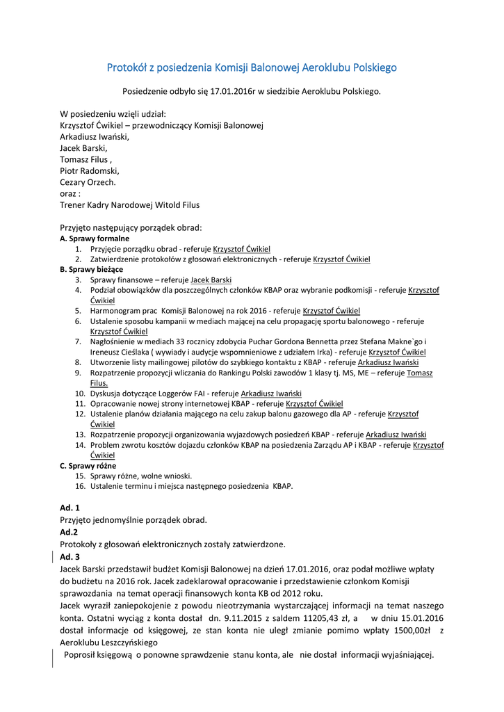 Protokół z posiedzenia Komisji Balonowej Aeroklubu Polskiego Posiedzenie odbyło się 17.01.2016r w siedzibie Aeroklubu Polskiego. W posiedzeniu wzięli udział: Krzysztof Ćwikiel – przewodniczący Komisji Balonowej Arkadiusz Iwański, Jacek Barski, Tomasz Filus , Piotr Radomski, Cezary Orzech. oraz : Trener Kadry Narodowej Witold Filus Przyjęto następujący porządek obrad: A. Sprawy formalne 1. Przyjęcie porządku obrad - referuje Krzysztof Ćwikiel 2. Zatwierdzenie protokołów z głosowań elektronicznych - referuje Krzysztof Ćwikiel B. Sprawy bieżące 3. Sprawy finansowe – referuje Jacek Barski 4. Podział obowiązków dla poszczególnych członków KBAP oraz wybranie podkomisji - referuje Krzysztof Ćwikiel 5. Harmonogram prac Komisji Balonowej na rok 2016 - referuje Krzysztof Ćwikiel 6. Ustalenie sposobu kampanii w mediach mającej na celu propagację sportu balonowego - referuje Krzysztof Ćwikiel 7. Nagłośnienie w mediach 33 rocznicy zdobycia Puchar Gordona Bennetta przez Stefana Makne`go i Ireneusz Cieślaka ( wywiady i audycje wspomnieniowe z udziałem Irka) - referuje Krzysztof Ćwikiel 8. Utworzenie listy mailingowej pilotów do szybkiego kontaktu z KBAP - referuje Arkadiusz Iwański 9. Rozpatrzenie propozycji wliczania do Rankingu Polski zawodów 1 klasy tj. MS, ME – referuje Tomasz Filus. 10. Dyskusja dotyczące Loggerów FAI - referuje Arkadiusz Iwański 11. Opracowanie nowej strony internetowej KBAP - referuje Krzysztof Ćwikiel 12. Ustalenie planów działania mającego na celu zakup balonu gazowego dla AP - referuje Krzysztof Ćwikiel 13. Rozpatrzenie propozycji organizowania wyjazdowych posiedzeń KBAP - referuje Arkadiusz Iwański 14. Problem zwrotu kosztów dojazdu członków KBAP na posiedzenia Zarządu AP i KBAP - referuje Krzysztof Ćwikiel C. Sprawy różne 15. Sprawy różne, wolne wnioski. 16. Ustalenie terminu i miejsca następnego posiedzenia KBAP. Ad. 1 Przyjęto jednomyślnie porządek obrad. Ad.2 Protokoły z głosowań elektronicznych zostały zatwierdzone. Ad. 3 Jacek Barski przedstawił budżet Komisji Balonowej na dzień 17.01.2016, oraz podał możliwe wpłaty do budżetu na 2016 rok. Jacek zadeklarował opracowanie i przedstawienie członkom Komisji sprawozdania na temat operacji finansowych konta KB od 2012 roku. Jacek wyraził zaniepokojenie z powodu nieotrzymania wystarczającej informacji na temat naszego konta. Ostatni wyciąg z konta dostał dn. 9.11.2015 z saldem 11205,43 zł, a w dniu 15.01.2016 dostał informacje od księgowej, ze stan konta nie uległ zmianie pomimo wpłaty 1500,00zł z Aeroklubu Leszczyńskiego Poprosił księgową o ponowne sprawdzenie stanu konta, ale nie dostał informacji wyjaśniającej. Ad.4 Podzielono obowiązki i zajęcia dla poszczególnych członków KBAP. Tomasz Filus został wybrany na sekretarza KBAP. Utworzono i wybrano: - podkomisję sportową w składzie Arkadiusz Iwański, Tomasz Filus Celem podkomisji sportowej jest opracowanie, analizowanie regulaminów i standardów w sporcie balonowym, co ma podnieść poziom sportu balonowego. Podkomisja do końca lipca b.r. ma za zadanie wypracować i zaproponować zmiany w regulaminach, oraz opracować ‘’Regulamin przyznawania i organizacji imprez’’. - podkomisję medialną związaną z nagłaśnianiem sportu balonowego. Członkiem podkomisji medialnej został Cezary Orzech. -podkomisję finansową, którą prowadzić będzie Jacek Barski. Podkomisje mają usprawnić działania w kluczowym obszarach działalności. Na posiedzeniu wybrano przedstawicieli KBAP do poszczególnych podkomisji, jednakże do celów swojej działalności podkomisje mogą korzystać z ekspertów spoza Komisji Balonowej. Do najbliższego posiedzenia podkomisje mają przestawić szczegółowe plany działań. Ad.5 W najbliższym czasie Komisja Balonowa zbierze się 20.02 br. po spotkaniu w Aeroklubie Polskim z władzami i z nowo wybranymi Komisjami Specjalnościowymi. Celem spotkania będzie ustalenie wytycznych dla naszych delegatów na konferencję FAI. Kolejne spotkanie Komisji Balonowej planuje się po powrocie delegatów z Konferencji FAI, ale przed zawodami w Grudziądzu. Kolejne działania dotyczące harmonogramu zostaną omówione na następnym spotkaniu Komisji Balonowej w zależności od informacji po Konferencji, a także po przedstawieniu planów przez podkomisje. Ad.6 Rok 2015 obfitował w bardzo wysokie międzynarodowe wyniki polskich pilotów tj. złoty medal Ewy Prawickiej-Linke z Mistrzostw Europy Kobiet jak również Wojciecha Bamberskiego- olimpijskiego złotego medalistę w sterowcach. W związku z tym kluczowe jest wykorzystanie tych sukcesów do większego propagowania sportu balonowego w mediach. Dzięki temu powinna być szansa na większe zainteresowanie mediów, a co za tym idzie pozyskanie większych środków z innych źródeł na kolejne wyjazdy najwyższej rangi dla naszych pilotów. Osobą odpowiedzialną za te zadania został Cezary Orzech Ad.7 Został podjęty temat nagłośnienia w mediach 33 rocznicy zdobycia Pucharu Gordona Benetta przez polską załogę: Stanisława Makne’go i Ireneusza Cieślaka. Cezary Orzech, jest odpowiedzialny za nagłośnienie tego wydarzenia. Ad.8 Zaproponowano stworzenie listy mail`ingowej, która pomoże w kontakcie z pilotami oraz usprawni przepływ informacji KBAP. Informacja na temat listy mail`ingowej zostanie zamieszczona na stronie KBAP, oraz przesłana do pilotów celem wzajemnej komunikacji. Osobą odpowiedzialna za to zadanie został Arkadiusz Iwański. Ad.9 Poruszono temat punktacji w rankingu na Najlepszego Pilota. Zaproponowano stworzenie ankiety, aby piloci z licencją sportową wypowiedzieli się na temat wliczania zawodów I kategorii do rankingu. Za stworzenie ankiety odpowiedzialna jest podkomisja sportowa. Ad.10 Urząd Lotnictwa Cywilnego po raz kolejny ogłosił konkurs na dotację dla sprzętu lotniczego m.in. zwiększającego bezpieczeństwo w lotnictwie. Zaproponowano złożenie wni