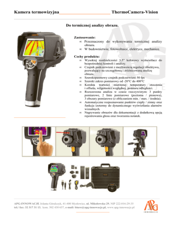 Kamera termowizyjna_________________________ ThermoCamera-Vision ______________________________________________________________ Do termicznej analizy obrazu. Zastosowanie: • Przeznaczony do wykonywania termicznej analizy obrazu. • W budownictwie, fotowoltaice, elektryce, mechanice. Cechy produktu: • • • • • • • • ________________________________ Wysokiej rozdzielczości 3,5” kolorowy wyświetlacz do bezpośredniej kontroli i analizy. Czujnik podczerwieni z możliwością regulacji obiektywu, pozwalający na szczegółową i zróżnicowaną analizę obrazu. Szerokopasmowy czujnik podczerwieni 50 fps Szeroki zakres pomiarowy od -20°C do 400°C Korekta wartości mierzonej temperatury otoczenia i offsetu, wilgotności względnej, pomiaru odległości. Rozszerzona analiza w czasie rzeczywistym: 3 punkty pomiarowe, 2 linie pomiarowe (pozioma / pionowa), 3 obszary pomiarowe (z obliczaniem min. / max. / średnia). Automatyczne rozpoznawanie punktów ciepły / zimny oraz funkcja izotermy do dynamicznego wyświetlania alarmów wizualnych. Nagrywanie obrazów dla dokumentacji z dodatkową opcją rejestrowania głosu oraz tworzenia notatek. ___________________________________________________________________________________ APG-INNOWACJE Jolanta Góralczyk, 41-400 Mysłowice, ul. Mikołowska 29, NIP 222-016-29-35 tel./ fax: 32 317 31 13, kom. 502 430 657, e-mail: [email protected], www.apg-innowacje.pl ___________________ Kamera termowizyjna_________________________ ThermoCamera-Vision ______________________________________________________________ Dane techniczne: Zakres pomiaru Dokładność Czujnik IR Optyka IR Czułość termiczna Wyświetlacz Tryby obrazu Funkcje obrazu Kamera cyfrowa Format Pamięć Porty Klasa laseru Klasa ochrony Zasilanie/Żywotność baterii Wymiary W zestawie standardowym Waga Gwarancja -20°C … 150°C, 0°C … 400°C ± 2°C lub ± 2% od zmierzonej wartości Rozdzielczość 160 x 120 pikseli, 50 fps. Niechłodzony mikrobolometryczny, 8-14 µm Wymienny obiektyw wykonany z germanu, 33° x 24°, rozdzielczość przestrzenna (IFOV) 3,33 mrad, ręczna ostrość 0,3 m min. NETD 0,08°C Kolorowy, 3,5”, TFT, ekran dotykowy Podczerwień, cyfrowy, obraz w obrazie, obraz MIX 1 – 2x zoom cyfrowy, rotacja 0° - 360°, co 1° 640 x 480 pikseli JPEG, 640 x 480 pikseli, MPEG-4 Standard – 640 x 480 pikseli, 30 fps Karta micro-SD do 16 GB USB, micro-SD, video, audio, microphone/ headphone 2 < 1 mW IP65 Zestaw baterii litowo-jonowych 7,4V/2,7 Ah/ do 7h 243 mm x 103 mm x 160 mm ThermoCamera Vision, oprogramowanie QiuckReporting, 2 akumulatory litowo-jonowe z zewnętrzną stacją ładującą, zasilacz/ ładowarka, międzynarodowy adapter, zasilaczem, kabel USB, kabel wideo/audio, mikrofon/ słuchawki, karta micro-SD 4 GB z adapterem, mocowanie do statywu 1/4”, futerał ochronny z wizjerem, skrzynka transportowa 0, 920 kg 24 miesiące ___________________________________________________________________________________ APG-INNOWACJE Jolanta Góralczyk, 41-400 Mysłowice, ul. Mikołowska 29, NIP 222-016-29-35 tel./ fax: 32 317 31 13, kom. 502 430 657, e-mail: [email protected], www.apg-innowacje.pl ___________________