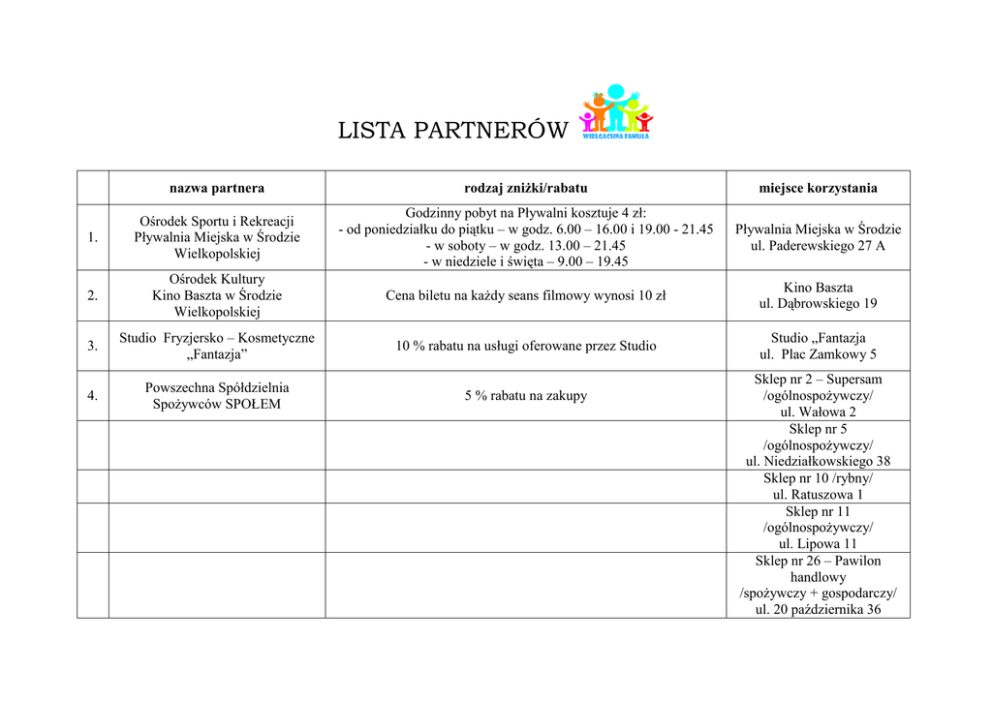 LISTA PARTNERÓW nazwa partnera rodzaj zniżki/rabatu miejsce korzystania 1. Ośrodek Sportu i Rekreacji Pływalnia Miejska w Środzie Wielkopolskiej Godzinny pobyt na Pływalni kosztuje 4 zł: - od poniedziałku do piątku – w godz. 6.00 – 16.00 i 19.00 - 21.45 - w soboty – w godz. 13.00 – 21.45 - w niedziele i święta – 9.00 – 19.45 Pływalnia Miejska w Środzie ul. Paderewskiego 27 A 2. Ośrodek Kultury Kino Baszta w Środzie Wielkopolskiej Cena biletu na każdy seans filmowy wynosi 10 zł Kino Baszta ul. Dąbrowskiego 19 3. Studio Fryzjersko – Kosmetyczne „Fantazja” 10 % rabatu na usługi oferowane przez Studio Studio „Fantazja ul. Plac Zamkowy 5 4. Powszechna Spółdzielnia Spożywców SPOŁEM 5 % rabatu na zakupy Sklep nr 2 – Supersam /ogólnospożywczy/ ul. Wałowa 2 Sklep nr 5 /ogólnospożywczy/ ul. Niedziałkowskiego 38 Sklep nr 10 /rybny/ ul. Ratuszowa 1 Sklep nr 11 /ogólnospożywczy/ ul. Lipowa 11 Sklep nr 26 – Pawilon handlowy /spożywczy + gospodarczy/ ul. 20 października 36 Sklep nr 33 /ogólnospożywczy/ ul. Sienkiewicza 5 Sklep nr 34 /ogólnospożywczy/ ul. Wrzesińska 24 Sklep nr 46 – Dom Handlowy /ogólnospożywczy/ ul. Poselska 18 Sklep nr 4 /wyroby ze szkła/ ul. Plac Armii Poznań 1 Sklep nr 13 /art. gospodarstwa domowego/ ul. Plac Armii Poznań 9 Sklep nr 37 /drogeria/ ul. Stary Rynek 1 5. Bricomarché 5 % rabatu na zakupy /z wykluczeniem towarów objętych wyprzedażą oraz promocją/ Bricomarché ul. Brodowska 30 Salon Optyczny Z. Walczak ul. Czerwonego Krzyża 14/3 KS Fight Team Środa Wielkopolska ul. Sienkiewicza 17 Bar Max ul. Paderewskiego 15 6. Salon Optyczny Z. Walczak 10 % rabatu na zakup okularów /szkła+oprawki+robocizna/ 7. Klub Sportowy Fight Team Środa Wielkopolska 50 % rabatu na zakup karnetu uprawniającego do korzystania z zajęć sportowych organizowanych przez klub /caopeira, tajski boks/ 8. Bar Max 10 % rabatu na zakup obiadów 9. Foto Studio „Chrabąszcz” 10 % rabatu na usługi fotograficzne 5 % rabatu na zakupy Foto Studio „Chrabąszcz” ul. Dąbrowskiego 1 10. Biuromix 10 % rabatu na zakupy Biuromix Ul. Paderewskiego 11 B 11. „BEWE” Chemiczne Czyszczenie Odzieży 10 % rabatu na usługi „BEWE” ul. Lipowa 10 Centrum Zoologiczne Art. Wędkarskie ul. Przecznica (Pawilon przy targowisku) Centrum Zabaw Rodzinnych „Urwis” ul. Marcinkowskiego 2D „Urwis” ul. Marcinkowskiego 2D ul. Dąbrowskiego 16 12. Centrum Zoologiczne Art. Wędkarskie 5 % rabatu na zakupy 13. Centrum Zabaw Rodzinnych „Urwis” 50 % rabatu za wstęp na plac zabaw 14. Sklep „Urwis” 5 % rabatu na zakupy 15. Stołówki Gminne 50 % zniżki na zakup drugich śniadań przygotowywanych dla uczniów szkół podstawowych i gimnazjum. W celu otrzymania zniżki rodzic dziecka zobowiązany jest udać się do siedziby Stołówek Gminnych - Ratusz ul. Plac Zamkowy 1 Stołówki Gminne Plac Zamkowy 1 16. Sklep „PIERROT” (artykuły dekoracyjne) 10 % rabatu na zakupy Sklep „PIERROT” ul. Dąbrowskiego 19 17. Uczniowski Klub Żeglarski „Środa” zwolnienie od wpisowego dla dziecka i opiekuna UKŻ „Środa” ul. Daszyńskiego 5 www.ukzsroda.pl 18. KRAWIEC Joanna Jakubowska - Piechocka 5 % rabatu na usługi krawieckie Krawiec ul. Daszyńskiego 5 Hotel Szablewski Spa&Wellness - Hotel Szablewski Centrum Spa – 10 % rabatu na korzystanie z Centrum Spa (basen kryty, sauna sucha, łaźnia parowa, sauna infared, jacuzzi) - Hotel Szablewski Gabinet Kosmetyczny Dermika – 10 % rabatu na zabiegi oraz masaże - Hotel Szablewski Restauracja – 10 % rabatu na obiady oraz organizację imprez rodzinnych Hotel Szablewski SPA&Wellness ul. Brodowska 38 C 19. 20. Sklep internetowy www.robe-rogue.pl (sklep z odzieżą damską) 8 % rabatu na zakup odzieży + bezpłatny dowóz zakupu na terenie miasta www.robe-rogue.pl 21. Sklep internetowy www.dtpsoftware.pl (sklep z oprogramowaniem komputerowym) 1 % rabatu na zakupy dokonywane w sklepie+ bezpłatny dowóz zakupu na terenie miasta www.dtpsoftware.pl 22. Salon Optyczny „Świat Okularów” ul. Czerwonego Krzyża 12/2 10 % rabatu na zakup okularów korekcyjnych i przeciwsłonecznych /oprawki+szkła+robocizna/ oraz bezpłatne badanie wzroku Salon Optyczny „Świat Okularów” ul. Czerwonego Krzyża 12/2 23. Sklep „Średzianka” 10 % rabatu na zakupy z wyłączeniem prasy, kart magnetycznych (telefonicznych) i wyrobów tytoniowych Sklep „Średzianka” ul. Dąbrowskiego 19 24. Sklep „4F” - 5 % rabatu na kolekcję firmy „4F” - 7 % rabatu na zakup obuwia Sklep „4F” ul. Powstańców 5 25. Salon Wykładzin „Kadem” - 10 % rabatu na asortyment salonu (m.in. wykładziny i tapety) ul. Żwirki i Wigury 3 (Sklep Dino) Księgarnia Edukacyjna - 15 % rabatu na zakup artykułów papierniczych - 12 % rabatu na zakup książek, podręczników i beletrystyki (z wyłączeniem książek wydawnictwa MAC) - 5 % rabatu na zakup książek wydawnictwa MAC ul. Dąbrowskiego 45 26.