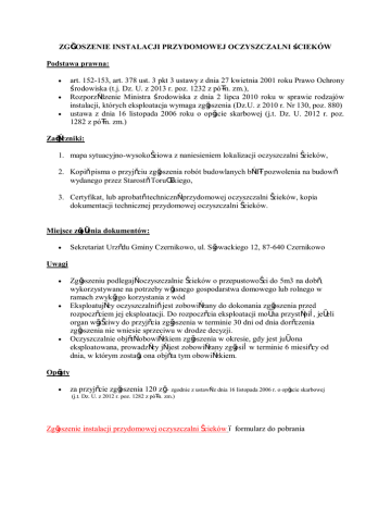 ZGŁOSZENIE INSTALACJI PRZYDOMOWEJ OCZYSZCZALNI ŚCIEKÓW Podstawa prawna: · · · art. 152-153, art. 378 ust. 3 pkt 3 ustawy z dnia 27 kwietnia 2001 roku Prawo Ochrony Środowiska (t.j. Dz. U. z 2013 r. poz. 1232 z późn. zm.), Rozporządzenie Ministra Środowiska z dnia 2 lipca 2010 roku w sprawie rodzajów instalacji, których eksploatacja wymaga zgłoszenia (Dz.U. z 2010 r. Nr 130, poz. 880) ustawa z dnia 16 listopada 2006 roku o opłacie skarbowej (j.t. Dz. U. 2012 r. poz. 1282 z późn. zm.) Załączniki: 1. mapa sytuacyjno-wysokościowa z naniesieniem lokalizacji oczyszczalni ścieków, 2. Kopię pisma o przyjęciu zgłoszenia robót budowlanych bądź pozwolenia na budowę wydanego przez Starostę Toruńskiego, 3. Certyfikat, lub aprobatę techniczną przydomowej oczyszczalni ścieków, kopia dokumentacji technicznej przydomowej oczyszczalni ścieków. Miejsce złożenia dokumentów: · Sekretariat Urzędu Gminy Czernikowo, ul. Słowackiego 12, 87-640 Czernikowo Uwagi · · · Zgłoszeniu podlegają oczyszczalnie ścieków o przepustowości do 5m3 na dobę, wykorzystywane na potrzeby własnego gospodarstwa domowego lub rolnego w ramach zwykłego korzystania z wód Eksploatujący oczyszczalnię jest zobowiązany do dokonania zgłoszenia przed rozpoczęciem jej eksploatacji. Do rozpoczęcia eksploatacji można przystąpić, jeżeli organ właściwy do przyjęcia zgłoszenia w terminie 30 dni od dnia doręczenia zgłoszenia nie wniesie sprzeciwu w drodze decyzji. Oczyszczalnie objętą obowiązkiem zgłoszenia w okresie, gdy jest już ona eksploatowana, prowadzący ją jest zobowiązany zgłosić w terminie 6 miesięcy od dnia, w którym została ona objęta tym obowiązkiem. Opłaty · za przyjęcie zgłoszenia 120 zł - zgodnie z ustawą z dnia 16 listopada 2006 r. o opłacie skarbowej (j.t. Dz. U. z 2012 r. poz. 1282 z późn. zm.) Zgłoszenie instalacji przydomowej oczyszczalni ścieków – formularz do pobrania Czernikowo, dnia ……………… Imię i nazwisko……. ………………… ………………………………………… Adres …………………………….......... …………………………………………. Tel. e-mail …………………………….. Wójt Gminy Czernikowo ul. Słowackiego 12 87-640 Czernikowo Zgłoszenie instalacji przydomowej oczyszczalni ścieków, której eksploatacja nie wymaga zezwolenia. Zgodnie z wymaganiami art. 152 ust. 1 ustawy z dnia 27 kwietnia 2001 r. Prawo ochrony środowiska (t.j. Dz. U. z 2013 r. poz. 1232 z późn. zm.) oraz rozporządzenia Ministra Środowiska z dnia 2 lipca 2010 r. w sprawie rodzajów instalacji, których eksploatacja wymaga zgłoszenia (Dz. U. z 2010 r. Nr 130, poz. 880), zgłaszam następującą instalację: ………………………………………………………………………………………………… ………………………………………………………………………………………………… na terenie nieruchomości położonej w granicach działki nr ………… obręb ……………… ,której jestem właścicielem/ką*, wieczystym użytkownikiem* lub …………………….. * inna forma dysponowania nieruchomością 1.Adres i nazwa miejscowości na terenie której prowadzona jest eksploatacja przydomowej oczyszczalni ścieków, ……………………………...........…………………………………………………………...... ………………………………………………………………………..........…………………... 2.Charakterystyka przydomowej oczyszczalni ścieków: …………………………………………………………………………………………………. …………………………………………………………………………………………………. 3. Przeznaczenie oczyszczalni (właściwe zaznaczyć) ñ na potrzeby własne gospodarstwa domowego ñ na potrzeby własne gospodarstwa rolnego 4. Czas funkcjonowania instalacji; praca cały rok /okresowo (podać okres) ………………………………………………………………………………………………… 5. Przepustowość oczyszczalni wynosi ….......................m3/dobę. 6. Stopień ograniczenia wielkości emisji jest zgodny z Rozporządzeniem Ministra Środowiska z dnia 24.07.2006 r. w sprawie warunków, jakie należy spełnić przy wprowadzaniu ścieków do wód lub do ziemi oraz w sprawie substancji szczególnie szkodliwych dla środowiska wodnego /Dz.U. Nr 137 poz. 984/ tj: - Najwyższe dopuszczalne wartości wskaźników zanieczyszczeń w odprowadzanych ściekach wynoszą: BZT5 – 25 mgO2/l, ChZT Cr – 125 mgO2/l, zawiesiny ogólne – 35 mg/l 7. Opis zastosowania technologii oczyszczania ścieków. ………………………………………………………………………………………………… ………………………………………………………………………………………………… ………………………………………………………………………………………………… ………………………………………. podpis zgłaszającego – prowadzącego instalację Załączniki: ·Mapa sytuacyjno-wysokościowa z naniesioną lokalizacją oczyszczalni, ·Dowód uiszczenia opłaty skarbowej – 120 zł1, ·Kopię pisma o przyjęciu zgłoszenia robót budowlanych bądź pozwolenia na budowę wydanego przez Starostę Toruńskiego, ·Certyfikat, lub aprobatę techniczną przydomowej oczyszczalni ścieków, kopia dokumentacji technicznej przydomowej oczyszczalni ścieków. 1 – zgodnie z ustawą z dnia 16 listopada 2006 r o opłacie skarbowej (j.t. Dz. U. z 2012 r. poz.1282 z późn. zm.)