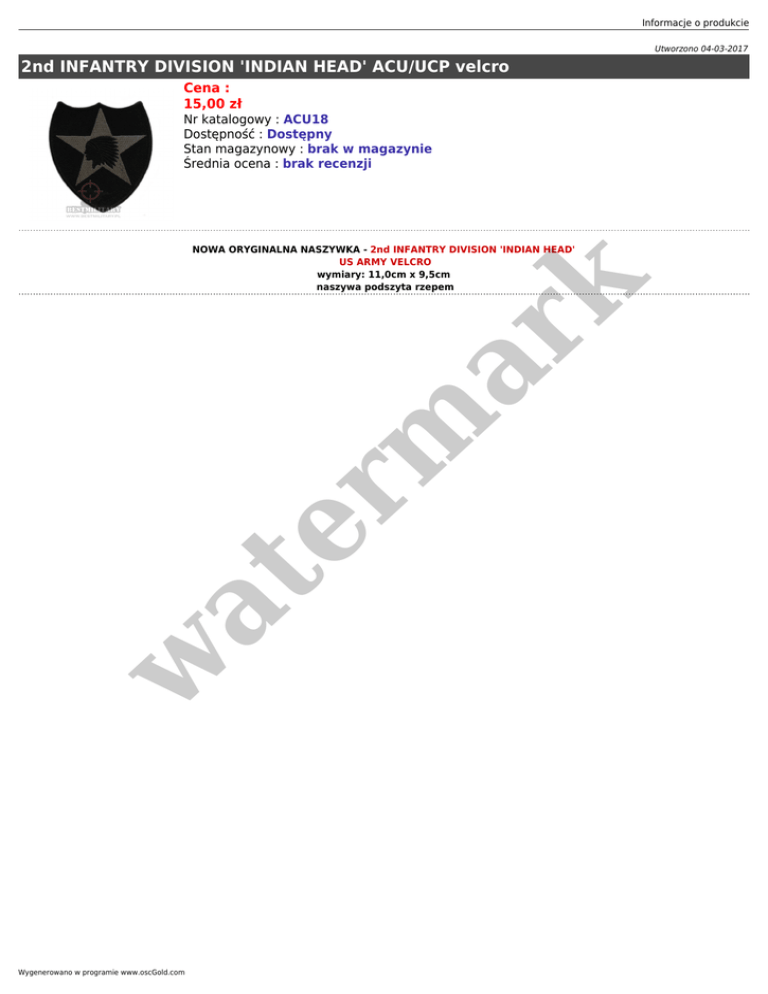 Informacje o produkcie Utworzono 04-03-2017 2nd INFANTRY DIVISION 'INDIAN HEAD' ACU/UCP velcro Cena : 15,00 zł Nr katalogowy : ACU18 Dostępność : Dostępny Stan magazynowy : brak w magazynie Średnia ocena : brak recenzji w at er m ar k NOWA ORYGINALNA NASZYWKA - 2nd INFANTRY DIVISION 'INDIAN HEAD' US ARMY VELCRO wymiary: 11,0cm x 9,5cm naszywa podszyta rzepem Wygenerowano w programie www.oscGold.com