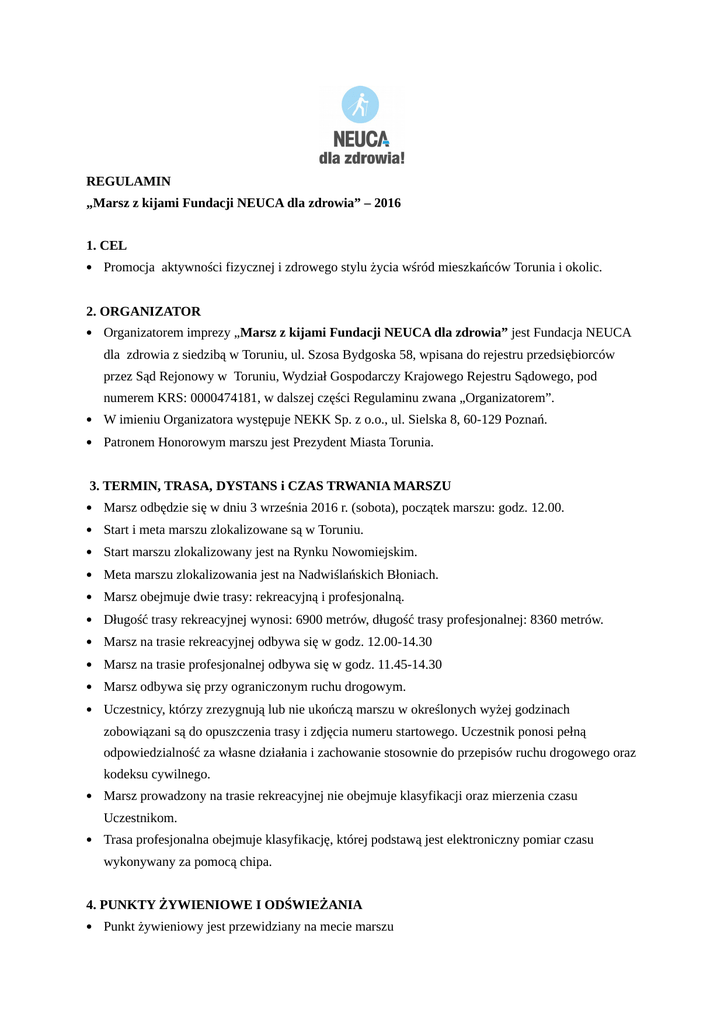 REGULAMIN „Marsz z kijami Fundacji NEUCA dla zdrowia” – 2016 1. CEL Promocja aktywności fizycznej i zdrowego stylu życia wśród mieszkańców Torunia i okolic. 2. ORGANIZATOR Organizatorem imprezy „Marsz z kijami Fundacji NEUCA dla zdrowia” jest Fundacja NEUCA dla zdrowia z siedzibą w Toruniu, ul. Szosa Bydgoska 58, wpisana do rejestru przedsiębiorców przez Sąd Rejonowy w Toruniu, Wydział Gospodarczy Krajowego Rejestru Sądowego, pod numerem KRS: 0000474181, w dalszej części Regulaminu zwana „Organizatorem”. W imieniu Organizatora występuje NEKK Sp. z o.o., ul. Sielska 8, 60-129 Poznań. Patronem Honorowym marszu jest Prezydent Miasta Torunia. 3. TERMIN, TRASA, DYSTANS i CZAS TRWANIA MARSZU Marsz odbędzie się w dniu 3 września 2016 r. (sobota), początek marszu: godz. 12.00. Start i meta marszu zlokalizowane są w Toruniu. Start marszu zlokalizowany jest na Rynku Nowomiejskim. Meta marszu zlokalizowania jest na Nadwiślańskich Błoniach. Marsz obejmuje dwie trasy: rekreacyjną i profesjonalną. Długość trasy rekreacyjnej wynosi: 6900 metrów, długość trasy profesjonalnej: 8360 metrów. Marsz na trasie rekreacyjnej odbywa się w godz. 12.00-14.30 Marsz na trasie profesjonalnej odbywa się w godz. 11.45-14.30 Marsz odbywa się przy ograniczonym ruchu drogowym. Uczestnicy, którzy zrezygnują lub nie ukończą marszu w określonych wyżej godzinach zobowiązani są do opuszczenia trasy i zdjęcia numeru startowego. Uczestnik ponosi pełną odpowiedzialność za własne działania i zachowanie stosownie do przepisów ruchu drogowego oraz kodeksu cywilnego. Marsz prowadzony na trasie rekreacyjnej nie obejmuje klasyfikacji oraz mierzenia czasu Uczestnikom. Trasa profesjonalna obejmuje klasyfikację, której podstawą jest elektroniczny pomiar czasu wykonywany za pomocą chipa. 4. PUNKTY ŻYWIENIOWE I ODŚWIEŻANIA Punkt żywieniowy jest przewidziany na mecie marszu 5. ZASADY UCZESTNICTWA W MARSZU Organizator nie ogranicza liczby Uczestników marszu na trasie rekreacyjnej. Liczba Uczestników na trasie profesjonalnej ograniczona jest do 500 Uczestników. Ilość pakietów startowych na trasie rekreacyjnej ograniczona jest do 3000, ilość pakietów startowych na trasie profesjonalnej ograniczona jest do 500. W marszu samodzielnie mogą uczestniczyć osoby, które najpóźniej w dniu marszu ukończyły 12 lat. Osoby niepełnoletnie zobowiązane są dostarczyć do Organizatora marszu „Oświadczenia Rodzica lub Opiekuna prawnego o zdolności dziecka (imię i nazwisko) do udziału w marszu” z podpisem rodzica bądź opiekuna prawnego, wyrażającego zgodę na udział w marszu osoby niepełnoletniej i biorącego za nią odpowiedzialność. Bez przedłożenia Oświadczenia odbiór pakietu startowego nie będzie możliwy. Warunkiem uczestnictwa w marszu jest prawidłowe wypełnienie i przekazanie do Organizatora marszu Formularza Rejestracyjnego. Przekazanie prawidłowo wypełnionego formularza odbywa się w formie elektronicznej na stronie www.neucadlazdrowia.pl/rejestracja. Wypełnienie Formularza Rejestracyjnego jest jednoznaczne z akceptacją niniejszego Regulaminu. Organizator zastrzega sobie prawo do odrzucenia każdego Formularza Rejestracyjnego, co do którego istnieje podejrzenie, że został wypełniony niezgodnie z prawdą oraz do zdyskwalifikowania każdego Uczestnika, wobec, którego istnieje uzasadnione przekonanie, że naruszył warunki Regulaminu. Warunkiem koniecznym jest potwierdzenie rejestracji poprzez kliknięcie linku aktywacyjnego, który zostanie wysłany po wypełnieniu formularza w pierwszym mailu zwrotnym na podany w trakcie rejestracji adres oraz potwierdzeniu adresu email (podanego w formularzu rejestracyjnym). W celu zapewnienia kompletnej i wiarygodnej listy startowej marszu Uczestnicy muszą zostać zweryfikowani w namiocie Organizatora marszu zlokalizowanym na Rynku Nowomiejskim w Toruniu w dniu 3 września 2016 r. Godziny otwarcia biura podane są niżej w punkcie 6 niniejszego regulaminu. Podczas weryfikacji Uczestnicy muszą posiadać dokument potwierdzający tożsamość dla sprawdzenia daty urodzenia i adresu, osoby niepełnoletnie zobowiązane są dostarczyć właściwe oświadczenie o którym mowa w punkcie 5 (patrz powyżej). Organizator zastrzega sobie, a także podmiotom z nim powiązanym, prawo do przeprowadzenia z każdym z Uczestników wywiadów, robienia zdjęć i/lub filmowania, używania imion i nazwisk, wizerunku, podobizny lub głosu oraz innych materiałów pochodzących lub związanych z uczestnictwem w marszu na potrzeby reklamowe, promocyjne, a także możliwość ich wykorzystania w Internecie lub transmisjach radiowo-telewizyjnych oraz na wszelkie inne potrzeby komercyjne z prawem do ich modyfikowania. Organizator zastrzega sobie, a także podmiotom powiązanym, prawo do nieodpłatnego wykorzystania wszelkich zdjęć, materiałów filmowych, wywiadów i nagrań przedstawiających Uczestników, które mogą być bezpłatnie umieszczane na wybranych nośnikach elektronicznych, katalogach oraz mediach: telewizja, radio, gazety, magazyny, strony internetowe na potrzeby reklamowe i promocyjne. Jednocześnie Uczestnik zgadza się na możliwość zmian, modyfikacji i skrótów związanych z użyciem imienia, wizerunku, podobizny czy głosu. Uczestnik oświadcza, że Organizator nie jest i nie będzie zobligowany do uiszczenia jakichkolwiek opłat związanych z działaniami opisanymi w niniejszym punkcie, udzielając tym samym nieograniczonej licencji na używanie wypowiedzi, informacji bez powiadomienia w celu reklamy i promocji marszu. Zabrania się wnoszenia na trasę marszu przedmiotów, które mogą być niebezpieczne dla innych Uczestników. Zabrania się wnoszenia środków odurzających, nielegalnych substancji oraz napojów alkoholowych jakiegokolwiek rodzaju. Uczestnikom zabrania się zażywania i posiadania wyżej wymienionych środków i substancji, zarówno przed, jak i w trakcie marszu. Organizator za