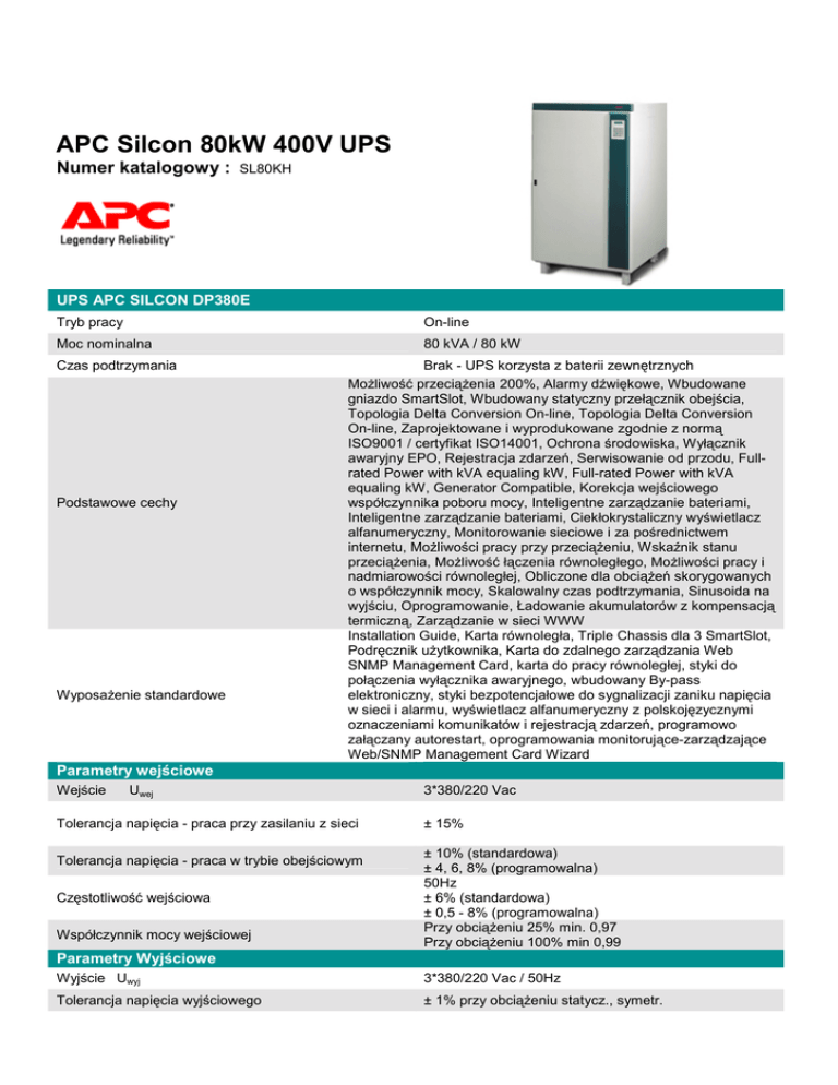 APC Silcon 80kW 400V UPS Numer katalogowy : SL80KH UPS APC SILCON DP380E Tryb pracy On-line Moc nominalna 80 kVA / 80 kW Czas podtrzymania Podstawowe cechy Wyposażenie standardowe Brak - UPS korzysta z baterii zewnętrznych Możliwość przeciążenia 200%, Alarmy dźwiękowe, Wbudowane gniazdo SmartSlot, Wbudowany statyczny przełącznik obejścia, Topologia Delta Conversion On-line, Topologia Delta Conversion On-line, Zaprojektowane i wyprodukowane zgodnie z normą ISO9001 / certyfikat ISO14001, Ochrona środowiska, Wyłącznik awaryjny EPO, Rejestracja zdarzeń, Serwisowanie od przodu, Fullrated Power with kVA equaling kW, Full-rated Power with kVA equaling kW, Generator Compatible, Korekcja wejściowego współczynnika poboru mocy, Inteligentne zarządzanie bateriami, Inteligentne zarządzanie bateriami, Ciekłokrystaliczny wyświetlacz alfanumeryczny, Monitorowanie sieciowe i za pośrednictwem internetu, Możliwości pracy przy przeciążeniu, Wskaźnik stanu przeciążenia, Możliwość łączenia równoległego, Możliwości pracy i nadmiarowości równoległej, Obliczone dla obciążeń skorygowanych o współczynnik mocy, Skalowalny czas podtrzymania, Sinusoida na wyjściu, Oprogramowanie, Ładowanie akumulatorów z kompensacją termiczną, Zarządzanie w sieci WWW Installation Guide, Karta równoległa, Triple Chassis dla 3 SmartSlot, Podręcznik użytkownika, Karta do zdalnego zarządzania Web SNMP Management Card, karta do pracy równoległej, styki do połączenia wyłącznika awaryjnego, wbudowany By-pass elektroniczny, styki bezpotencjałowe do sygnalizacji zaniku napięcia w sieci i alarmu, wyświetlacz alfanumeryczny z polskojęzycznymi oznaczeniami komunikatów i rejestracją zdarzeń, programowo załączany autorestart, oprogramowania monitorujące-zarządzające Web/SNMP Management Card Wizard Parametry wejściowe Wejście Uwej Tolerancja napięcia - praca przy zasilaniu z sieci Tolerancja napięcia - praca w trybie obejściowym Częstotliwość wejściowa Współczynnik mocy wejściowej 3*380/220 Vac ± 15% ± 10% (standardowa) ± 4, 6, 8% (programowalna) 50Hz ± 6% (standardowa) ± 0,5 - 8% (programowalna) Przy obciążeniu 25% min. 0,97 Przy obciążeniu 100% min 0,99 Parametry Wyjściowe Wyjście Uwyj 3*380/220 Vac / 50Hz Tolerancja napięcia wyjściowego ± 1% przy obciążeniu statycz., symetr. Częstotliwość wyjściowa Odkształcenia napięcia Współczynnik mocy obciążenia ± 3% przy obciążeniu statycz, asymetr. ± 5% przy obciążeniu 0 - 100% 50Hz (synchronizacja z siecią) ± 0,1% przy pracy bateryjnej Maks. 3%, obciążenie liniowe Maks. 5%, obciążenie nieliniowym Od 0,9 poj. do 0,8 ind. Sprawność obciążenie liniowe Sprawność przetwarzania AC/AC Wy/We dla 100% obc. 96,5% Sprawność przetwarzania AC/AC Wy/We dla 75% obc. 96,1% Sprawność przetwarzania DC/AC Wy/We dla 100% obc. 96,1% Sprawność przetwarzania DC/AC Wy/We dla 75% obc. 96,1% Sprawność obciążenie SMPS Sprawność przetwarzania AC/AC Wy/We dla 100% obc. 93,9% Sprawność przetwarzania AC/AC Wy/We dla 75% obc. 93,5% Sprawność przetwarzania DC/AC Wy/We dla 100% obc. 93,5% Sprawność przetwarzania DC/AC Wy/We dla 75% obc. 93,2% Przeciążalność falownika Praca przy zasilaniu z baterii 200% - 60 sekund 125% - 10 minut 150% - 3 sekund Praca w trybie obejściowym 1000% -500 milisekund Praca przy zasilaniu z sieci Cechy fizyczne Maksymalna szerokość 800 mm Maksymalna wysokość 1400 mm Maksymalna głębokość 800 mm Ciężar netto (bez baterii) 447 kg Suma strat własnych < 2,4 kW (obc. znamionowe) Ul. Ślężna 202, 53-113 Wrocław Tel.: +48 (0) 71 344 99 00 Fax: +48 (0) 71 344 99 20 [email protected] www.silcon.pl