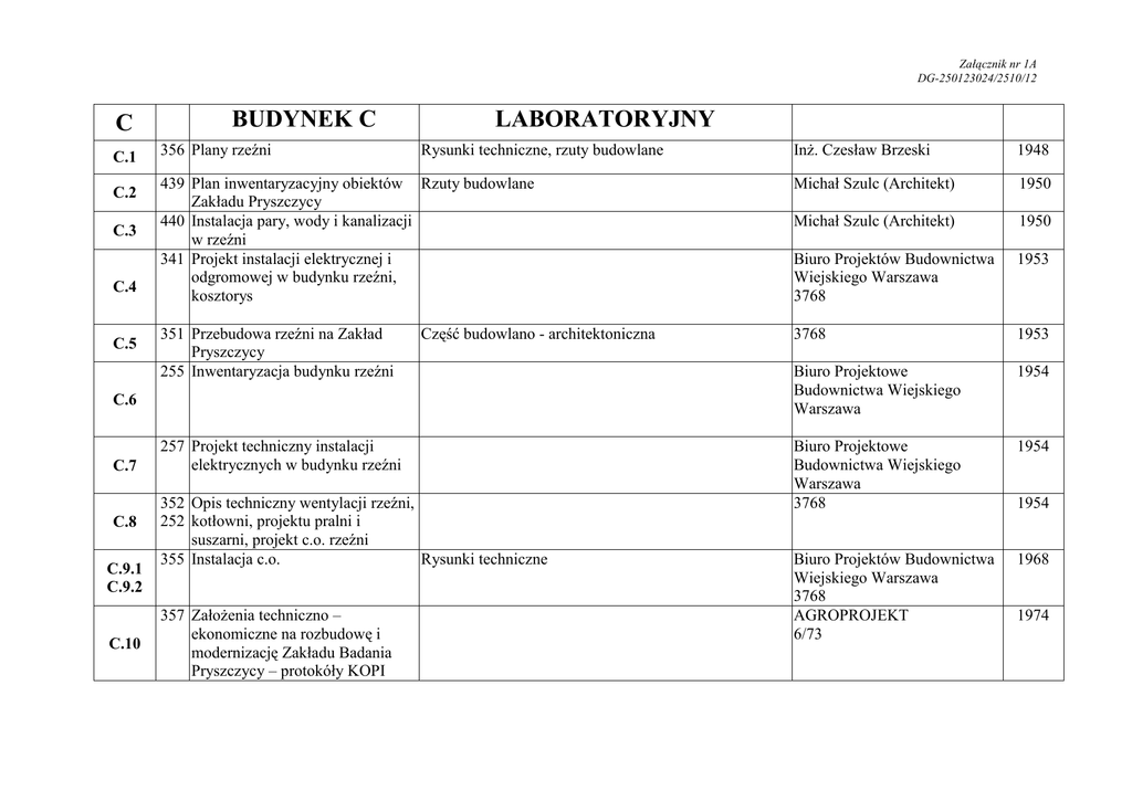 Załącznik nr 1A DG-250123024/2510/12 C C.1 C.2 C.3 C.4 C.5 BUDYNEK C 356 Plany rzeźni LABORATORYJNY Inż. Czesław Brzeski 1948 439 Plan inwentaryzacyjny obiektów Rzuty budowlane Zakładu Pryszczycy 440 Instalacja pary, wody i kanalizacji w rzeźni 341 Projekt instalacji elektrycznej i odgromowej w budynku rzeźni, kosztorys Michał Szulc (Architekt) 1950 Michał Szulc (Architekt) 1950 Biuro Projektów Budownictwa Wiejskiego Warszawa 3768 1953 351 Przebudowa rzeźni na Zakład Pryszczycy 255 Inwentaryzacja budynku rzeźni 3768 1953 Biuro Projektowe Budownictwa Wiejskiego Warszawa 1954 Biuro Projektowe Budownictwa Wiejskiego Warszawa 3768 1954 Biuro Projektów Budownictwa Wiejskiego Warszawa 3768 AGROPROJEKT 6/73 1968 Rysunki techniczne, rzuty budowlane Część budowlano - architektoniczna C.6 C.7 C.8 C.9.1 C.9.2 C.10 257 Projekt techniczny instalacji elektrycznych w budynku rzeźni 352 Opis techniczny wentylacji rzeźni, 252 kotłowni, projektu pralni i suszarni, projekt c.o. rzeźni 355 Instalacja c.o. Rysunki techniczne 357 Założenia techniczno – ekonomiczne na rozbudowę i modernizację Zakładu Badania Pryszczycy – protokóły KOPI 1954 1974 1 PROJEKT TECHNICZNY: Elementów aluminiowych zewnętrznych i elementy aluminiowe – przegrody wewnętrznych drzwi , okien, sufitu podwieszonego, wewnętrzne ścianek wewnętrznych, okna podawczego z kosztorysami. PT elektryczna instalacja przeciwporażeniowa. PROJEKT TECHNICZNY: PT elementów aluminiowych: drzwi elementów aluminiowych: drzwi przesuwane2100x1200 oraz 2100x900 przesuwane PT okno podawcze - aluminium PT okno podawcze – aluminium 1200x900 METAL PLAST POZNAŃ 1982 METAL PLAST POZNAŃ 1982 METAL PLAST POZNAŃ PT elementy zewnętrzne, przegrody wewnętrzne. Drzwi METAL PLAST przesuwane i okno podawcze POZNAŃ 1982 Część konstrukcyjna PREMA – PROJEKT 20/83 1983 Poświadczenie, opis techniczny stałego zbiornika ciśnieniowego, rysunki techniczne, karta gwarancyjna Zespół Rzeczoznawców SNTIPS. Warszawa 9142 PREMA-PROJEKT 58/84 1983 Część technologiczna C.18.1 262 PTJ modernizacji i remontu budynku rzeźni C.18.2 278 Koncepcja modernizacji i remontu C.19 budynku rzeźni – 4egz. PREMA – PROJEKT 58/84 PREMA – PROJEKT 58/84 1984 C.20.1 263 PTJ modernizacji i remontu budynku rzeźni C.20.2 C.20.3 264 PTJ modernizacji i remontu C.21 budynku rzeźni Instalacje teletechniczne, kosztorys PREMA – PROJEKT 58/84 1985 Instalacje elektryczne, siły, światła i odgromowa. AKP. Kosztorys PREMA – PROJEKT 58/84 1985 C.11 2 C.12 C.13 C.14 C.15 3 4 PT elementów aluminiowych , 270 Opinia techniczna o stanie budynku rzeźni 364 Dokumentacja technologia produkcji konserw z mięsa C.16 wołowego na potrzeby IW ZBP 261 PTJ modernizacji i remontu C.17.1 budynku rzeźni C.17.2 Instalacje co i zasilania nagrzewnic 1982 1984 1984 Instalacje chłodnicze, pary technologicznej i kondensatu PREMA – PROJEKT oraz sprężonego powietrza 58/84 C.22 265 PTJ modernizacji i remontu budynku rzeźni 266 PTJ modernizacji i remontu rzeźni AKP dla instalacji wentylacji i kotłowni – projekt instalacyjny, kosztorys PREMA – PROJEKT 58/84 1985 C.23 267 PTJ modernizacji i remontu budynku rzeźni Część ogólna z wytycznymi realizacji inwestycji. Dokumentacja przetargowa PREMA – PROJEKT 58/84 1985 C.24 268 PTJ modernizacji i remontu budynku rzeźni Opinia techniczna o nośności ścian działowych PREMA – PROJEKT 58/84 1985 C.25 Część konstrukcyjna PREMA – PROJEKT 58/84 1985 Część architektoniczna i plan realizacyjny zagospodarowania terenu, kosztorys, zestawienie kosztów Część wodno kanalizacyjna PREMA – PROJEKT 58/84 1985 PREMA – PROJEKT 58/84 1985 Część wentylacyjna PREMA – PROJEKT 58/84 1985 Część technologiczna PREMA-PROJEKT 58/84 1985 1000*700 do magazynu skór PREMA - PROJEKT 1986 C.26.1 269 PTJ modernizacji i remontu budynku rzeźni C.26.2 272 PTJ modernizacji i remontu budynku rzeźni C.27 C.28 273 PTJ modernizacji i remontu budynku rzeźni C.29 274 PTJ modernizacji i remontu budynku rzeźni C.30.1 277 Aneks do PTJ modernizacji i remontu budynku rzeźni C.30.2 283 Projekt drzwi powietrzno C.31 szczelnych w budynku rzeźni, C.32 258 Protokoły odbiorcze budynku rzeźni, dziennik budowy 1985 1987 GEOPROJEKT Łódź 1988 C.33 434 Techniczne badanie podłoża gruntowego 286 Adaptacja projektu automatycznej Część instalacyjna regulacji klimatyzacji PREMA - PROJEKT 1989 C.34 456 PT konstrukcji stropu wewnętrznego nad pomieszczeniem autoklawów 454 Wycena – oszacowanie wartości – sterylizatorów mięsa 457 Ocena kosztorysów na modernizację budynku na potrzeby szczepionki 471 Modernizacja Budynku C dla potrzeb oddziału produkcji szczepionek 472 Modernizacja Budynku C dla potrzeb oddziału produkcji szczepionek 473 Modernizacja Budynku C dla potrzeb oddziału produkcji szczepionek 474 Modernizacja Budynku C dla potrzeb oddziału produkcji szczepionek 475 Modernizacja Budynku C dla potrzeb oddziału produkcji szczepionek Pracownia Projektowa PION 1997 C.35 C.36 C.37 C.38 C.39 C.40 C.41 C.42 Mgr inż. Kazimierz Chwałowski Oferta PUBHT, oferta PPHU „ELEKTROINSTAL”, Pracownia Projektowa PION oferta przedsiębiorstwa wielobranżowego „EKO-WIS ”, 9/99 oferta PBM „PEBEX”, wnioski Część budowlano-konstrukcyjna, kosztorys Pracownia Projektowa PION 16/98 Klimatyzacja i chłodnictwo dla klimatyzacji, kosztorys Pracownia Projektowa PION 16/98 Instalacje co i zasilania nagrzewnic wentylacyjnych. Pracownia Projektowa Rysunki zamienne pomiędzy pionami 7B-11 PION 16/98 Instalacje elektryczne Pracownia Projektowa PION 16/98 Instalacje wodno-kanalizacyjne Pracownia Projektowa PION 16/98 1999 1999 1999 1999 1999 1999 1999