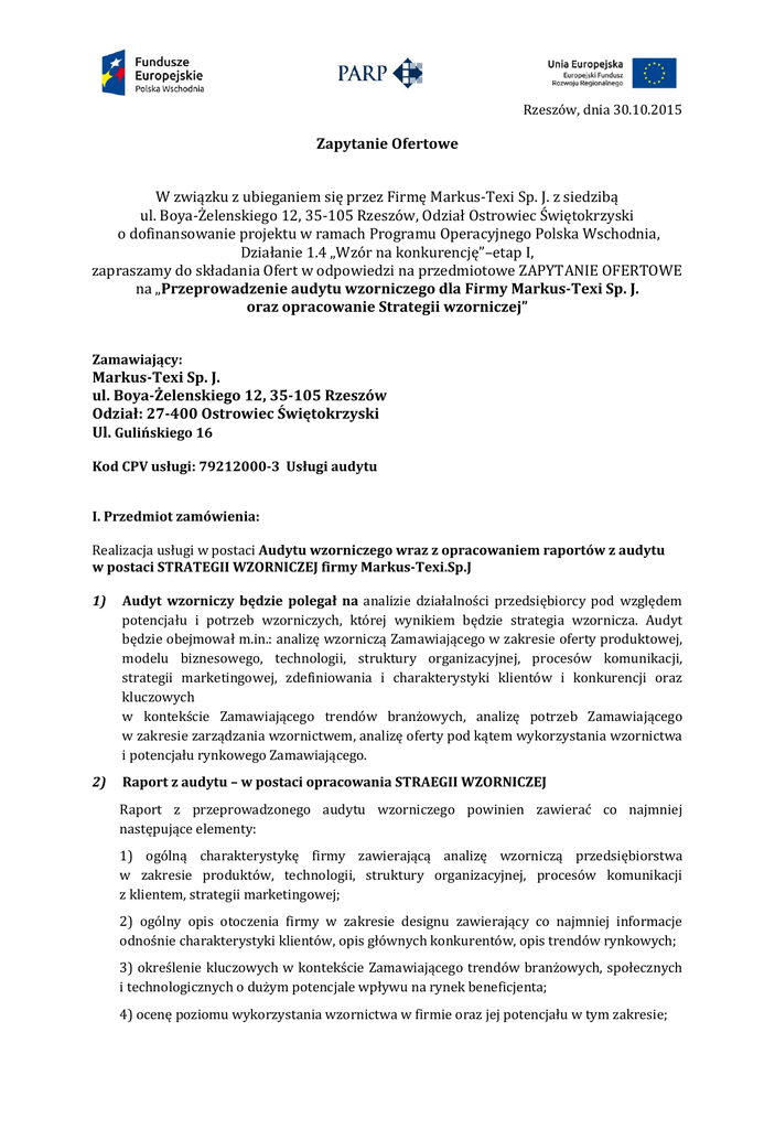 Rzeszów, dnia 30.10.2015 Zapytanie Ofertowe W związku z ubieganiem się przez Firmę Markus-Texi Sp. J. z siedzibą ul. Boya-Żelenskiego 12, 35-105 Rzeszów, Odział Ostrowiec Świętokrzyski o dofinansowanie projektu w ramach Programu Operacyjnego Polska Wschodnia, Działanie 1.4 „Wzór na konkurencję”–etap I, zapraszamy do składania Ofert w odpowiedzi na przedmiotowe ZAPYTANIE OFERTOWE na „Przeprowadzenie audytu wzorniczego dla Firmy Markus-Texi Sp. J. oraz opracowanie Strategii wzorniczej” Zamawiający: Markus-Texi Sp. J. ul. Boya-Żelenskiego 12, 35-105 Rzeszów Odział: 27-400 Ostrowiec Świętokrzyski Ul. Gulińskiego 16 Kod CPV usługi: 79212000-3 Usługi audytu I. Przedmiot zamówienia: Realizacja usługi w postaci Audytu wzorniczego wraz z opracowaniem raportów z audytu w postaci STRATEGII WZORNICZEJ firmy Markus-Texi.Sp.J 1) Audyt wzorniczy będzie polegał na analizie działalności przedsiębiorcy pod względem potencjału i potrzeb wzorniczych, której wynikiem będzie strategia wzornicza. Audyt będzie obejmował m.in.: analizę wzorniczą Zamawiającego w zakresie oferty produktowej, modelu biznesowego, technologii, struktury organizacyjnej, procesów komunikacji, strategii marketingowej, zdefiniowania i charakterystyki klientów i konkurencji oraz kluczowych w kontekście Zamawiającego trendów branżowych, analizę potrzeb Zamawiającego w zakresie zarządzania wzornictwem, analizę oferty pod kątem wykorzystania wzornictwa i potencjału rynkowego Zamawiającego. 2) Raport z audytu – w postaci opracowania STRAEGII WZORNICZEJ Raport z przeprowadzonego audytu wzorniczego powinien zawierać co najmniej następujące elementy: 1) ogólną charakterystykę firmy zawierającą analizę wzorniczą przedsiębiorstwa w zakresie produktów, technologii, struktury organizacyjnej, procesów komunikacji z klientem, strategii marketingowej; 2) ogólny opis otoczenia firmy w zakresie designu zawierający co najmniej informacje odnośnie charakterystyki klientów, opis głównych konkurentów, opis trendów rynkowych; 3) określenie kluczowych w kontekście Zamawiającego trendów branżowych, społecznych i technologicznych o dużym potencjale wpływu na rynek beneficjenta; 4) ocenę poziomu wykorzystania wzornictwa w firmie oraz jej potencjału w tym zakresie; 5) zdefiniowanie problemów wzorniczych w firmie, przy czym problemy te mogą dotyczyć zarówno produktu, jak i innych procesów biznesowych w firmie; 6) rekomendacje dalszych szczegółowych działań dla firmy; II. Sposoby i metody pracy Wykonawcy z Zamawiającym 1) Audyt wzorniczy zostanie przeprowadzony w siedzibie Zamawiającego w zakresie niezbędnym do przeprowadzenia wszystkich czynności związanych z zebraniem informacji potrzebnych do sporządzenia Strategii Wzorniczej, przez pracowników Wykonawcy Audytu wzorniczego. Zakres audytu powinien być zgodny z opisem wskazanym w pkt I Przedmiot zamówienia oraz dokumentacją konkursową dla Działania 1.4 Wzór na konkurencję PO PW. 2) Analiza obszarów objętych Audytem wzorniczym przez Wykonawcę usługi. 3) Prezentacja wyników przeprowadzonego Audytu Wzorniczego na spotkaniu z Zamawiającym. Podczas spotkania Wykonawca przedstawi Zamawiającemu Raport z rekomendacjami z przeprowadzonego Audytu wzorniczego w postaci Strategii Wzorniczej. Przedstawienie raportu nastąpi w formie prezentacji ustnej oraz przekazaniu dwóch egzemplarzy papierowych wydruku wraz z kopią na nośniku elektronicznym, który Wykonawca przekaże Zamawiającemu na przedmiotowym spotkaniu. Przygotowanie wersji papierowej wydruku wraz z kopią na nośniku elektronicznym raportu należy do obowiązku Wykonawcy. 4) Zamawiający ma prawo do wprowadzenia uwag do treści przedstawionego Raportu Wzorniczego a Wykonawca ma obowiązek ujęcia przedmiotowych uwag w ostatecznej wersji Strategii Wzorniczej. 5) Wykonawca ma obowiązek uwzględnienia uwag PARP w ostatecznej wersji Strategii Wzorniczej. Specyfikacja techniczna raportu: I. wydruk w formie papierowej, format min. A4, spięte na trwałe w jedną całość, ilość sztuk 2 II. nośnik elektroniczny (CD/DVD) – zakres zawartości identyczny jak w wersji papierowej Odbiór usługi: Odbiór usługi pomiędzy Wykonawcą a Zamawiającym nastąpi na podstawie podpisanego protokołu zdawczo-odbiorczego pomiędzy Wykonawcą a Zamawiającym. III. Wymagania wobec Wykonawcy: Wymagania wobec Wykonawcy zostały podzielone na obligatoryjne i premiujące. Na etapie oceny spełnienia kryteriów przedmiotowego Zapytania ofertowego będzie oceniane czy Oferent spełnił wymogi obligatoryjne i po ich pozytywnej ocenie komisja przystąpi do oceny wymogów premiujących. W przypadku niespełnienia wymogów obligatoryjnych oferta zostanie odrzucona i nie będzie podlegała dalszej ocenie. Spełnienie określonych poniżej wymogów premiujących oznacza uzyskanie przez Oferenta dodatkowych punktów, których waga określona została pod każdym kryterium. 1. Wymogi obligatoryjne: Wykonawca posiada udokumentowane doświadczenie w projektowaniu strategii rozwoju produktów (wyrobów lub usług) tj. przeprowadził co najmniej trzy projekty w tym zakresie wraz z wdrożeniem na rynek w ostatnich pięciu latach. Wskazane jest, aby Wykonawca posiadał doświadczenie w projektowaniu oraz wdrażaniu produktów w trzech różnych branżach gospodarki. W przypadku, gdy wykonawca posiada doświadczenie w projektowaniu i wdrażaniu produktów tylko w jednej branży, może być wykonawcą w projektach dotyczących branży gospodarki, w której posiada doświadczenie. Branża Zamawiającego: budowlana Dokumentacją potwierdzającą doświadczenie powinny być w szczególności referencje odbiorców usług, przedstawiające zakres zrealizowanych prac wraz z osiągniętymi efektami. Do realizacji audytu Wykonawca wskaże co najmniej dwóch ekspertów, z których każdy posiada doświadczenie w realizacji co najmniej trzech projektów w zakresie projektowania strategii