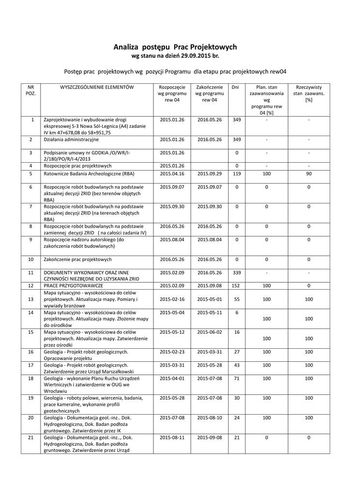 Analiza postępu Prac Projektowych wg stanu na dzień 29.09.2015 br. Postęp prac projektowych wg pozycji Programu dla etapu prac projektowych rew04 NR POZ. Rozpoczęcie wg programu rew 04 Zakończenie wg programu rew 04 Zaprojektowanie i wybudowanie drogi ekspresowej S-3 Nowa Sól-Legnica (A4) zadanie IV km 47+678,08 do 58+951,75 Działania administracyjne 2015.01.26 2016.05.26 2015.01.26 2016.05.26 Podpisanie umowy nr GDDKiA /O/WR/I2/180/PO/R/I-4/2013 Rozpoczęcie prac projektowych Ratownicze Badania Archeologiczne (RBA) 2015.01.26 2015.01.26 2015.04.16 Rozpoczęcie robót budowlanych na podstawie aktualnej decyzji ZRID (bez terenów objętych RBA) Rozpoczęcie robót budowlanych na podstawie aktualnej decyzji ZRID (na terenach objętych RBA) Rozpoczęcie robót budowlanych na podstawie zamiennej decyzji ZRID ( na całości zadania IV) Rozpoczęcie nadzoru autorskiego (do zakończenia robót budowlanych) 10 11 1 2 3 4 5 6 7 8 9 12 13 14 15 16 17 18 19 20 21 WYSZCZEGÓLNIENIE ELEMENTÓW Rzeczywisty stan zaawans. [%] 349 Plan. stan zaawansowania wg programu rew 04 [%] - 349 - - 0 - - 2015.09.29 0 119 100 90 2015.09.07 2015.09.07 0 0 0 2015.09.30 2015.09.30 0 0 0 2016.05.26 2016.05.26 0 0 0 2015.08.04 2015.08.04 0 0 0 Zakończenie prac projektowych 2016.05.26 2016.05.26 0 0 0 DOKUMENTY WYKONAWCY ORAZ INNE CZYNNOŚCI NIEZBĘDNE DO UZYSKANIA ZRID PRACE PRZYGOTOWAWCZE Mapa sytuacyjno - wysokościowa do celów projektowych. Aktualizacja mapy. Pomiary i wywiady branżowe Mapa sytuacyjno - wysokościowa do celów projektowych. Aktualizacja mapy. Złożenie mapy do ośrodków Mapa sytuacyjno - wysokościowa do celów projektowych. Aktualizacja mapy. Zatwierdzenie przez ośrodki Geologia - Projekt robót geologicznych. Opracowanie projektu Geologia - Projekt robót geologicznych. Zatwierdzenie przez Urząd Marszałkowski Geologia - wykonanie Planu Ruchu Urządzeń Wiertniczych i zatwierdzenie w OUG we Wrocławiu Geologia - roboty polowe, wiercenia, badania, prace kameralne, wykonanie profili geotechnicznych Geologia - Dokumentacja geol.-inz.. Dok. Hydrogeologiczna, Dok. Badan podłoża gruntowego. Zatwierdzenie przez IK Geologia - Dokumentacja geol.-inz.., Dok. Hydrogeologiczna, Dok. Badan podłoża gruntowego. Zatwierdzenie przez Urząd 2015.02.09 2016.05.26 339 - - 2015.02.09 2015.09.08 152 100 0 2015-02-16 2015-05-01 55 100 100 2015-05-04 2015-05-11 6 100 100 100 100 2015-05-12 2015-06-02 Dni - 16 2015-02-23 2015-03-31 27 100 100 2015-03-31 2015-05-28 43 100 100 2015-04-01 2015-07-08 71 100 100 2015-05-28 2015-07-08 30 100 100 2015-07-08 2015-08-10 24 100 100 2015-08-11 2015-09-08 21 0 0 22 2015-08-11 2015-09-08 21 0 0 23 Geologia - Opinia geotechniczna, Projekt geotechniczny. Zatwierdzenie przez IK. Ekspertyza geologiczno-górnicza 2015-02-09 2015-04-20 51 100 100 24 PROJEKT BUDOWLANY (PB) 2015-02-09 2015-10-01 169 99 0 25 2015-02-16 2015-04-23 49 100 100 2015-04-23 2015-06-02 29 100 100 2015-02-09 2015-03-23 2015-02-16 2015-03-23 2015-06-23 2015-06-30 31 67 97 100 100 100 100 100 100 2015-06-15 2015-07-21 27 100 100 2015-07-21 2015-06-03 2015-08-24 2015-07-24 25 38 100 100 100 100 2015-07-24 2015-09-15 38 100 80 2015-09-15 2015-10-01 13 100 80 35 Roboczy PB - dokumentacja projektowa wielobranżowa. Roboczy PB - akceptacja przez IK i Zamawiającego Analiza ruchu, przepustowość, prognoza ruchu. Projekt konstrukcji nawierzchni. Prolongata i uzyskanie nowych warunków technicznych Postępowanie ZUDP wraz z uzyskaniem końcowej opinii Dokonanie audytu BRD Projekt Budowlany -dokumentacja projektowa wielobranżowa Projekt Budowlany – uzgodnienie przez IK i Zamawiającego Projekt Budowlany - odbiór przez IK i Zamawiającego DECYZJA WODNOPRAWNA (DW) 2015-03-02 2015-09-15 142 100 0 36 37 Obliczenia hydrologiczno-hydrauliczne. Wykonanie operatów wodnoprawnych. 2015-03-02 2015-03-17 2015-03-16 2015-06-15 11 65 100 100 100 100 38 2015-06-15 2015-07-01 13 100 100 2015-07-02 2015-09-15 54 100 80 2015-03-02 2015-10-01 154 98 99 41 Odbiór operatów wodnoprawnych przez IK i Zamawiającego Postepowanie administracyjne i uzyskanie prawomocnych Decyzji Wodnoprawnych PONOWNA OCENA ODDZIAŁYWANIA NA SRODOWISKO (POOS) Opracowanie Raportu POOS 2015-03-02 2015-07-14 97 100 100 42 Odbiór Raportu POOS przez IK i Zamawiającego 2015-07-14 2015-09-01 36 100 60 43 Uzgodnienie przez GDDKiA w Warszawie. 2015-09-02 2015-10-01 22 98 0 44 DECYZJA ZRID ZAMIENNA (ZRID 2015-06-15 2016-01-18 156 47 0 45 2015-06-15 2015-09-01 57 100 0 2015-09-02 2015-10-01 22 0 0 47 Projekty podziałów nieruchomości i inne zał ączniki do wniosku o dec. ZRID Odbiór wniosku o dec. ZRID wraz z załącznikami przez Zamawiającego Złożenie kompletnego Wniosku ZRID. 2015-10-01 2015-10-01 0 0 0 48 Zatwierdzenie kompletności Wniosku ZRID 2015-10-02 2015-11-26 40 0 0 49 KAMIEŃ MILOWY NR I - ZŁOŻENIE KOMPLETNEGO WNIOSKU O DECYZJĘ ZRID 26.11.2015 ZRID - Postepowanie administracyjne 2015-11-26 2015-11-26 0 0 0 2015-10-02 2016-01-18 77 0 0 2016-01-18 2016-01-18 0 0 0 2015-09-15 2015-09-15 2016-05-26 2016-01-04 183 80 0 10 0 0 54 Uzyskanie Decyzji ZRID z rygorem natychmiastowej wykonalnosci PROJEKT WYKONAWCZY (PW) Projekt Wykonawczy - dokumentacja projektowa wielobranżowa Szczegółowe Specyfikacje Techniczne STT 2015-09-15 2016-01-04 80 10 0 55 56 PW - Przedmiary Robót i ZPRS Odbiór Projektu Wykonawczego, STT, 2016-01-05 2016-01-05 2016-03-08 2016-03-15 46 51 0 0 0 0 26 27 28 29 30 31 32 33 34 39 40 46 50 51 52 53 59 Przedmiarów Robót, ZPRS przez IK i Zamawiającego Procedury zatwierdzenia i odbioru projektu Wykonawczego STT,Przedmiaru,ZPRS,przez IK i zamawiającego KAMIEŃ MILOWY NR II - ZŁOŻENIE IK PROJEKTÓW WYKONAWCZYCH, SST I ZPRS WG SK 14.3 - 26.05.2016 PROJEKTY ORGANIZACJI RUCHU (POR) 60 Koncepcja Systemu Zarządzania Ruchem 2015-04-06 2015-07-02 64 100 100 61 62 63 Projekt Docelowej Organizacji Ruchu (DOR). Opiniowanie i zatwierdzenie projektu DOR. PW DLA ZAKRESU ROBÓT REALIZOWANEGO NA PODSTAWIE AKTUALNEJ DEC. ZRID (ETAP 1) P
