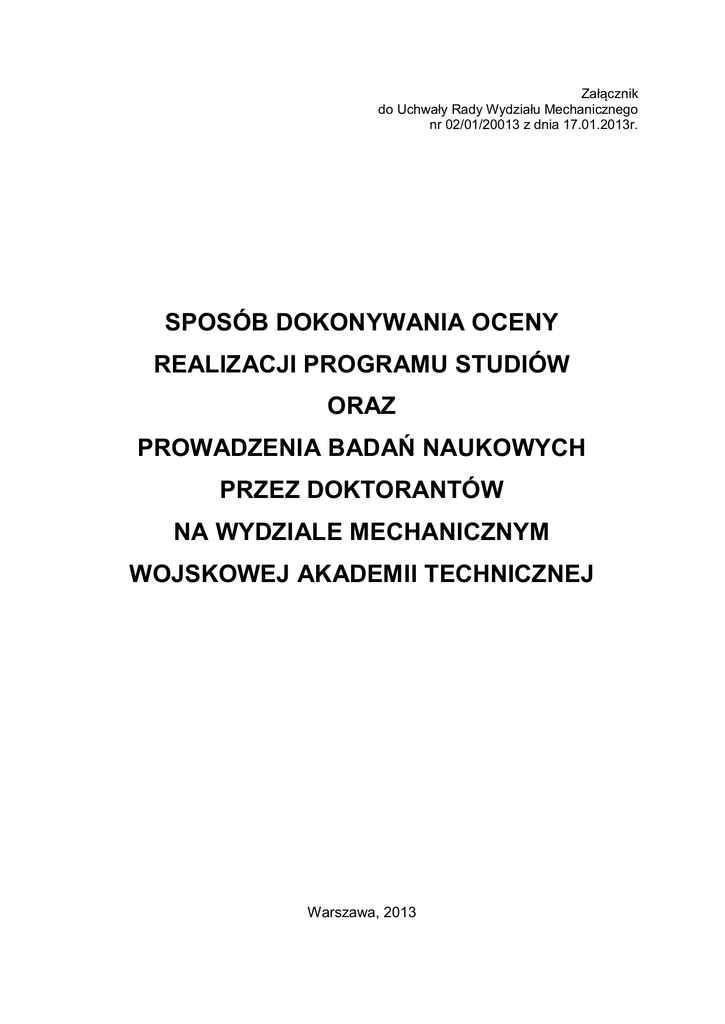 Za cznik do Uchwa y Rady Wydzia u Mechanicznego nr 02/01/20013 z dnia 17.01.2013r. SPOSÓB DOKONYWANIA OCENY REALIZACJI PROGRAMU STUDIÓW ORAZ PROWADZENIA BADA NAUKOWYCH PRZEZ DOKTORANTÓW NA WYDZIALE MECHANICZNYM WOJSKOWEJ AKADEMII TECHNICZNEJ Warszawa, 2013 1. Studia doktoranckie na Wydziale Mechanicznym WAT s realizowane wed ug planów i programu studiów, które uchwala Rada Wydzia u Mechanicznego. 2. Studia doktoranckie obejmuj : 3. 4. - Uczestniczenie w programowych (obowi zkowych i fakultatywnych) zaj ciach dydaktycznych oraz uzyskiwanie zalicze przedmiotów i innych rygorów zgodnie z planem studiów; - Realizacj projektu badawczego zgodnie z wcze niej opracowanym szczegó owym harmonogramem, stanowi cym podstaw do przygotowania rozprawy doktorskiej; - Przeprowadzenie okre lonej liczby godzin zaj dydaktycznych w formie praktyki zawodowej, w celu przygotowania do wykonywania zawodu nauczyciela akademickiego. Ocena realizacji zaj programowych jest dokonywana nast puj co: - Ka dy przedmiot uj ty w planie studiów podlega egzaminowi lub zaliczeniu. Okresem zaliczeniowym jest semestr, a warunkiem zaliczenia semestru jest uzyskanie przez doktoranta pozytywnych ocen z egzaminów i zalicze z przedmiotów realizowanych w semestrze – zgodnie z planem studiów. - Dodatkowym warunkiem zaliczenia semestru letniego jest przeprowadzenie w roku akademickim 10 do 90 godzin zaj dydaktycznych, z enie sprawozdania semestralnego z ich realizacji i uzyskanie pozytywnej oceny za ich przeprowadzenie. Ocena prowadzenia bada naukowych (realizacji projektu badawczego) przez doktoranta przebiega nast puj co: 4.1. G ównym celem studiów jest przygotowanie i obrona rozprawy doktorskiej, a rodkiem do tego celu jest realizacja projektu badawczego. 4.2. Temat projektu badawczego doktoranta i kieruj cego nim opiekuna naukowego ustala kierownik studiów doktoranckich zgodnie ze „Szczegó ow procedur zg aszania i wyboru tematu projektu badawczego na studiach doktoranckich realizowanych w WME WAT”. 4.3. Doktorant na pocz tku drugiego semestru studiów, w porozumieniu z opiekunem naukowym opracowuje szczegó owy harmonogram realizacji projektu badawczego, podaj c w nim przedsi wzi cia, kolejno , terminy i wyniki ich realizacji. Propozycj harmonogramu doktorant prezentuje na seminarium doktoranckim w trakcie drugiego semestru studiów. Ostateczny szczegó owy harmonogram realizacji projektu badawczego zatwierdza opiekun naukowy, uwzgl dniaj c uwagi i wnioski zg oszone w trakcie seminarium. Kopi harmonogramu podpisanego przez doktoranta i zatwierdzonego przez opiekuna naukowego doktorant dostarcza kierownikowi studiów przed rozpocz ciem sesji egzaminacyjnej drugiego semestru. 2 z 9 stron 4.4. Pocz wszy od drugiego semestru studiów doktorant przedstawia stan realizacji projektu badawczego w formie co najmniej jednej prezentacji w semestrze na seminarium doktoranckim. 4.5. Na koniec ka dego semestru, pocz wszy od drugiego, doktorant przedstawia pisemny raport (sprawozdanie) z realizacji projektu badawczego. Raport powinien by przedstawiony w formie prezentacji na seminarium doktoranckim. Raport przedstawiany na koniec semestru drugiego powinien dotyczy analizy stanu wiedzy w zakresie tematu projektu badawczego. Po wszcz ciu przewodu doktorskiego rol raportu spe nia rozprawa doktorska. 4.6. Opiekun naukowy dokonuje oceny raportu oraz prezentacji na seminarium doktoranckim, stosuj c skal ocen jak do egzaminów i zalicze . Jednym z warunków zaliczenia ka dego semestru (poza pierwszym) jest uzyskanie pozytywnej oceny z realizacji projektu badawczego wystawionej przez opiekuna naukowego. W przypadku wystawienia oceny niedostatecznej, kierownik studiów ustala dodatkowy termin oceny realizacji projektu badawczego, a w przypadku ponownego wystawienia oceny niedostatecznej kierownik studiów podejmuje decyzj o skre leniu doktoranta z listy doktorantów. 4.7. Od drugiego semestru studiów ka dy doktorant uczestniczy w obowi zkowych seminariach doktoranckich. Seminaria doktoranckie organizuje, pod koniec ka dego semestru, jednostka organizacyjna (instytut, katedra), w której doktorant realizuje projekt badawczy. 4.8. Seminaria doktoranckie maj form zebra naukowych, na których doktoranci prezentuj koncepcj projektu badawczego, stan jego zaawansowania (realizacji) i zgodno ze szczegó owym harmonogramem realizacji projektu badawczego. 4.9. W seminariach doktoranckich obowi zkowo bierze udzia opiekun naukowy doktoranta oraz mog bra udzia pracownicy naukowodydaktyczni i naukowi jednostki organizacyjnej, w której doktoranci realizuj swój projekt badawczy. Na seminaria doktoranckie jest zapraszany tak e kierownik studiów doktoranckich. Na seminarium przed wszcz ciem przewodu doktorskiego i zamykaj ce rozpraw doktorsk s zapraszani dodatkowo wszyscy cz onkowie Rady Wydzia u Mechanicznego z tytu em profesora i stopniem doktora habilitowanego. 4.10. Seminarium doktoranckie w danym semestrze podlega oddzielnemu zaliczeniu, którego dokonuje opiekun naukowy doktoranta. 4.11. Doktorant w porozumieniu z opiekunem naukowym jest zobowi zany do sformu owania tematu rozprawy doktorskiej i do pisemnego poinformowania o tym kierownika studiów, nie pó niej ni do ko ca pi tego semestru. 4.12. Temat rozprawy doktorskiej powinien pokrywa si z tematyk projektu badawczego realizowanego przez doktoranta. W przypadku niemo liwo ci sformu owania tematu rozprawy doktorskiej na podstawie realizacji projektu badawczego kierownik studiów mo e podj decyzj o skre leniu doktoranta z listy doktorantów lub, na pisemny wniosek 3 z 9 stron doktoranta, przed semestru studiów. termin sformu owania tematu do ko ca szóstego 4.13. Przed zako czeniem siódmego semestru studiów doktorant jest zobowi zany do przedstawienia Radzie Wydzia u Mechanicznego wniosku o wszcz cie przewodu doktorskiego. Przed z eniem wniosku doktorant musi uzyska pozytywn opini prezentacji tez swojej pracy i stopnia jej zaawansowania na seminarium zamykaj cym prac doktorsk . 4.14. 