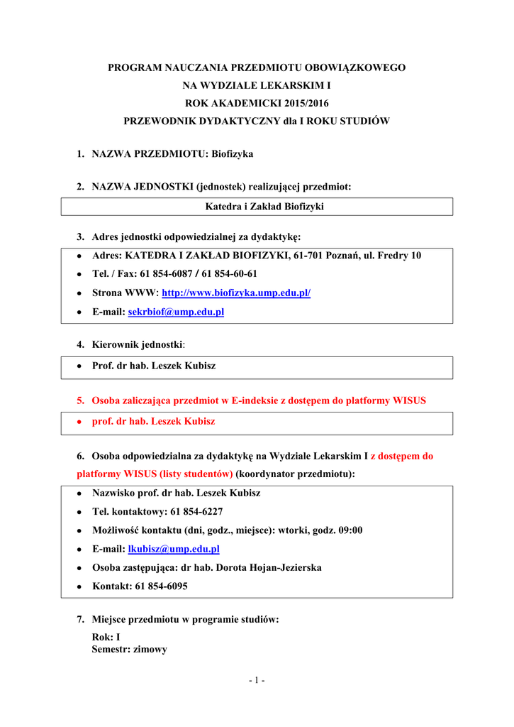 PROGRAM NAUCZANIA PRZEDMIOTU OBOWIĄZKOWEGO NA WYDZIALE LEKARSKIM I ROK AKADEMICKI 2015/2016 PRZEWODNIK DYDAKTYCZNY dla I ROKU STUDIÓW 1. NAZWA PRZEDMIOTU: Biofizyka 2. NAZWA JEDNOSTKI (jednostek) realizującej przedmiot: Katedra i Zakład Biofizyki 3. Adres jednostki odpowiedzialnej za dydaktykę: Adres: KATEDRA I ZAKŁAD BIOFIZYKI, 61-701 Poznań, ul. Fredry 10 Tel. / Fax: 61 854-6087 / 61 854-60-61 Strona WWW: http://www.biofizyka.ump.edu.pl/ E-mail: [email protected] 4. Kierownik jednostki: Prof. dr hab. Leszek Kubisz 5. Osoba zaliczająca przedmiot w E-indeksie z dostępem do platformy WISUS prof. dr hab. Leszek Kubisz 6. Osoba odpowiedzialna za dydaktykę na Wydziale Lekarskim I z dostępem do platformy WISUS (listy studentów) (koordynator przedmiotu): Nazwisko prof. dr hab. Leszek Kubisz Tel. kontaktowy: 61 854-6227 Możliwość kontaktu (dni, godz., miejsce): wtorki, godz. 09:00 E-mail: [email protected] Osoba zastępująca: dr hab. Dorota Hojan-Jezierska Kontakt: 61 854-6095 7. Miejsce przedmiotu w programie studiów: Rok: I Semestr: zimowy -1- 8. Liczba godzin ogółem: 55 liczba pkt. ECTS: 3 Katedra i Zakład Biofizyki Semestr zimowy liczba godzin Ćwiczenia W Ć S kategoria 10 45 B - Razem: 10 Jednostki uczestniczące w nauczaniu przedmiotu 45 B - 9. Zakres wiedzy (zgodnie z Rozporządzeniem Ministra Nauki i Szkolnictwa Wyższego z dnia 9 maja 2012 r. w sprawie standardów kształcenia dla kierunków Studiów: lekarskiego) B.W3. zna i rozumie pojęcia: rozpuszczalność, ciśnienie osmotyczne, izotonia, roztwory koloidalne i równowaga Gibbsa-Donnana; B.W5. zna prawa fizyczne opisujące przepływ cieczy oraz czynniki wpływające na opór naczyniowy przepływu krwi; B.W6. zna naturalne i sztuczne źródła promieniowania jonizującego oraz jego oddziaływanie z materią; B.W7. zna fizykochemiczne i molekularne podstawy działania narządów zmysłów; B.W8. zna fizyczne podstawy nieinwazyjnych metod obrazowania; B.W9. zna fizyczne podstawy wybranych technik terapeutycznych, w tym ultradźwięków i naświetlań; B.W11. opisuje budowę lipidów i polisacharydów oraz ich funkcje w strukturach komórkowych i pozakomórkowych; B.W24. zna podstawy pobudzenia i przewodzenia w układzie nerwowym a także fizjologię mięśni prążkowanych i gładkich oraz funkcje krwi; B.W25. zna czynność i mechanizmy regulacji wszystkich narządów i układów organizmu człowieka, w tym układu: krążenia, oddechowego, moczowego; B.W34. zna zasady prowadzenia badań naukowych, obserwacyjnych i doświadczalnych oraz badań in vitro służących rozwojowi medycyny; E.W38. zna podstawy teoretyczne i praktyczne diagnostyki laboratoryjnej; 10. Umiejętności (zgodnie z Rozporządzeniem Ministra Nauki i Szkolnictwa Wyższego z dnia 9 maja 2012 r. w sprawie standardów kształcenia dla kierunków Studiów: lekarskiego) A.U1. B.U1. B.U2. B.U3. B.U6. B.U7. obsługuje mikroskop optyczny – także w zakresie korzystania z immersji; wykorzystuje znajomość praw fizyki do wyjaśnienia wpływu czynników zewnętrznych, takich jak temperatura, przyspieszenie, ciśnienie, pole elektromagnetyczne oraz promieniowanie jonizujące, na organizm i jego elementy; ocenia szkodliwość dawki promieniowania jonizującego i stosuje się do zasad ochrony radiologicznej; oblicza stężenia molowe i procentowe związków oraz stężenia substancji w roztworach; przewiduje kierunek procesów biochemicznych; opisuje zmiany w funkcjonowaniu organizmu w sytuacji zaburzenia homeostazy, określa jego odpowiedź na ekspozycję na wysoką i niską temperaturę, utratę wody, -2- nagłą pionizację; B.U10. obsługuje proste przyrządy pomiarowe oraz ocenia dokładność wykonywanych pomiarów; B.U14. planuje i wykonuje proste badanie naukowe oraz interpretuje jego wyniki i wyciąga wnioski; C.U6. ocenia zagrożenia środowiskowe oraz posługuje się podstawowymi metodami pozwalającymi na wykrycie obecności czynników szkodliwych w biosferze; ??? D.U16. rozpoznaje własne ograniczenia, dokonuje samooceny deficytów i potrzeb edukacyjnych, planuje własną aktywność edukacyjną. 11. SYLABUS Biofizyka, jako nauka interdyscyplinarna rozwija się na pograniczu fizyki, chemii, matematyki, biologii i nauk medycznych. Przedmiotem jej zainteresowania są zjawiska zachodzące w układach biologicznych na różnych poziomach ich organizacji: od molekularnego, struktur nadmolekularnych, komórek i tkanek, poprzez narządy, układy narządów i organizmy, aż do populacji i biosfery. Do zagadnień badawczych biofizyki zalicza się wszystkie problemy biologii nauk medycznych, które obecnie można formułować z pozycji pojęć i praw fizyki. Biofizykę pojmuje się, jako podstawową naukę o procesach biologicznych, która bada fizyczne aspekty tych procesów. Nie można zaakceptować poglądu, który często rzutuje na dobór treści kształcenia z biofizyki, iż jej zadaniem jest badanie obiektów biologicznych metodami (przyrządami) fizycznymi. Aparatura fizyczna jest niezbędna do badania struktury obiektów biologicznych oraz zjawisk fizycznych leżących u podstaw procesów, które przebiegają w żywych organizmach. Dzięki niej uzyskuje się informacje umożliwiające opis tych procesów w kategoriach fizyki. W nauczaniu biofizyki na studiach medycznych przekazuje się jedynie ogólne zasady działania aparatury fizycznej i orientuje, co do zastosowań w urządzeniach diagnostycznych i terapeutycznych, z pominięciem szczegółów technicznych dotyczących budowy aparatów i urządzeń. W nauczaniu biofizyki kładzie się nacisk na opis funkcjonowania najważniejszych tkanek, narządów i układów organizmu człowieka i samego organizmu, jako całości. Ogranicza się formalizm matematyczny i podejście specjalistyczne na rzecz podkreślenia wartości poznawczej opanowanych treści i ich przydatności praktycznej dla lekarza. Program nauczania biofizyki jest mocno zintegrowany z programem fizjologii i programami wielu dyscyp