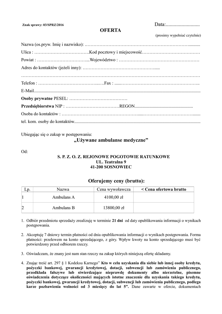 Data:.......................... Znak sprawy: 03/SPRZ/2016 OFERTA (prosimy wypełniać czytelnie) Nazwa (os.pryw. Imię i nazwisko): .…………………………………………………………….......... Ulica : ……………………………….Kod pocztowy i miejscowość………………………………… Powiat : ……………………………...Województwo : ……………………………………………… Adres do kontaktów (jeżeli inny): …………………………………………..... ………………………………………………………………………………………………………… Telefon : …………………………………..….Fax : ......…………………………………………….. E-Mail..................................................................................................................................................... Osoby prywatne PESEL: ………………………………… Przedsiębiorstwa NIP : ………………………………REGON.................................................... Osoba do kontaktów : …………………………………………….....……………………………....... tel. kom. osoby do kontaktów................................................................................................................. Ubiegając się o zakup w postępowaniu: „Używane ambulanse medyczne” Od: S. P. Z. O. Z. REJONOWE POGOTOWIE RATUNKOWE UL. Teatralna 9 41-200 SOSNOWIEC Oferujemy ceny (brutto): Lp. Nazwa Cena wywoławcza 1 Ambulans A 4100,00 zł 2 Ambulans B 13800,00 zł < Cena ofertowa brutto 1. Odbiór przedmiotu sprzedaży zrealizuję w terminie 21 dni od daty opublikowania informacji o wynikach postępowania. 2. Akceptuję 7 dniowy termin płatności od dnia opublikowania informacji o wynikach postępowania. Forma płatności: przelewem na konto sprzedającego, z góry. Wpływ kwoty na konto sprzedającego musi być potwierdzony przed odbiorem rzeczy. 3. Oświadczam, że znany jest nam stan rzeczy na zakup których niniejszą ofertę składamy. 4. Znając treść art. 297 § 1 Kodeksu Karnego” Kto w celu uzyskania dla siebie lub innej osoby kredytu, pożyczki bankowej, gwarancji kredytowej, dotacji, subwencji lub zamówienia publicznego, przedkłada fałszywe lub stwierdzające nieprawdę dokumenty albo nierzetelne, pisemne oświadczenia dotyczące okoliczności mających istotne znaczenie dla uzyskania takiego kredytu, pożyczki bankowej, gwarancji kredytowej, dotacji, subwencji lub zamówienia publicznego, podlega karze pozbawienia wolności od 3 miesięcy do lat 5”. Dane zawarte w ofercie, dokumentach i oświadczeniach są zgodne ze stanem faktycznym Załącznikami do niniejszej oferty są: (wymienić wszystkie załączniki) Nazwa dokumentu nr strony w ofercie ............................................................................................................................................. ............................................................................................................................................. ............................................................................................................................................. ............................................................................................................................................. ................................................................... Data i podpis osoby upoważnionej do składania oświadczeń woli w imieniu Wykonawcy