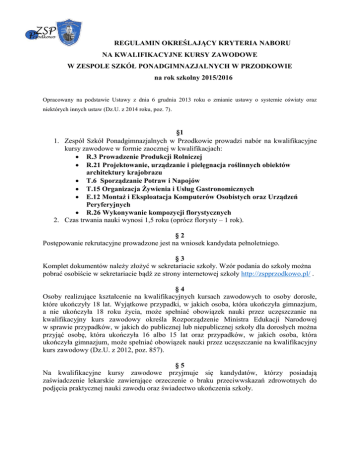 REGULAMIN OKREŚLAJĄCY KRYTERIA NABORU NA KWALIFIKACYJNE KURSY ZAWODOWE W ZESPOLE SZKÓŁ PONADGIMNAZJALNYCH W PRZODKOWIE na rok szkolny 2015/2016 Opracowany na podstawie Ustawy z dnia 6 grudnia 2013 roku o zmianie ustawy o systemie oświaty oraz niektórych innych ustaw (Dz.U. z 2014 roku, poz. 7). §1 1. Zespół Szkół Ponadgimnazjalnych w Przodkowie prowadzi nabór na kwalifikacyjne kursy zawodowe w formie zaocznej w kwalifikacjach: R.3 Prowadzenie Produkcji Rolniczej R.21 Projektowanie, urządzanie i pielęgnacja roślinnych obiektów architektury krajobrazu T.6 Sporządzanie Potraw i Napojów T.15 Organizacja Żywienia i Usług Gastronomicznych E.12 Montaż i Eksploatacja Komputerów Osobistych oraz Urządzeń Peryferyjnych R.26 Wykonywanie kompozycji florystycznych 2. Czas trwania nauki wynosi 1,5 roku (oprócz florysty – 1 rok). §2 Postępowanie rekrutacyjne prowadzone jest na wniosek kandydata pełnoletniego. §3 Komplet dokumentów należy złożyć w sekretariacie szkoły. Wzór podania do szkoły można pobrać osobiście w sekretariacie bądź ze strony internetowej szkoły http://zspprzodkowo.pl/ . §4 Osoby realizujące kształcenie na kwalifikacyjnych kursach zawodowych to osoby dorosłe, które ukończyły 18 lat. Wyjątkowe przypadki, w jakich osoba, która ukończyła gimnazjum, a nie ukończyła 18 roku życia, może spełniać obowiązek nauki przez uczęszczanie na kwalifikacyjny kurs zawodowy określa Rozporządzenie Ministra Edukacji Narodowej w sprawie przypadków, w jakich do publicznej lub niepublicznej szkoły dla dorosłych można przyjąć osobę, która ukończyła 16 albo 15 lat oraz przypadków, w jakich osoba, która ukończyła gimnazjum, może spełniać obowiązek nauki przez uczęszczanie na kwalifikacyjny kurs zawodowy (Dz.U. z 2012, poz. 857). §5 Na kwalifikacyjne kursy zawodowe przyjmuje się kandydatów, którzy posiadają zaświadczenie lekarskie zawierające orzeczenie o braku przeciwwskazań zdrowotnych do podjęcia praktycznej nauki zawodu oraz świadectwo ukończenia szkoły. §6 1. Kandydat ubiegający się o przyjęcie powinien złożyć następujące dokumenty: a) wypełnione podanie, b) świadectwo ukończenia szkoły, c) kserokopię dowodu osobistego, d) zaświadczenie lekarskie, e) 2 zdjęcia (podpisane), 2. Podania o przyjęcie na kwalifikacyjne kursy zawodowe składa się na bieżąco. §7 1. W przypadku większej liczby kandydatów spełniających warunki, o którym mowa w §5, niż liczba wolnych miejsc na dany kwalifikacyjny kurs zawodowy, na pierwszym etapie postępowania rekrutacyjnego przyjmuje się kandydatów, którzy nie posiadają żadnych kwalifikacji zawodowych. 2. Kandydaci, o których mowa w ust.1 składają oświadczenie o nieposiadaniu żadnych kwalifikacji zawodowych. §8 1. W przypadku większej liczby kandydatów spełniających kryterium, o którym mowa w §7 ust.1, niż liczba wolnych miejsc na dany kwalifikacyjny kurs zawodowy lub jeżeli szkoła nadal dysponuje wolnymi miejscami na dany kwalifikacyjny kurs zawodowy, na drugim etapie postępowania rekrutacyjnego w przypadku kandydata pełnoletniego są brane pod uwagę łącznie kryteria: a) wielodzietność rodziny kandydata, b) niepełnosprawność kandydata, c) niepełnosprawność dziecka kandydata, d) niepełnosprawność innej osoby bliskiej, nad którą kandydat sprawuje opiekę, e) samotne wychowywanie dziecka przez kandydata. 2. Kryteria, o których mowa w ust. 1, mają jednakową wartość. §9 W przypadku wystąpienia sytuacji, o której mowa w § 8 ust. 1 do wniosku o przyjęcie do szkoły dołącza się: a) oświadczenie o wielodzietności rodziny kandydata, b) orzeczenie o potrzebie kształcenia specjalnego wydane ze względu na niepełnosprawność, orzeczenie o niepełnosprawności lub o stopniu niepełnosprawności lub orzeczenie równoważne w rozumieniu przepisów ustawy z dnia 27 sierpnia 1997 r. o rehabilitacji zawodowej i społecznej oraz zatrudnianiu osób niepełnosprawnych (Dz. U. z 2011 r. Nr 127, poz. 721, z późn. zm.), c) prawomocny wyrok sądu rodzinnego orzekający rozwód lub separację lub akt zgonu oraz oświadczenie o samotnym wychowywaniu dziecka oraz niewychowywaniu żadnego dziecka wspólnie z jego rodzicem. § 10 W przypadku równorzędnych wyników uzyskanych na drugim etapie postępowania rekrutacyjnego lub jeżeli po zakończeniu tego etapu szkoła nadal dysponuje wolnymi miejscami na dany kwalifikacyjny kurs zawodowy, na trzecim etapie postępowania rekrutacyjnego przyjmuje się kandydatów według kolejności zgłoszeń. § 11 1. Termin składania dokumentów – 21.08.2015 rok. 2. Ogłoszenie listy kandydatów przyjętych do szkoły – 26.08.2015 roku. § 12 1. Ilość wolnych miejsc na każdą kwalifikację wynosi 20. 2. Jeżeli liczba kandydatów jest mniejsza niż liczba miejsc, Dyrektor Szkoły, za zgodą organu prowadzącego, wyznacza dodatkowy termin rekrutacji i przedłuża termin składania podań o przyjęcie na kwalifikacyjny kurs zawodowy w Zespole Szkół Ponadgimnazjalnych w Przodkowie do 15.09.2015 roku. § 13 Słuchacz po zdobyciu wybranej kwalifikacji może się dalej kształcić uzupełniając tylko tą kwalifikację, której jeszcze nie posiada. Jednocześnie uzupełniając wykształcenie średnie uzyskuje dyplom zawodowy dla wybranego zawodu w technikum. § 14 1. Postępowanie rekrutacyjne przeprowadza komisja rekrutacyjna powołana przez dyrektora szkoły. 2. Do zadań komisji rekrutacyjnej należy w szczególności: a) ustalenie wyników postępowania rekrutacyjnego i podanie ich do publicznej wiadomości, b) sporządzenie protokołu postępowania rekrutacyjnego. 3. Listy przyjętych umieszczane są na tablicy ogłoszeń w szkole. 1. 2. 3. 4. § 15 W terminie 7 dni od dnia podania do publicznej wiadomości listy kandydatów przyjętych i kandydatów nieprzyjętych, kandydat pełnoletni może wystąpić do komisji rekrutacyjnej z wnioskiem o sporządzenie uzasadnienia odmowy przyjęcia kand