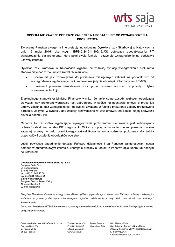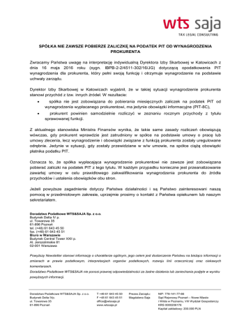 SPÓŁKA NIE ZAWSZE POBIERZE ZALICZKĘ NA PODATEK PIT OD WYNAGRODZENIA PROKURENTA Zwracamy Państwa uwagę na interpretację indywidualną Dyrektora Izby Skarbowej w Katowicach z dnia 16 maja 2016 roku (sygn. IBPB-2-2/4511-302/16/JG) dotyczącą opodatkowania PIT wynagrodzenia dla prokurenta, który pełni swoją funkcję i otrzymuje wynagrodzenie na podstawie uchwały zarządu. Dyrektor Izby Skarbowej w Katowicach wyjaśnił, że w takiej sytuacji wynagrodzenie prokurenta stanowi przychód z tzw. innych źródeł. W rezultacie: spółka nie jest zobowiązana do pobierania miesięcznych zaliczek na podatek PIT od wynagrodzenia wypłacanego prokurentowi, ma jedynie obowiązki informacyjne (PIT-8C), prokurent powinien samodzielnie rozliczyć w zeznaniu rocznym przychody z tytułu sprawowanej funkcji. Z aktualnego stanowiska Ministra Finansów wynika, że takie same zasady rozliczeń obowiązują wówczas, gdy prokurent wprawdzie jest zatrudniony w spółce na podstawie umowy o pracę lub umowy zlecenia, lecz wynagrodzenie i obowiązki związane z funkcją prokurenta zostały uregulowane odrębnie. Jedynie w sytuacji, gdy zostały przewidziane w w/w umowie, na spółce ciążą obowiązki płatnika podatku PIT. Oznacza to, że spółka wypłacająca wynagrodzenie prokurentowi nie zawsze jest zobowiązana pobierać zaliczki na podatek PIT z tego tytułu. W każdym przypadku konieczne jest przeanalizowanie zawartej umowy w celu prawidłowego zakwalifikowania wynagrodzenia prokurenta do źródła przychodów i ustalenia obowiązków obu stron. Jeżeli powyższe zagadnienie dotyczy Państwa działalności i są Państwo zainteresowani naszą pomocą w przedmiotowym zakresie, uprzejmie prosimy o kontakt z Państwa opiekunem lub naszym sekretariatem. Doradztwo Podatkowe WTS&SAJA Sp. z o.o. Budynek Delta IV p. ul. Towarowa 35 61-896 Poznań tel. (+48) 61 643 45 50 fax. (+48) 61 643 45 51 Biuro w Warszawie Budynek Central Tower XXII p. Al. Jerozolimskie 81 02-001 Warszawa Powyższy Newsletter stanowi informację o charakterze ogólnym, jego celem jest dostarczenie Państwu na bieżąco informacji o zmianach w prawie podatkowym, interpretacjach organów podatkowych, rozwoju linii orzeczniczej oraz ciekawych komentarzach. Doradztwo Podatkowe WTS&SAJA nie ponosi prawnej odpowiedzialności za żadne działania lub zaniechania podjęte w wyniku powyższych informacji. Doradztwo Podatkowe WTS&SAJA Sp. z o.o. Budynek Delta IVp. ul. Towarowa 35 61-896 Poznań T +48 61 643 45 50 F +48 61 643 45 51 [email protected] www.wtssaja.pl Prezes Zarządu: Magdalena Saja NIP: 778-141-77-66 Sąd Rejonowy Poznań – Nowe Miasto i Wilda w Poznaniu, VIII Wydział Gospodarczy KRS 0000206176 Kapitał zakładowy: 200.000 PLN