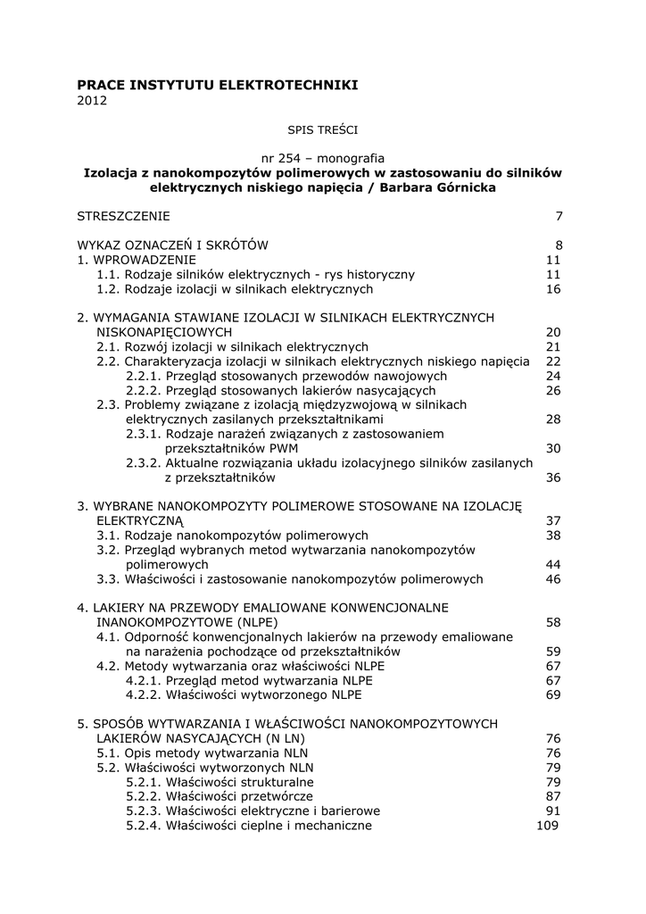 PRACE INSTYTUTU ELEKTROTECHNIKI 2012 SPIS TREŚCI nr 254 – monografia Izolacja z nanokompozytów polimerowych w zastosowaniu do silników elektrycznych niskiego napięcia / Barbara Górnicka STRESZCZENIE WYKAZ OZNACZEŃ I SKRÓTÓW 1. WPROWADZENIE 1.1. Rodzaje silników elektrycznych - rys historyczny 1.2. Rodzaje izolacji w silnikach elektrycznych 2. WYMAGANIA STAWIANE IZOLACJI W SILNIKACH ELEKTRYCZNYCH NISKONAPIĘCIOWYCH 2.1. Rozwój izolacji w silnikach elektrycznych 2.2. Charakteryzacja izolacji w silnikach elektrycznych niskiego napięcia 2.2.1. Przegląd stosowanych przewodów nawojowych 2.2.2. Przegląd stosowanych lakierów nasycających 2.3. Problemy związane z izolacją międzyzwojową w silnikach elektrycznych zasilanych przekształtnikami 2.3.1. Rodzaje narażeń związanych z zastosowaniem przekształtników PWM 2.3.2. Aktualne rozwiązania układu izolacyjnego silników zasilanych z przekształtników 3. WYBRANE NANOKOMPOZYTY POLIMEROWE STOSOWANE NA IZOLACJĘ ELEKTRYCZNĄ 3.1. Rodzaje nanokompozytów polimerowych 3.2. Przegląd wybranych metod wytwarzania nanokompozytów polimerowych 3.3. Właściwości i zastosowanie nanokompozytów polimerowych 4. LAKIERY NA PRZEWODY EMALIOWANE KONWENCJONALNE INANOKOMPOZYTOWE (NLPE) 4.1. Odporność konwencjonalnych lakierów na przewody emaliowane na narażenia pochodzące od przekształtników 4.2. Metody wytwarzania oraz właściwości NLPE 4.2.1. Przegląd metod wytwarzania NLPE 4.2.2. Właściwości wytworzonego NLPE 5. SPOSÓB WYTWARZANIA I WŁAŚCIWOŚCI NANOKOMPOZYTOWYCH LAKIERÓW NASYCAJĄCYCH (N LN) 5.1. Opis metody wytwarzania NLN 5.2. Właściwości wytworzonych NLN 5.2.1. Właściwości strukturalne 5.2.2. Właściwości przetwórcze 5.2.3. Właściwości elektryczne i barierowe 5.2.4. Właściwości cieplne i mechaniczne 7 8 11 11 16 20 21 22 24 26 28 30 36 37 38 44 46 58 59 67 67 69 76 76 79 79 87 91 109 5.3. Kompleksowa analiza właściwości wytworzonych NLN 112 6. PODSUMOWANIE 116 7. LITERATURA 119 nr 255 7 19 29 37 45 53 67 79 93 109 125 135 145 Modelowanie zjawiska spadku sprawności dla dużych gęstości prądów w diodach elektroluminescencyjnych z azotków / T. Cegielski Modeling of efficiency droop effect in GaN LEDS Zastosowanie spektrometrii absorpcji atomowej w monitoringu środowiska na przykładzie porównawczej analizy zawartości pierwiastków w tkankach lisa rudego / M. Długaszek, K. Kopczyński Application of atomic absorption spectrometry in environmental monitoring based on the comparative analysis of element contents in red fox tissues Badania nad zastosowaniem warstw tlenkowych oraz nowych sensybilizatorów w barwnikowych ogniwach słonecznych / K. Jurek, J. Kabatc Study on application of thin oxide layers and new sensitizers in dye solar cells Porównanie efektywności barwnikowych układów fotoinicjujących działających poprzez mechanizmy fotoredukujący i fotoredukującofotoutleniający / J. Kabatc, K. Jurek, E. Szynwelska The comparison of the photoinitiating efficeincy of dyeing photoinitiating systems acting via photoreducible and parallel series mechanism Aspekty metrologiczne stosowania normy PN-EN 62471 „Bezpieczeństwo fotobiologiczne lamp i systemów lampowych” / J. Pietrzykowski Metrological aspects of application of standard PN-EN 62471 Photobiological safety of lamps and lamp systems Zmiany w wymaganiach znowelizowanej europejskiej normy oświetleniowej / A. Pawlak Changes in the requirements of the amended European lighting standard Zasady wykonywania pomiarów promieniowania optycznego na stanowiskach pracy / A. Pawlak Principles of measurement of optical radiation at work places Rozkład błędów przy projektowaniu pośredniego oświetlenia elektrycznego za pomocą opraw kwadratowych / A. Pawlak, K. Zaremba The distribution of errors in the design of indirect lighting with square luminaires Zastosowanie promieniowania ultrafioletowego do rozkładu barwników w roztworach wodnych / J. Perkowski, M. Szadkowska-Nicze, K. Blus, P. Wroński Application of ultrafiolet irradiation to the decomposition of dyes in aqueous solutions Nowe metody oceny barierowości materiałów przeznaczonych na odzież chroniącą przed szkodliwym sztucznym promieniowaniem nadfioletowym / G. Owczarek, G. Bartkowiak, A. Wolska, G. Gralewicz New methods to access barrier properties of textile materials for clothes against harmful artificial UV radiation Zalecenia norm międzynarodowych dotyczące pomiarów parametrów fotometrycznych materiałów fosforescencyjnych / G. Szajna Requirements of standards in part related to measurements of the phosphorescent materials Zanieczyszczenie światłem / P. Michałek Light pollution Laser Nd:YAG generujący na długości fali 1,32 urn / R. Ostrowski, A. Cywiński Generation at 1.32 urn in Nd:YAG laser 161 175 197 201 213 225 235 251 259 277 289 297 325 335 Analiza porównawcza parametrów fotometrycznych i elektrycznych bezkierunkowych źródeł światła do użytku domowego / M. Zalesińska The evaluation of photometric and electric parameters of non-directional light sources for household use Analiza widm spektroskopii emisyjnej za pomocą wielowymiarowych metod statystycznych / W. Skrzeczanowski, A. Antonik Analysis of emission spectra using multivariate statistic methods Wzorcowanie kolorymetrów trójchromatycznych / D. Sobótko Calibration of tristmulus colorimeters Zmiany transmisji promieniowania optycznego przez soczewki wewnątrzgałkowe eksplantowane z powodu zjawiska glisteningu / G. Owczarek, P. Jurkowski Changes of spectral transmittance of optical radiation through interoculars lensess explanted from the eye due to glistening phenoma Układy zasilaczy diod LED umożliwiające regulację strumienia świetlnego / L. Grodzki LED driving circuits for luminous flux control Zastosowanie światła w kontroli wzrostu i rozwoju roślin ozdobnych / A. Woźny Use of light to control the growth and morphogenesis of ornamental plants Źródła promieniowania 