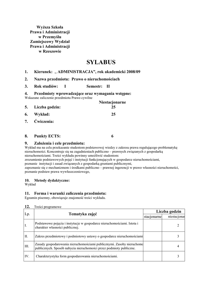 WyŜsza Szkoła Prawa i Administracji w Przemyślu Zamiejscowy Wydział Prawa i Administracji w Rzeszowie SYLABUS 1. Kierunek: „ ADMINISTRACJA”, rok akademicki 2008/09 2. Nazwa przedmiotu: Prawo o nieruchomościach 3. Rok studiów: 4. Przedmioty wprowadzające oraz wymagania wstępne: I Semestr: II Wskazane zaliczenie przedmiotu Prawo cywilne Niestacjonarne 25 5. Liczba godzin: 6. Wykład: 7. Ćwiczenia: 8. Punkty ECTS: 9. ZałoŜenia i cele przedmiotu: 25 6 Wykład ma na celu przekazanie studentom podstawowej wiedzy z zakresu prawa regulującego problematykę nieruchomości. Koncentruje się na zagadnieniach publiczno – prawnych związanych z gospodarką nieruchomościami. Treści wykładu powinny umoŜliwić studentom: zrozumienie podstawowych pojęć i instytucji funkcjonujących w gospodarce nieruchomościami, poznanie instytucji i zasad związanych z gospodarką gruntami publicznymi, zapoznanie się z mechanizmem i środkami publiczno – prawnej ingerencji w prawo własności nieruchomości, poznanie podstaw prawa wywłaszczeniowego, 10. Metody dydaktyczne: Wykład 11. Forma i warunki zaliczenia przedmiotu: Egzamin pisemny, obowiązuje znajomość treści wykładu. 12. Lp. Treści programowe Tematyka zajęć Liczba godzin stacjonarne niestacjonarne I. Podstawowe pojęcia i instytucje w gospodarce nieruchomościami. Istota i charakter własności publicznej. 2 II. Zakres przedmiotowy i podmiotowy ustawy o gospodarce nieruchomościami 3 III. Zasady gospodarowania nieruchomościami publicznymi. Zasoby nieruchomoś publicznych. Sposób nabycia nieruchomości przez podmioty publiczne. 4 IV. Charakterystyka form gospodarowania nieruchomościami. 3 V. Publiczno – prawne ograniczenia w wykonywaniu prawa własności nieruchomości. Podział, scalanie nieruchomości . Opłata adiacencka. 6 VI. Zasady i tryb wywłaszczania nieruchomości. Wywłaszczenia specjalne. Zwrot nieruchomości wywłaszczonych. 5 VII. Działalność zawodowa w dziedzinie gospodarowania nieruchomościami. 2 13. Literatura podstawowa: E. Gniewek, Obrót nieruchomościami skarbowymi i komunalnymi, Zakamycze 1999. J. Szachułowicz, Własność publiczna, Warszawa 2000. J. Szachułowicz, M. Krassowska, A. Łukaszewska, Gospodarka nieruchomościami, Warszawa 1999 i nast. wyd.. T. Woś, Wywłaszczenie nieruchomości i ich zwrot, Warszawa 2007 Z. Czarnik, Prawo o nieruchomościach. Wybrane zagadnienia, Przemyśl 2003. 14. Literatura uzupełniająca: S. Rudnicki, Nieruchomości, Warszawa 2008. Z. Truszkiewicz, UŜytkowanie wieczyste, Warszawa 2007. 15. Nazwisko osoby prowadzącej zajęcia: - wykład: prof. nadzw. dr hab. Zbigniew Czarnik
