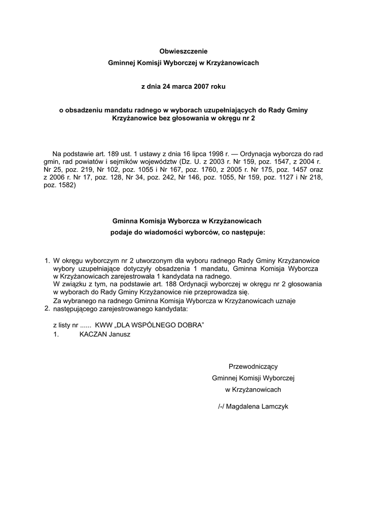 Obwieszczenie Gminnej Komisji Wyborczej w Krzyżanowicach z dnia 24 marca 2007 roku o obsadzeniu mandatu radnego w wyborach uzupełniających do Rady Gminy Krzyżanowice bez głosowania w okręgu nr 2 Na podstawie art. 189 ust. 1 ustawy z dnia 16 lipca 1998 r. — Ordynacja wyborcza do rad gmin, rad powiatów i sejmików województw (Dz. U. z 2003 r. Nr 159, poz. 1547, z 2004 r. Nr 25, poz. 219, Nr 102, poz. 1055 i Nr 167, poz. 1760, z 2005 r. Nr 175, poz. 1457 oraz z 2006 r. Nr 17, poz. 128, Nr 34, poz. 242, Nr 146, poz. 1055, Nr 159, poz. 1127 i Nr 218, poz. 1582) Gminna Komisja Wyborcza w Krzyżanowicach podaje do wiadomości wyborców, co następuje: 1. W okręgu wyborczym nr 2 utworzonym dla wyboru radnego Rady Gminy Krzyżanowice wybory uzupełniające dotyczyły obsadzenia 1 mandatu, Gminna Komisja Wyborcza w Krzyżanowicach zarejestrowała 1 kandydata na radnego. W związku z tym, na podstawie art. 188 Ordynacji wyborczej w okręgu nr 2 głosowania w wyborach do Rady Gminy Krzyżanowice nie przeprowadza się. Za wybranego na radnego Gminna Komisja Wyborcza w Krzyżanowicach uznaje 2. następującego zarejestrowanego kandydata: z listy nr ...... KWW „DLA WSPÓLNEGO DOBRA” 1. KACZAN Janusz Przewodniczący Gminnej Komisji Wyborczej w Krzyżanowicach /-/ Magdalena Lamczyk