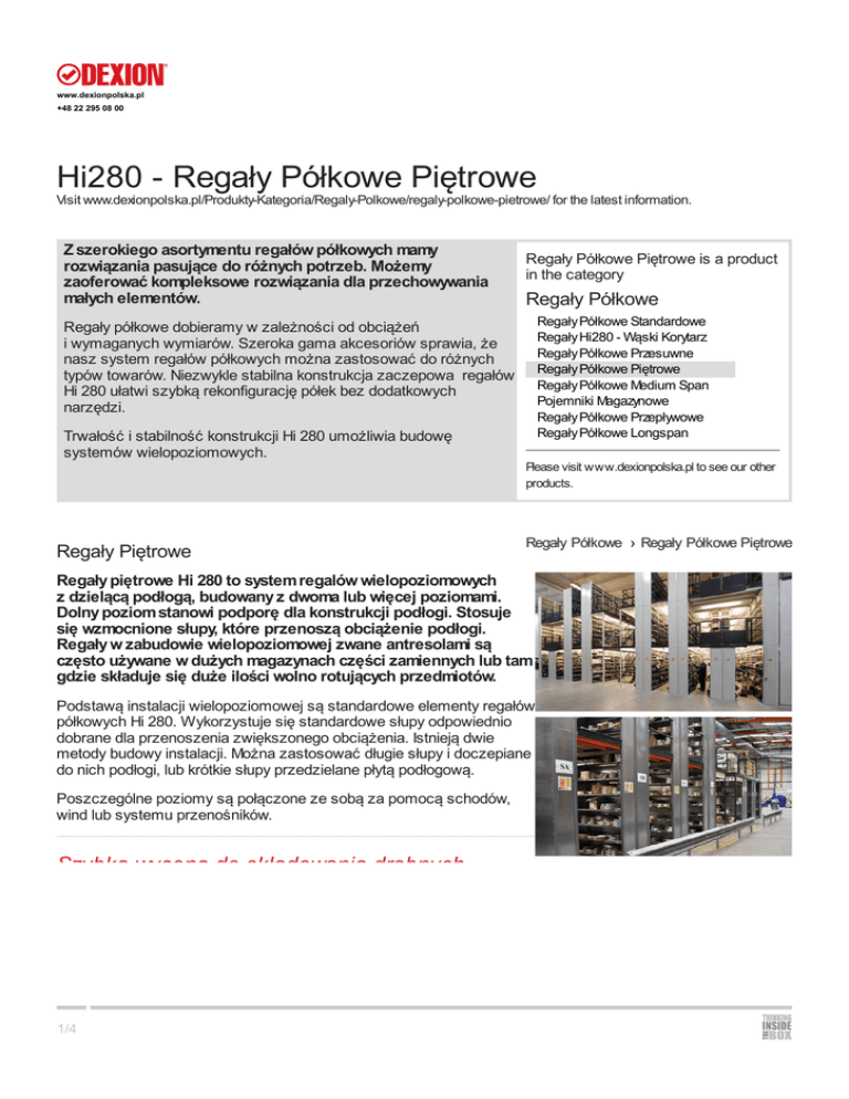 www.dexionpolska.pl +48 22 295 08 00 Hi280 Regały Półkowe Piętrowe Visit www.dexionpolska.pl/Produkty-Kategoria/Regaly-Polkowe/regaly-polkowe-pietrowe/ for the latest information. Z szerokiego asortymentu regałów półkowych mamy rozwiązania pasujące do różnych potrzeb. Możemy zaoferować kompleksowe rozwiązania dla przechowywania małych elementów. Regały Półkowe Piętrowe is a product in the category Regały Półkowe Regały Półkowe Standardowe Regały Hi280 - Wąski Korytarz Regały Półkowe Przesuwne Regały Półkowe Piętrowe Regały Półkowe Medium Span Pojemniki Magazynowe Regały Półkowe Przepływowe Regały Półkowe Longspan Regały półkowe dobieramy w zależności od obciążeń i wymaganych wymiarów. Szeroka gama akcesoriów sprawia, że nasz system regałów półkowych można zastosować do różnych typów towarów. Niezwykle stabilna konstrukcja zaczepowa regałów Hi 280 ułatwi szybką rekonfigurację półek bez dodatkowych narzędzi. Trwałość i stabilność konstrukcji Hi 280 umożliwia budowę systemów wielopoziomowych. Please visit www.dexionpolska.pl to see our other products. Regały Półkowe › Regały Półkowe Piętrowe > Regały Piętrowe Regały piętrowe Hi 280 to system regalów wielopoziomowych z dzielącą podłogą, budowany z dwoma lub więcej poziomami. Dolny poziom stanowi podporę dla konstrukcji podłogi. Stosuje się wzmocnione słupy, które przenoszą obciążenie podłogi. Regały w zabudowie wielopoziomowej zwane antresolami są często używane w dużych magazynach części zamiennych lub tam gdzie składuje się duże ilości wolno rotujących przedmiotów. Podstawą instalacji wielopoziomowej są standardowe elementy regałów półkowych Hi 280. Wykorzystuje się standardowe słupy odpowiednio dobrane dla przenoszenia zwiększonego obciążenia. Istnieją dwie metody budowy instalacji. Można zastosować długie słupy i doczepiane do nich podłogi, lub krótkie słupy przedzielane płytą podłogową. Poszczególne poziomy są połączone ze sobą za pomocą schodów, wind lub systemu przenośników. Szybka wycena do składowania drobnych 1/4 www.dexionpolska.pl +48 22 295 08 00 Szybka wycena do składowania drobnych elementów » Opis Idea systemu oparta jest na dobrze znanych regałach półkowych Hi 280 w zabudowie wielopoziomowej przedzielonych konstrukcją podłogi. Budowa instalacji wymaga zastosowania elementów o dużej indywidualnej nośności umożliwiających aranżację magazynu w sposób optymalny. Pełna nośność systemu jest wykorzystywana na składowanie. Produkty wolno rotujące składowane są na najwyższych półkach podczas gdy szybko rotujące na poziomach najniższych. Regały piętrowe stosuje się w wielu firmach jako system optymalizujący wykorzystanie różnych typów magazynów gdzie znajdują one wielorakie zastosowania. Specyfikacja 2/4 www.dexionpolska.pl +48 22 295 08 00 Specyfikacja Regały Półkowe › Regały Półkowe Piętrowe Regały piętrowe wymagają bardzo szczegółowego projektu, w którym uwzględnia się całkowite obciążenie system. Z tego powodu każda instalacja jest zawsze projektowana indywidualnie w celu zapewnienia pełnego bezpieczeństwa. Poszczególne elementy są standardowymi elementami regałów półkowych Hi 280. Ze względu na specyfikę instalacji i konieczność przenoszenia większych obciążeń, cała instalacja jest dodatkowo stabilizowana za pomocą stężeń, w ilościach dobieranych indywidualnie w zależności od wysokości. Wymiary Wysokość do 15000 mm. Standardowo stosuje się dwa lub trzy poziomy wliczając parter. Nie mniej dostarczaliśmy również czteropoziomowe instalacje. Wielkość Zależy jedynie od potrzeb i wielkości budynku. Obciążenie Obciążenie wszystkich półek może być takie samo i wynosi do ok 400 kg. Jednak całkowite obciążenie instalacji musi być zawsze indywidualnie dobrane i sprawdzone. 3/4 > www.dexionpolska.pl +48 22 295 08 00 Akcesoria Hi280 - Standard 4/4 Półka Hi280 Podziałka Służy do przechowywania wszelkiego rodzaju towarów i przedmiotów, tworząc dodatkowe poziomy w sekcji regału. Do pionowego składowania towarów np. długich rur. Pozwala na szybki i bezpośredni dostęp do towarów. Podziałka Półki Podpórka U Służy do przechowywania przedmiotów oddzielne i tworzenia mniejszych lokalizacji na półkach. Dzieli sekcję na przedziały. Belka Specjalna Taca Wysuwana Do składowania dużej wielkości towarów w ekonomiczny, sposób bez konieczności montażu dodatkowych połek. Stosowana jako biurko, stół roboczy lub do czasowego składowania mniejszych towarów. Szuflada Wysuwana Zestaw szuflad Przechowywanie drobnych towarów lub produktów. Tu, w połączeniu z małymi pojemnikami z tworzyw sztucznych. Szuflada pełnej szerokości lub moduł podzielony na mniejsze szuflady. Zestaw Drzwi Osłona Regału Zestaw drzwi może stanowić odrębną szafę, lub zamykać jedną sekcję w pełnej lub częściowej wysokości Chroni bok regału przed uderzeniami. Cokół Podstawy Pojemniki Magazynowe Cokół podstawy stosowany jest do zakrycia odstępu między podłogą, a najniżej położoną półką. Porządkowanie składowania drobnych przedmiotów. Więcej.