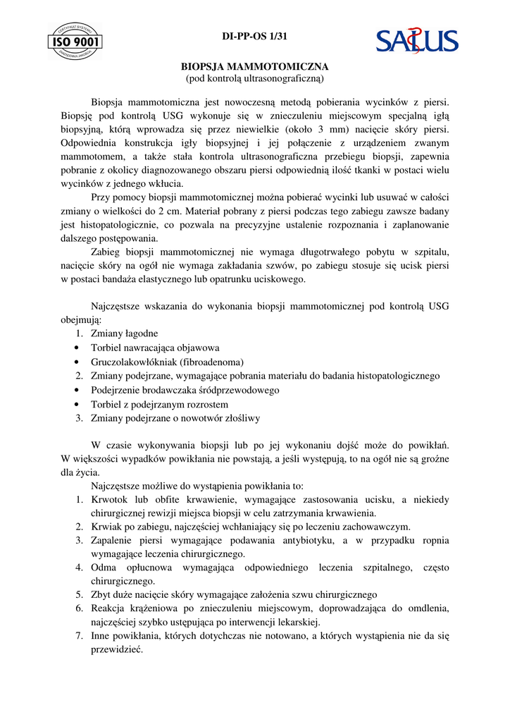 DI-PP-OS 1/31 BIOPSJA MAMMOTOMICZNA (pod kontrolą ultrasonograficzną) Biopsja mammotomiczna jest nowoczesną metodą pobierania wycinków z piersi. Biopsję pod kontrolą USG wykonuje się w znieczuleniu miejscowym specjalną igłą biopsyjną, którą wprowadza się przez niewielkie (około 3 mm) nacięcie skóry piersi. Odpowiednia konstrukcja igły biopsyjnej i jej połączenie z urządzeniem zwanym mammotomem, a także stała kontrola ultrasonograficzna przebiegu biopsji, zapewnia pobranie z okolicy diagnozowanego obszaru piersi odpowiednią ilość tkanki w postaci wielu wycinków z jednego wkłucia. Przy pomocy biopsji mammotomicznej można pobierać wycinki lub usuwać w całości zmiany o wielkości do 2 cm. Materiał pobrany z piersi podczas tego zabiegu zawsze badany jest histopatologicznie, co pozwala na precyzyjne ustalenie rozpoznania i zaplanowanie dalszego postępowania. Zabieg biopsji mammotomicznej nie wymaga długotrwałego pobytu w szpitalu, nacięcie skóry na ogół nie wymaga zakładania szwów, po zabiegu stosuje się ucisk piersi w postaci bandaża elastycznego lub opatrunku uciskowego. Najczęstsze wskazania do wykonania biopsji mammotomicznej pod kontrolą USG obejmują: 1. Zmiany łagodne • Torbiel nawracająca objawowa • Gruczolakowłókniak (fibroadenoma) 2. Zmiany podejrzane, wymagające pobrania materiału do badania histopatologicznego • Podejrzenie brodawczaka śródprzewodowego • Torbiel z podejrzanym rozrostem 3. Zmiany podejrzane o nowotwór złośliwy W czasie wykonywania biopsji lub po jej wykonaniu dojść może do powikłań. W większości wypadków powikłania nie powstają, a jeśli występują, to na ogół nie są groźne dla życia. Najczęstsze możliwe do wystąpienia powikłania to: 1. Krwotok lub obfite krwawienie, wymagające zastosowania ucisku, a niekiedy chirurgicznej rewizji miejsca biopsji w celu zatrzymania krwawienia. 2. Krwiak po zabiegu, najczęściej wchłaniający się po leczeniu zachowawczym. 3. Zapalenie piersi wymagające podawania antybiotyku, a w przypadku ropnia wymagające leczenia chirurgicznego. 4. Odma opłucnowa wymagająca odpowiedniego leczenia szpitalnego, często chirurgicznego. 5. Zbyt duże nacięcie skóry wymagające założenia szwu chirurgicznego 6. Reakcja krążeniowa po znieczuleniu miejscowym, doprowadzająca do omdlenia, najczęściej szybko ustępująca po interwencji lekarskiej. 7. Inne powikłania, których dotychczas nie notowano, a których wystąpienia nie da się przewidzieć.
